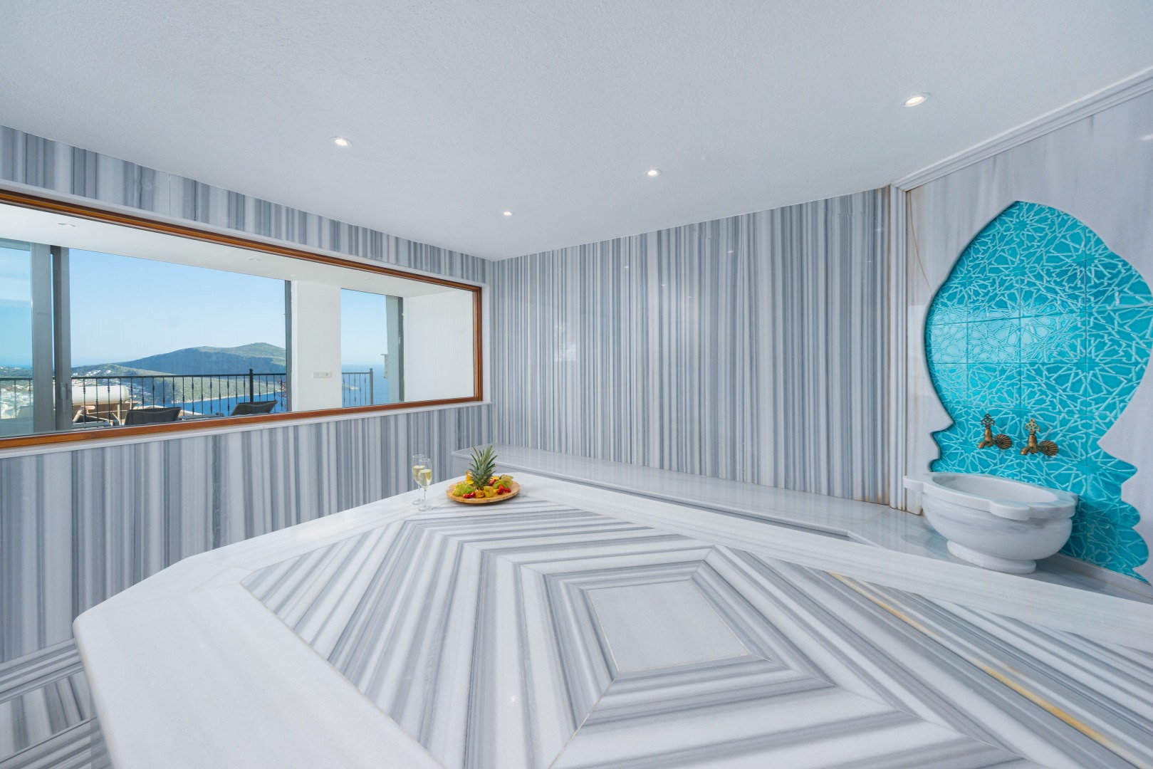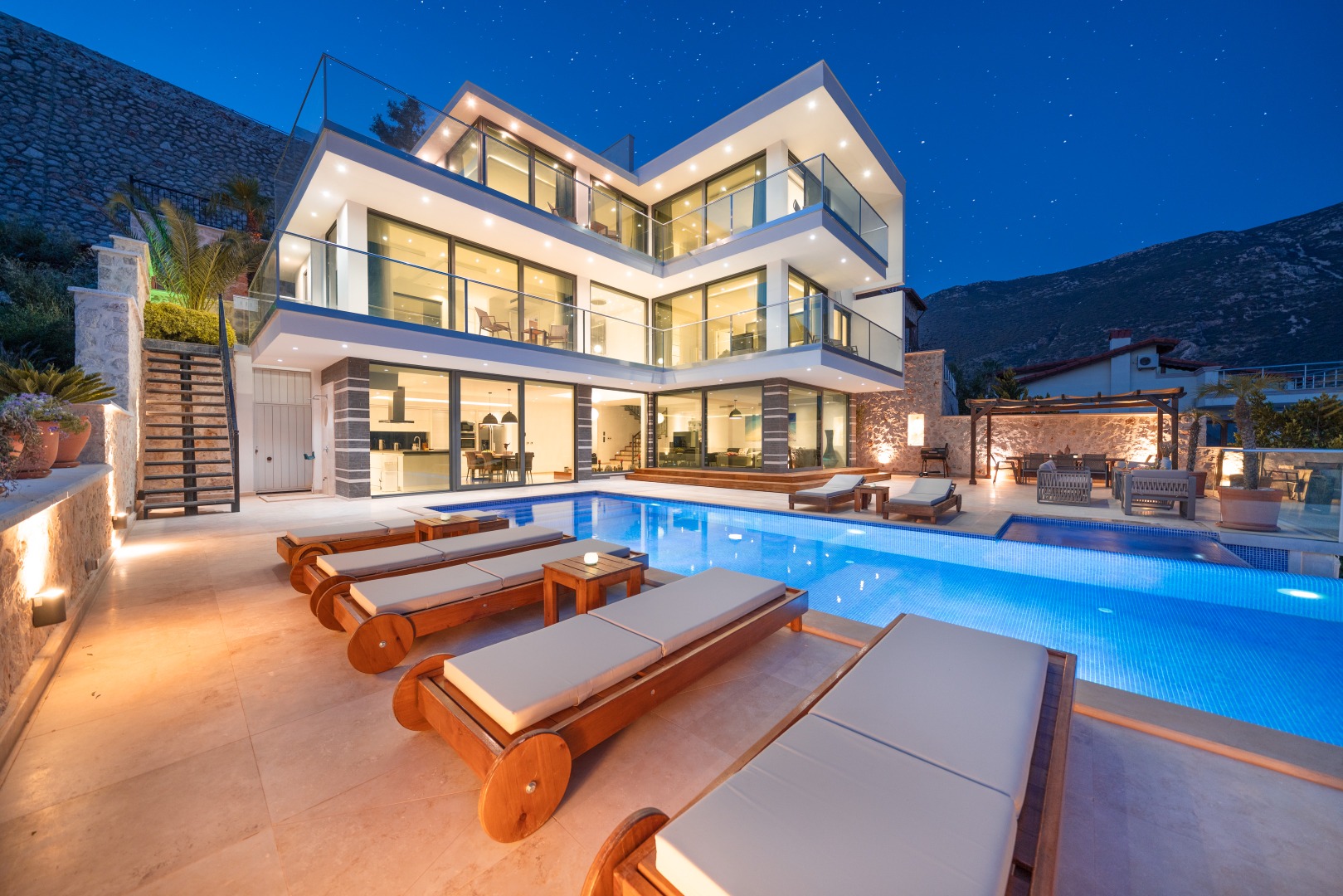 Villa Aslan, located in Ortaalan, Kalkan, offers a luxurious accommodation experience with a capacity for 8 guests, featuring a jacuzzi, Turkish bath, and sauna. With its spacious garden and private swimming pool, you can enjoy a peaceful and entertaining holiday. Ideal for families and groups of friends, this villa will allow you to create unforgettable memories amidst the enchanting nature of Kalkan.