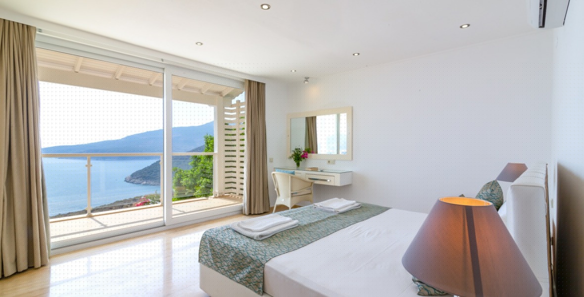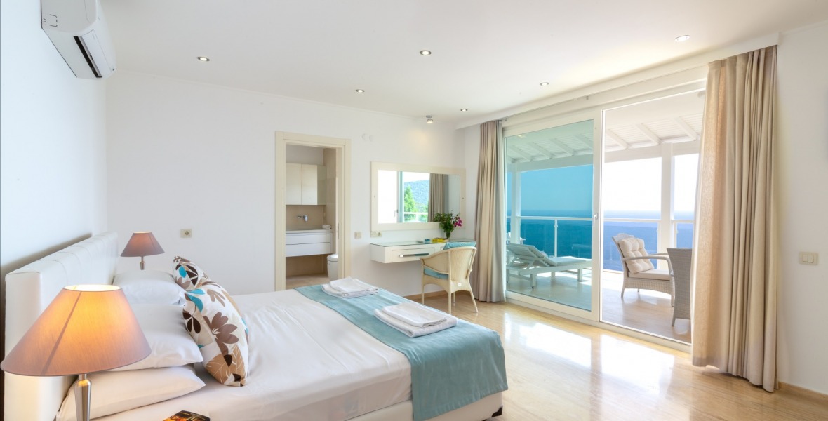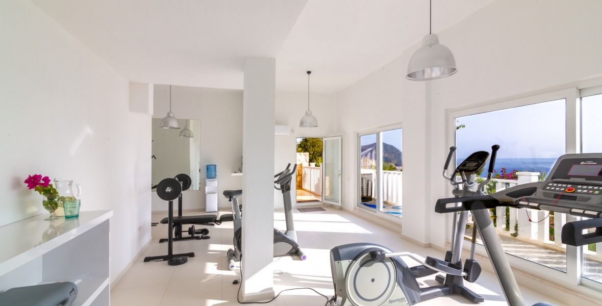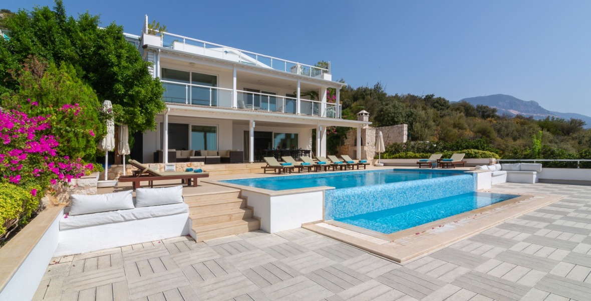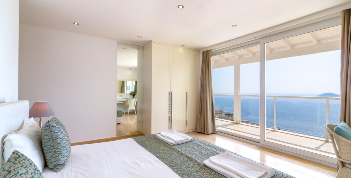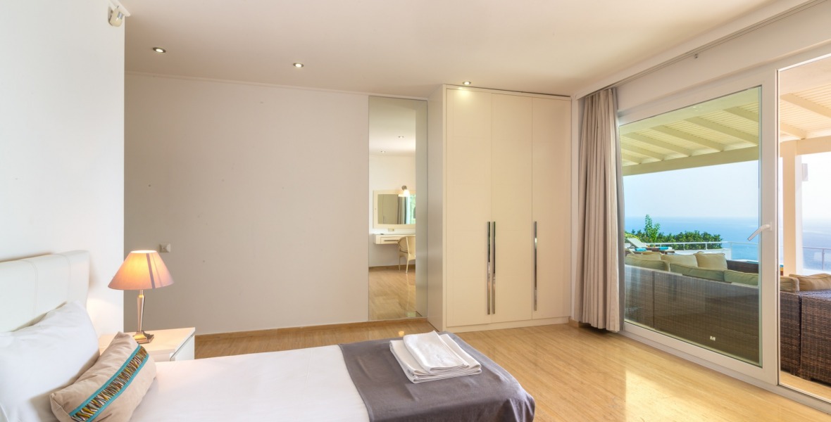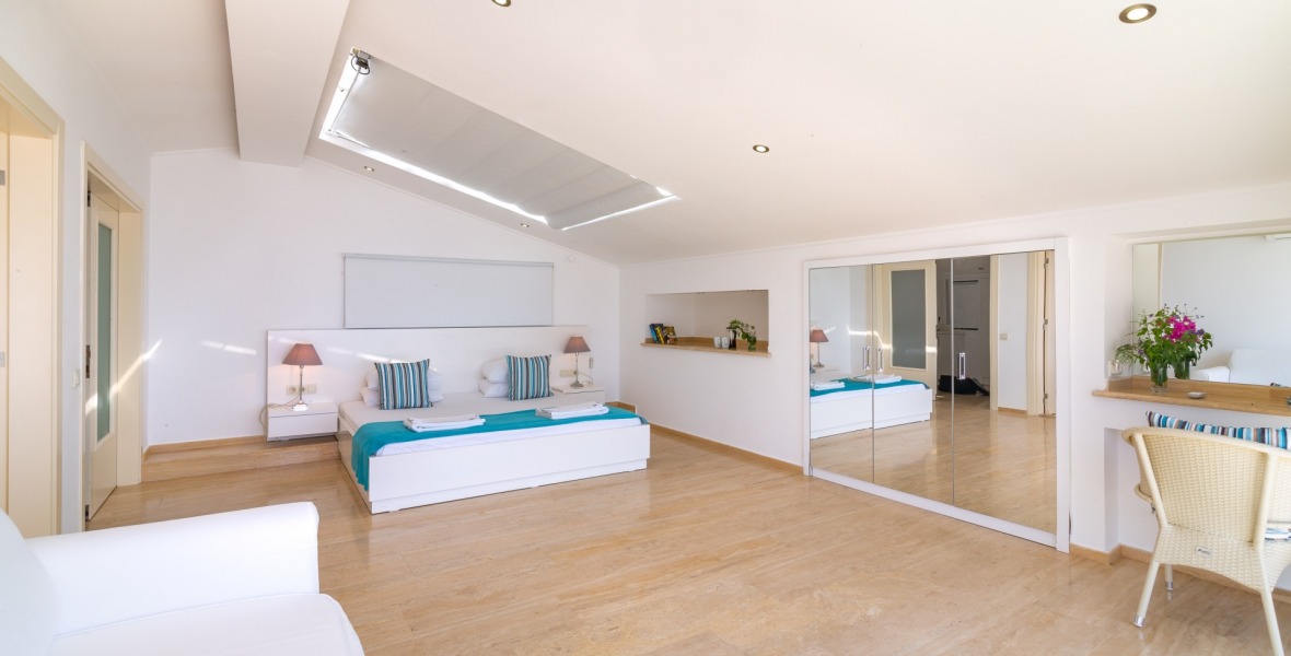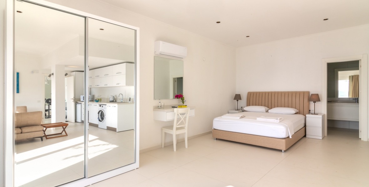 It is a beautiful house positioned on the hillside overlooking Kalamar Bay. This stunning 5/6 bedroom, 5/6 bathroom house enjoys breath taking uninterrupted views across the bay to the islands. The villa is situated approximately a 20 minute walk from the centre of town and just a 5 minute down hill stroll to the sea and the nearest beach club with it’s beautiful clear sea for swimming, it’s restaurant, bar and water sports facilities.