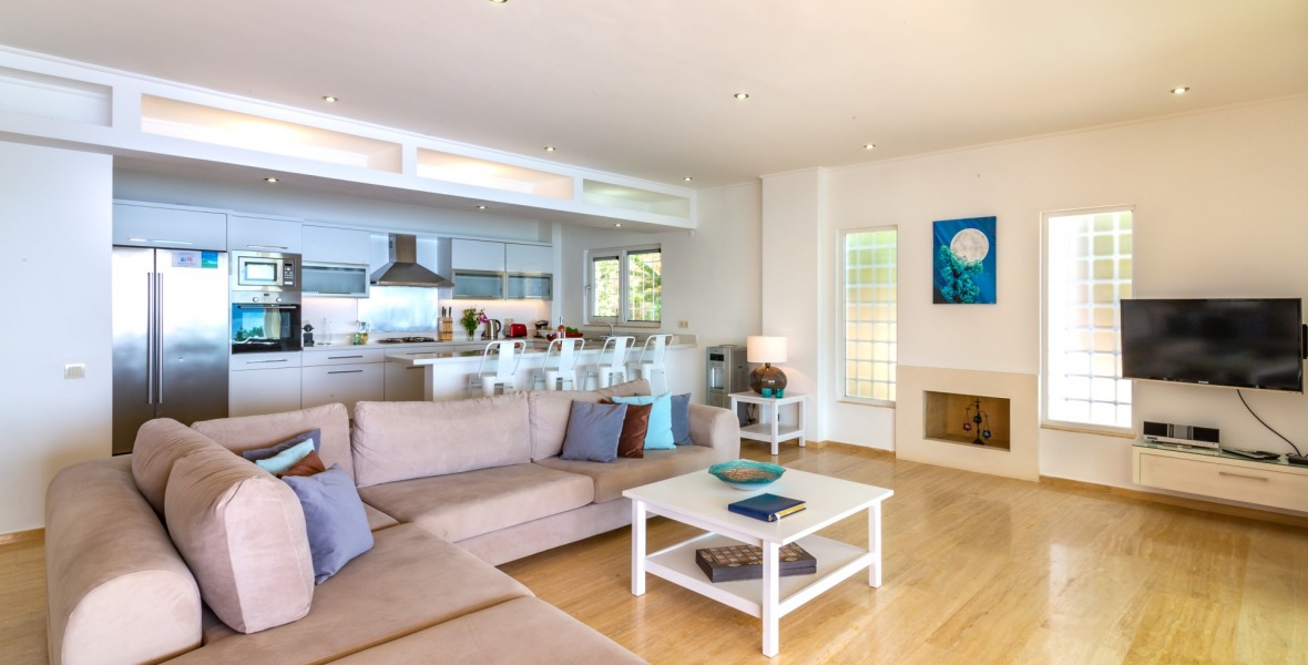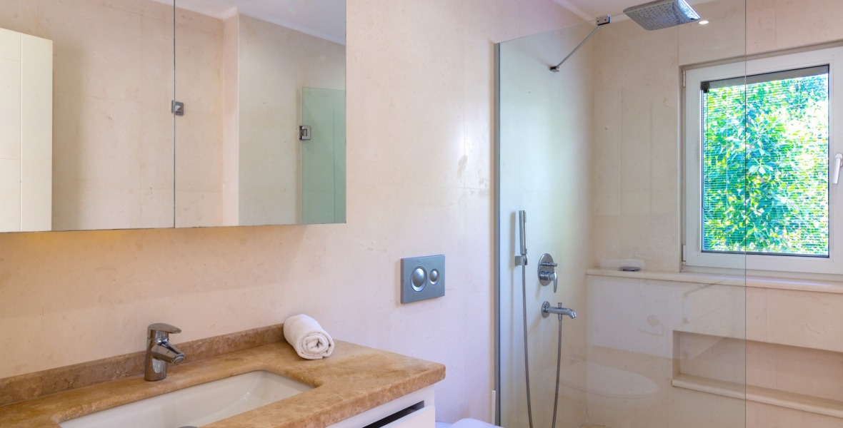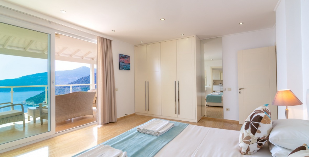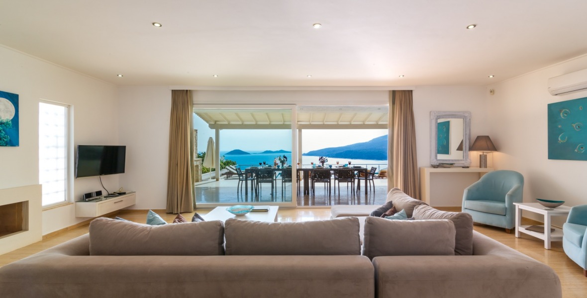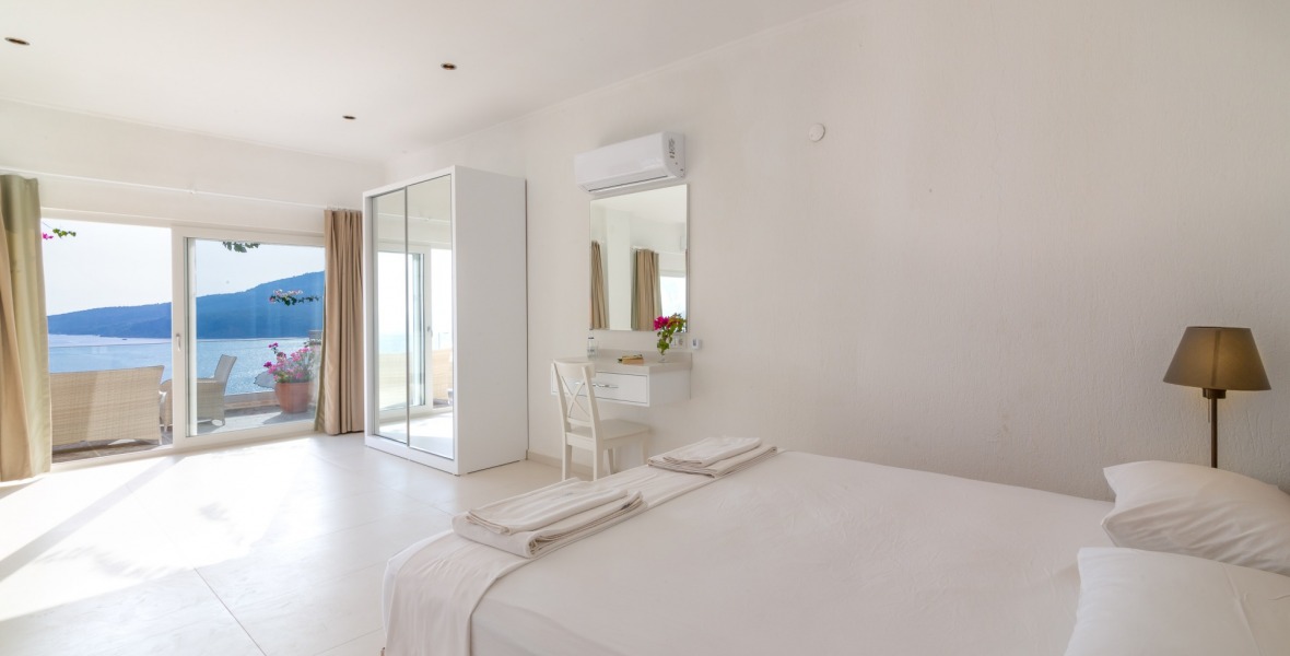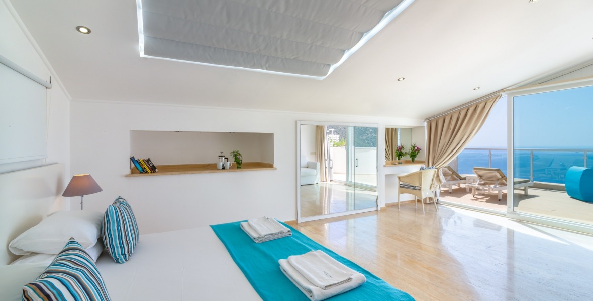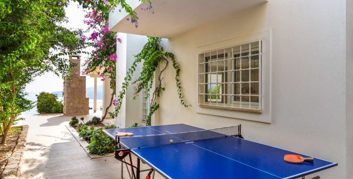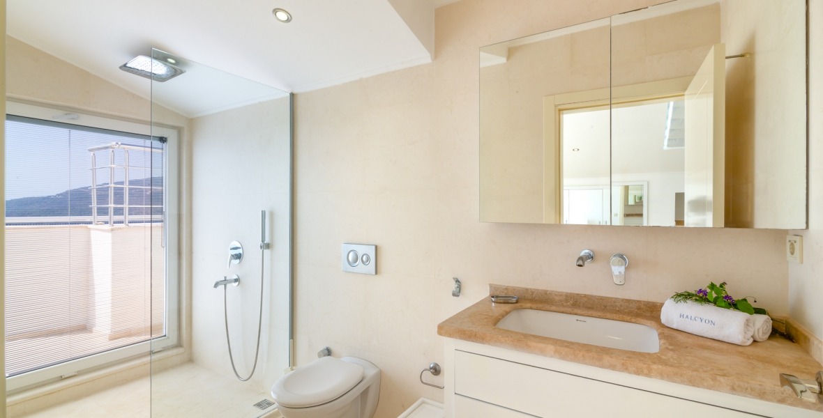 It is a beautiful house positioned on the hillside overlooking Kalamar Bay. This stunning 5/6 bedroom, 5/6 bathroom house enjoys breath taking uninterrupted views across the bay to the islands. The villa is situated approximately a 20 minute walk from the centre of town and just a 5 minute down hill stroll to the sea and the nearest beach club with it’s beautiful clear sea for swimming, it’s restaurant, bar and water sports facilities.