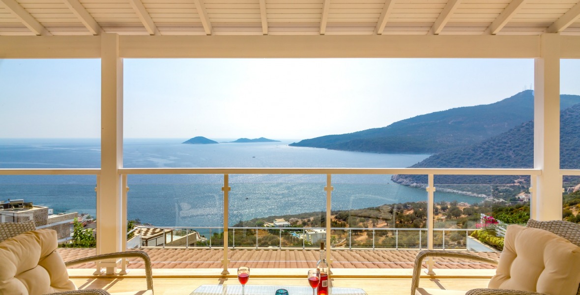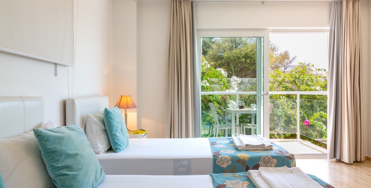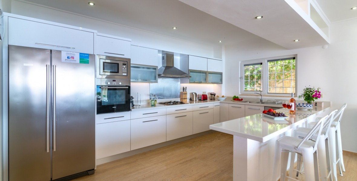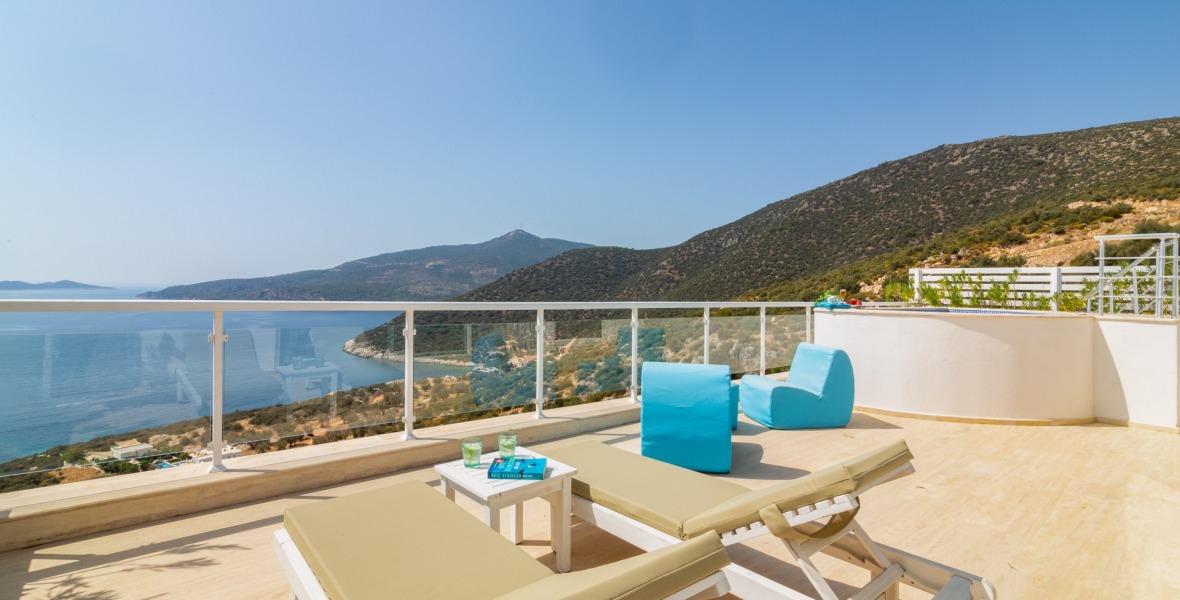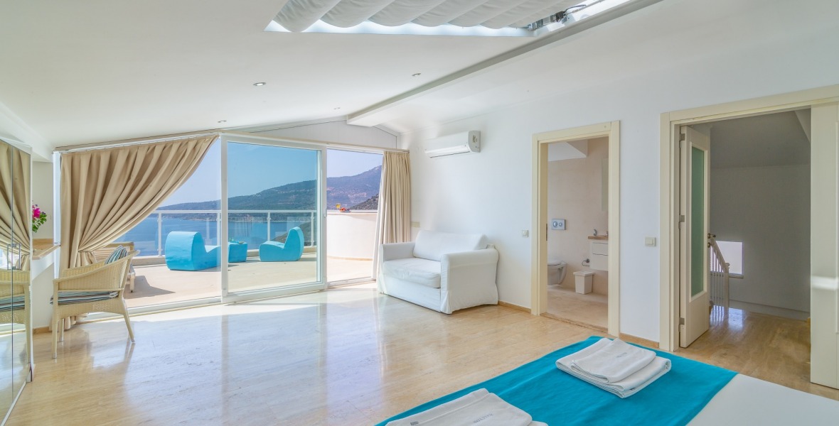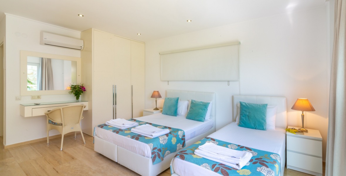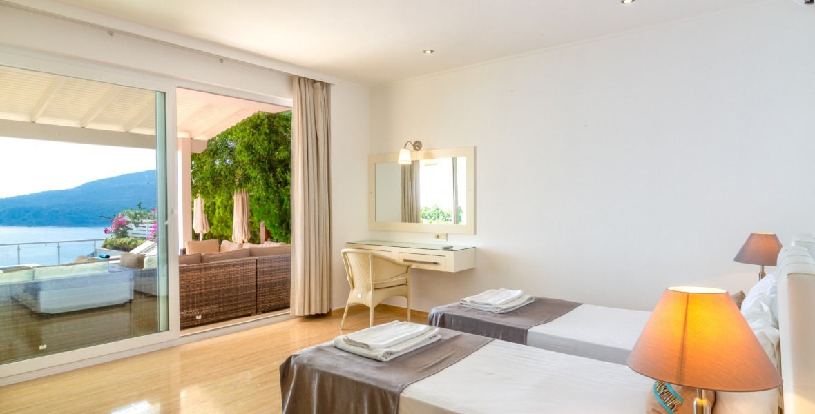 It is a beautiful house positioned on the hillside overlooking Kalamar Bay. This stunning 5/6 bedroom, 5/6 bathroom house enjoys breath taking uninterrupted views across the bay to the islands. The villa is situated approximately a 20 minute walk from the centre of town and just a 5 minute down hill stroll to the sea and the nearest beach club with it’s beautiful clear sea for swimming, it’s restaurant, bar and water sports facilities.
