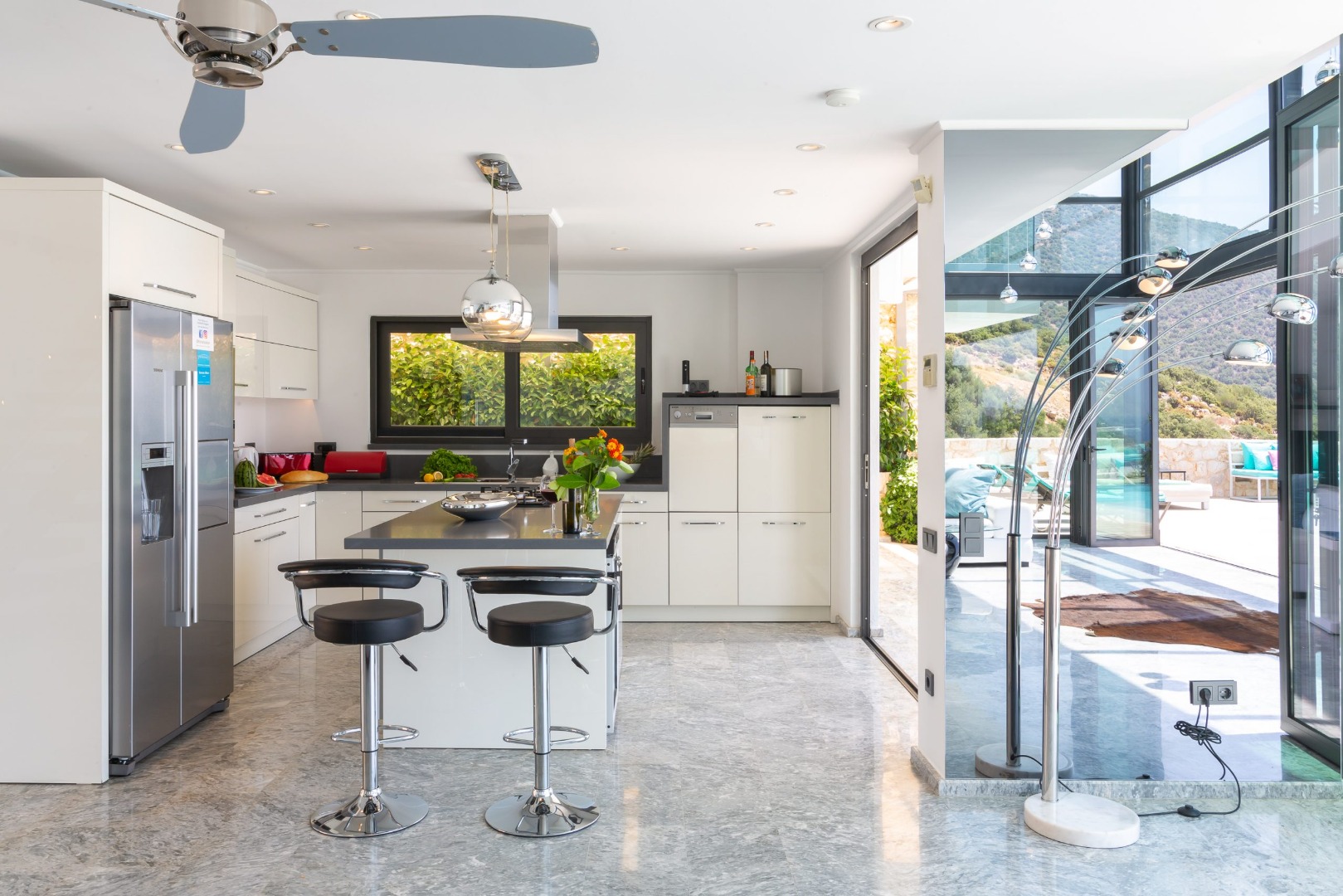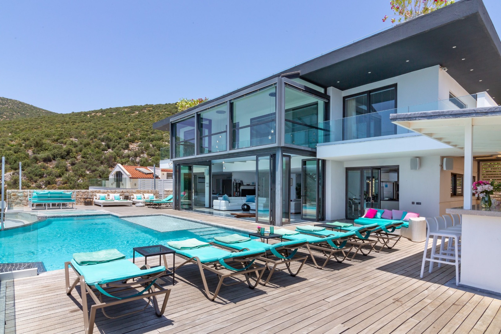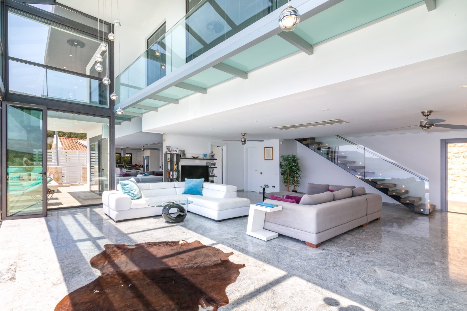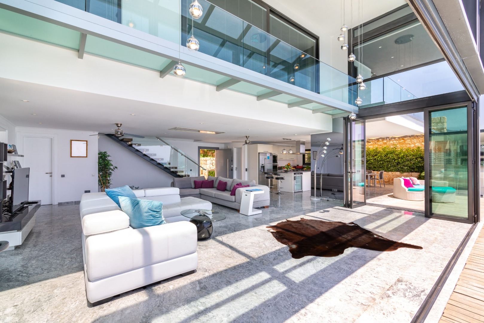 A breathtakingly beautiful contemporary style house positioned on the hillside overlooking Kalamar bay. This fabulous 5 bedroom, 5 bathroom house enjoys breath-taking views across the bay to the islands. The villa is approximately a 20 minute walk from the centre of town and just a 10 minute downhill walk to the sea and the nearest beach club.