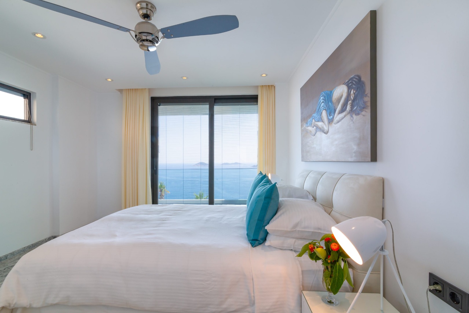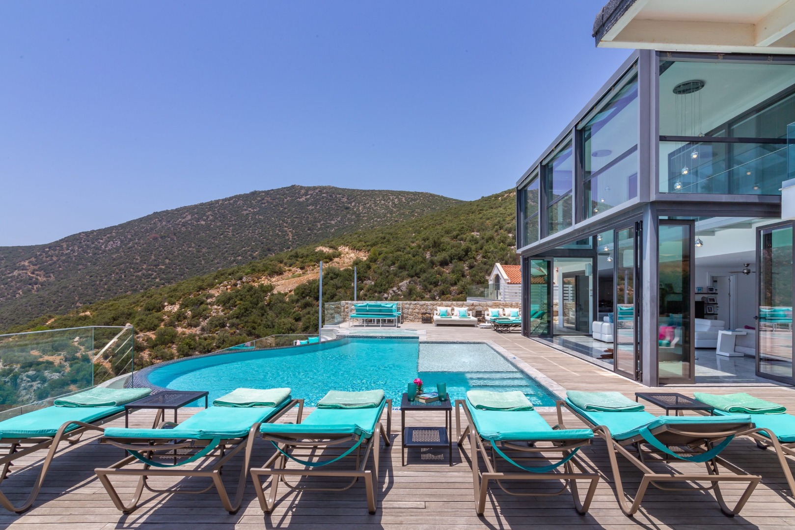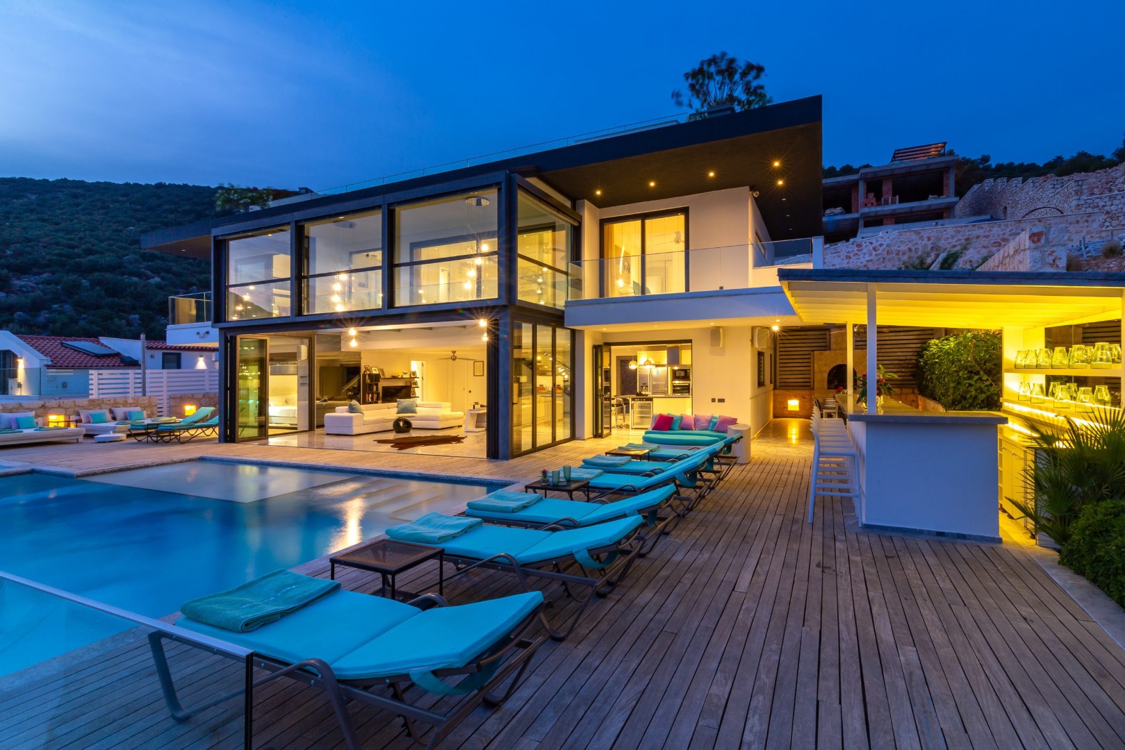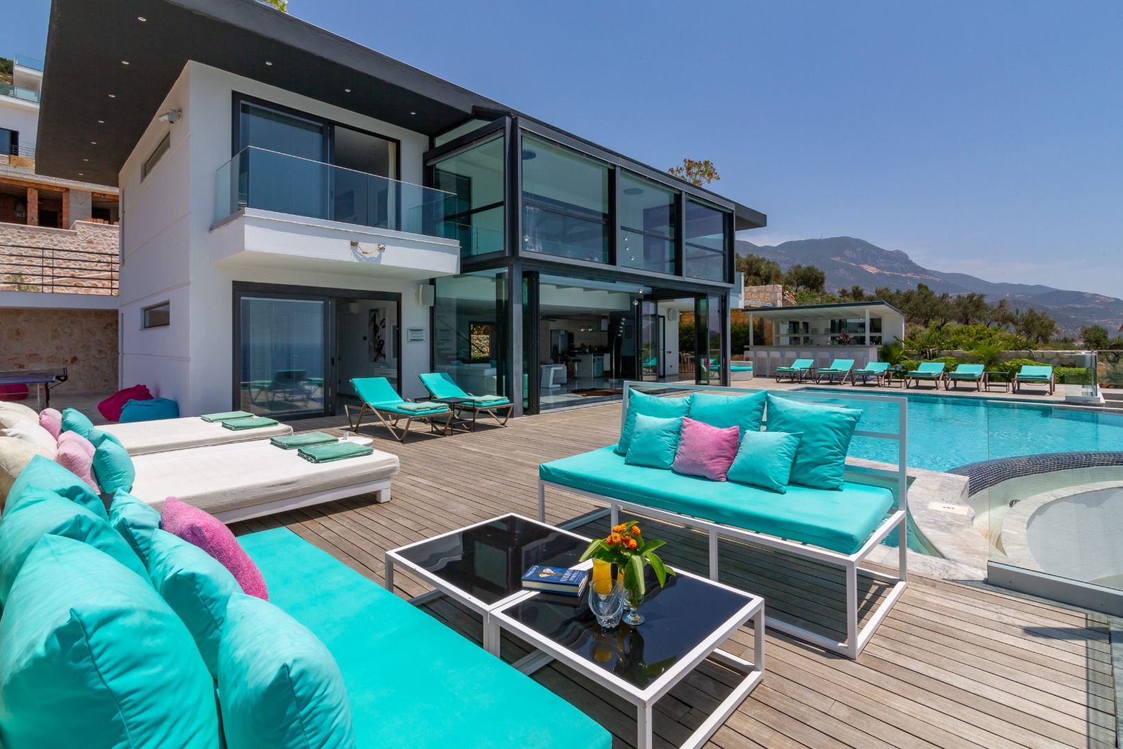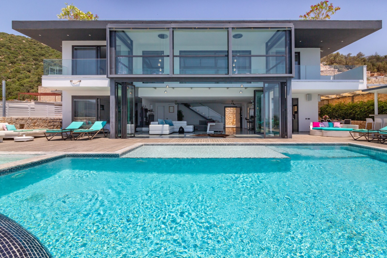 A breathtakingly beautiful contemporary style house positioned on the hillside overlooking Kalamar bay. This fabulous 5 bedroom, 5 bathroom house enjoys breath-taking views across the bay to the islands. The villa is approximately a 20 minute walk from the centre of town and just a 10 minute downhill walk to the sea and the nearest beach club.
