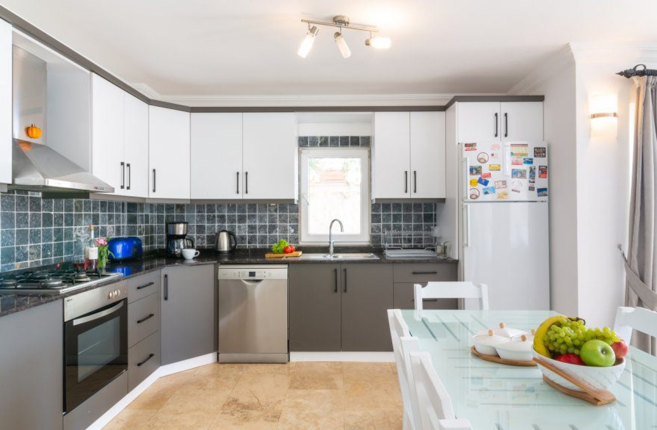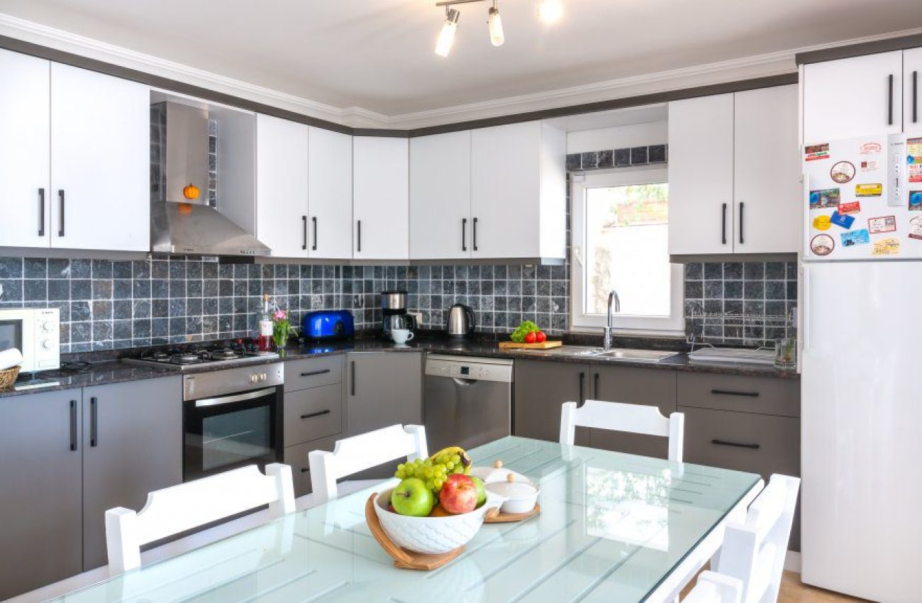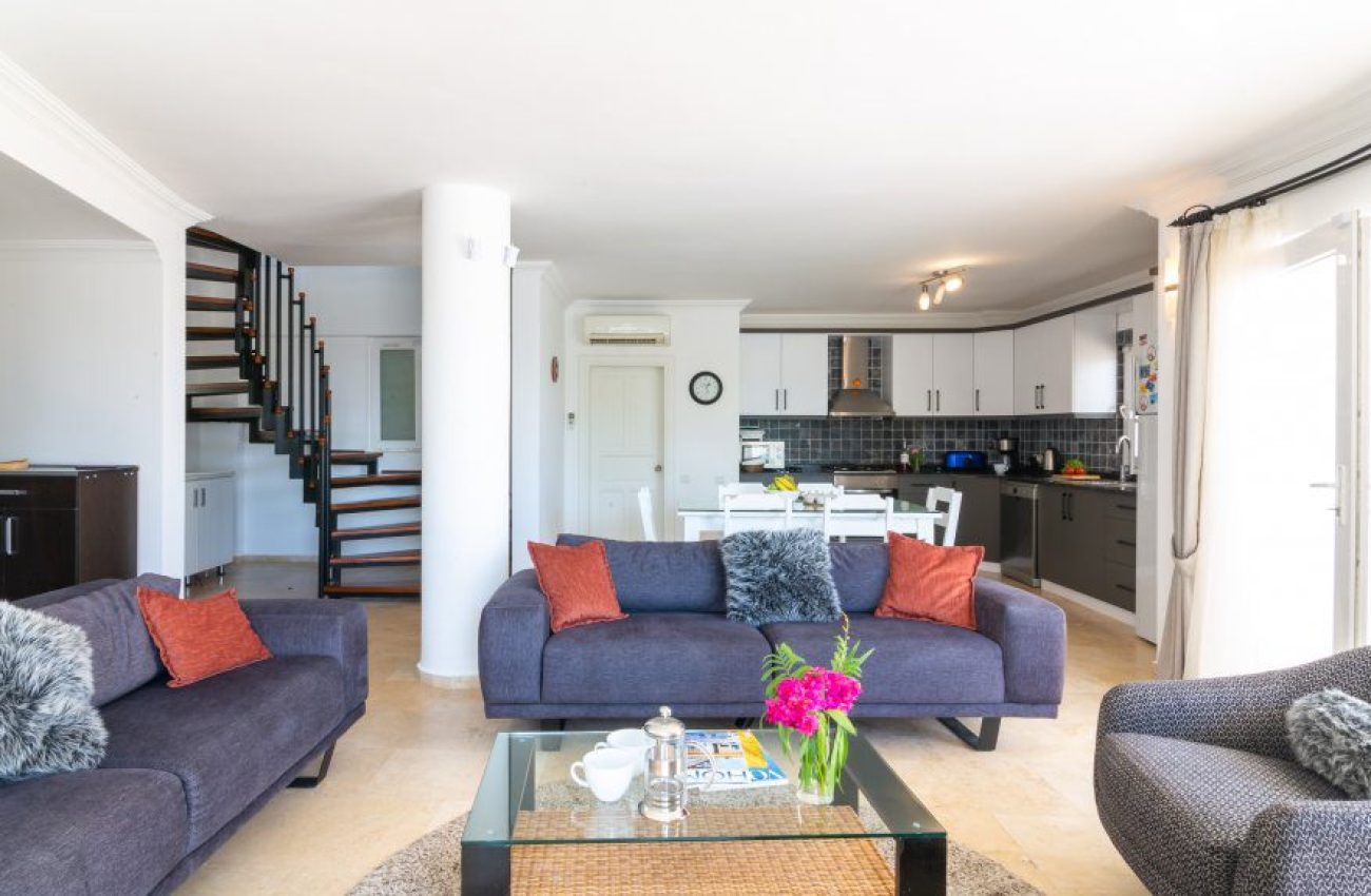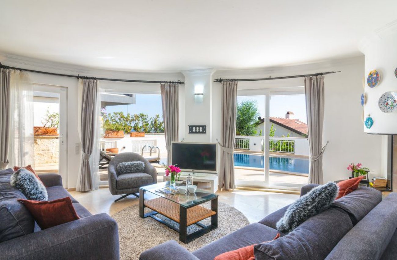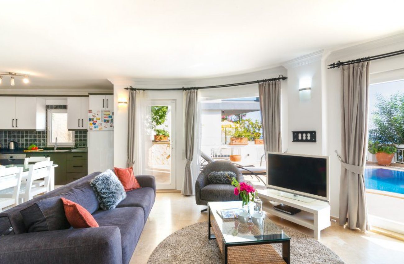 The open-plan kitchen and dining area is fully equipped for family meals, whether you want to prepare a light breakfast before heading to the beach or enjoy a leisurely dinner together. The villa also has a large lounge area with comfortable seating and a flat-screen TV, making it easy to relax indoors after a day exploring Kalkan.