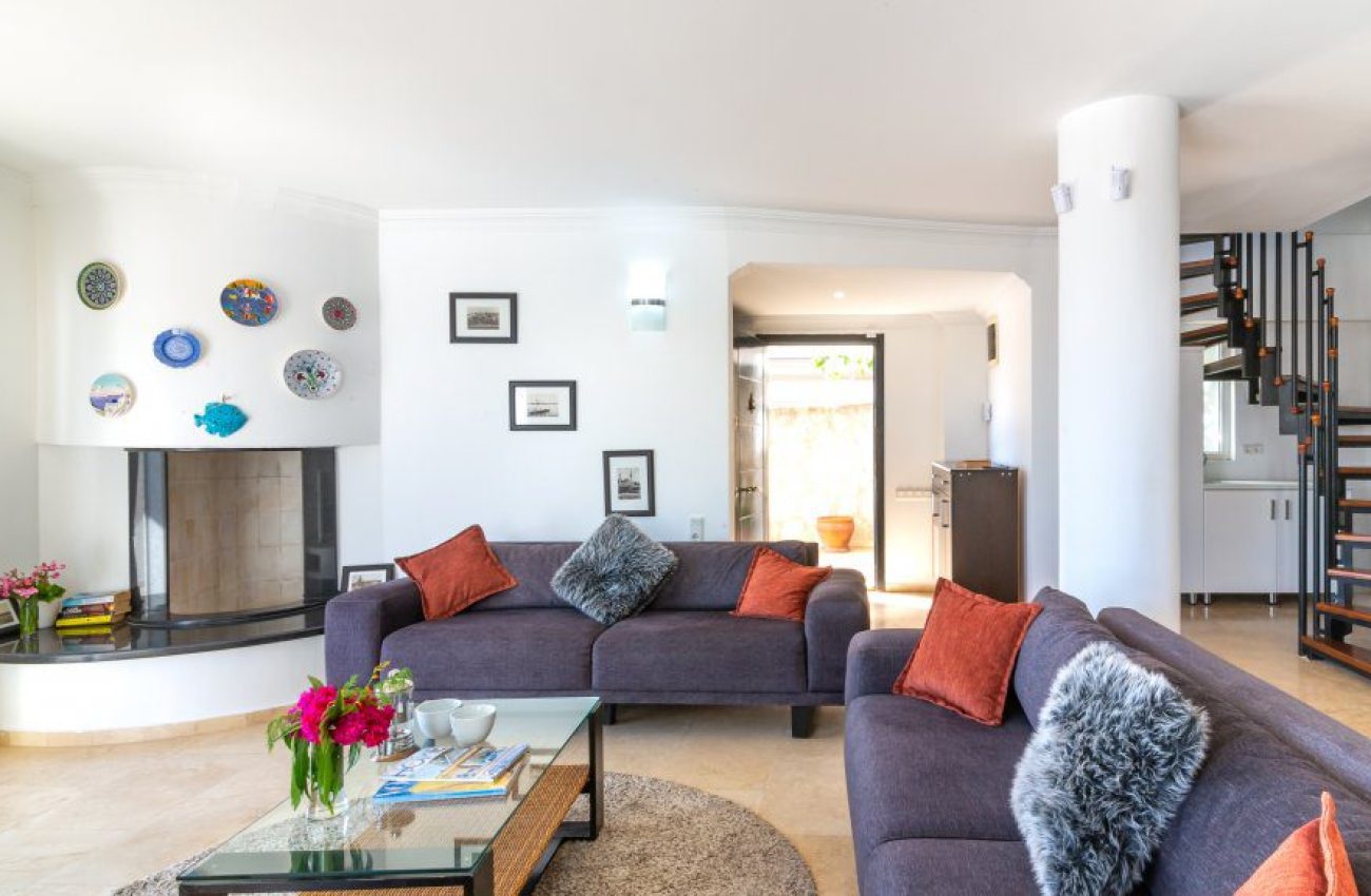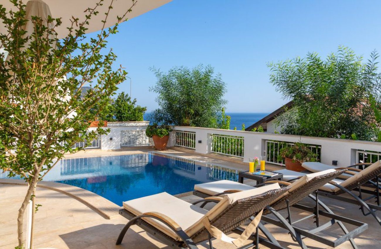 The main living area opens directly onto a spacious terrace with sweeping sea views. Here, you can enjoy al fresco dining with the Mediterranean as your backdrop, or simply relax on a sun lounger with a good book. The infinity-style fresh-water pool provides a refreshing spot to cool down after a day in the sun.