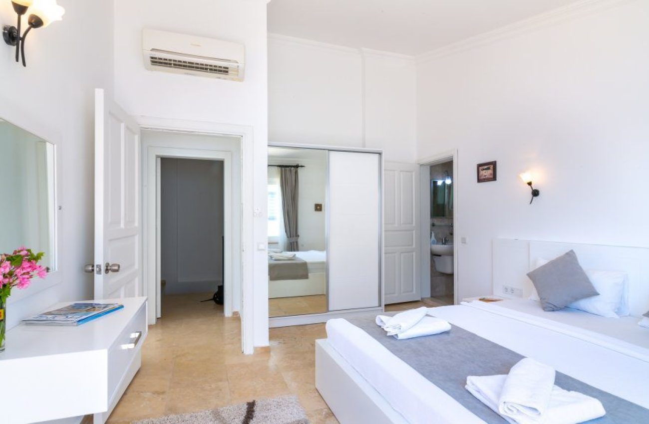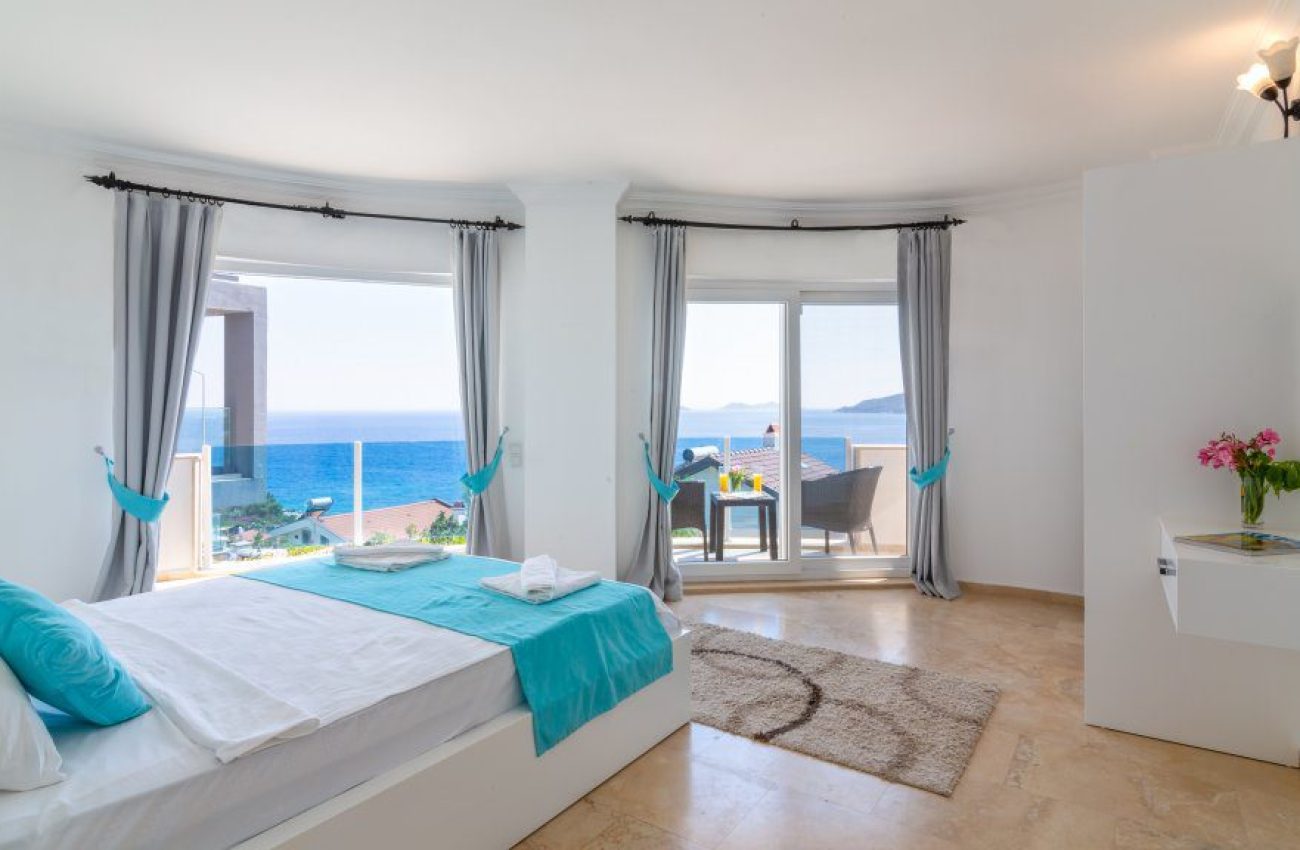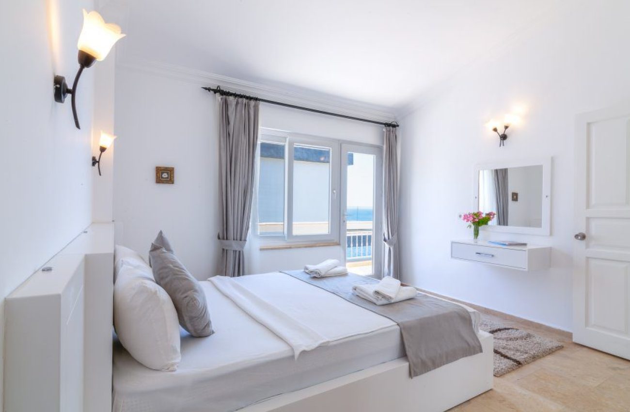 This family villa in Kalkan can accommodate up to 8 guests across its 4 spacious bedrooms. Each room is designed with comfort in mind, featuring air conditioning, comfortable beds, and modern decor. Two of the bedrooms have access to private balconies with sea views, perfect for a quiet morning coffee or a romantic sunset moment.