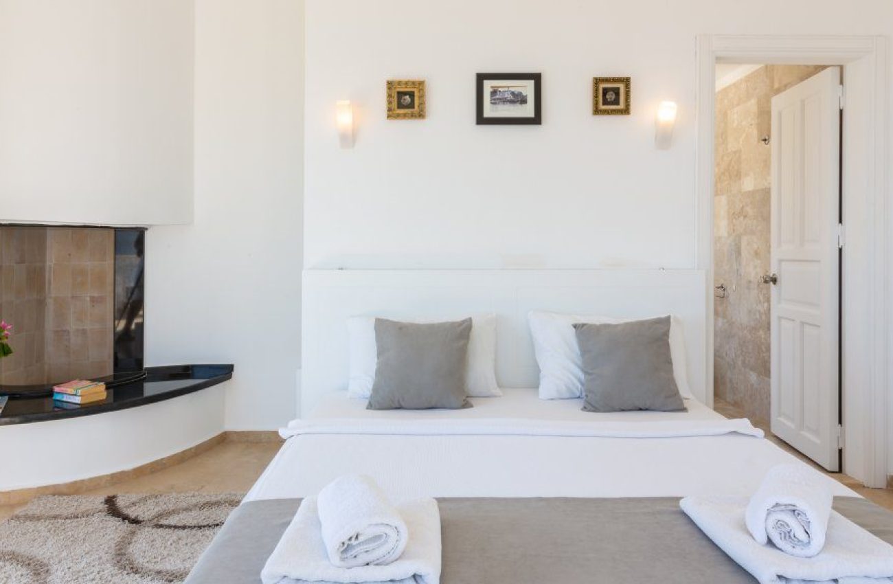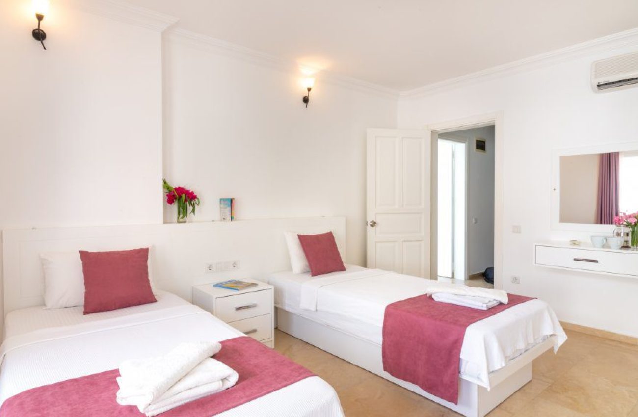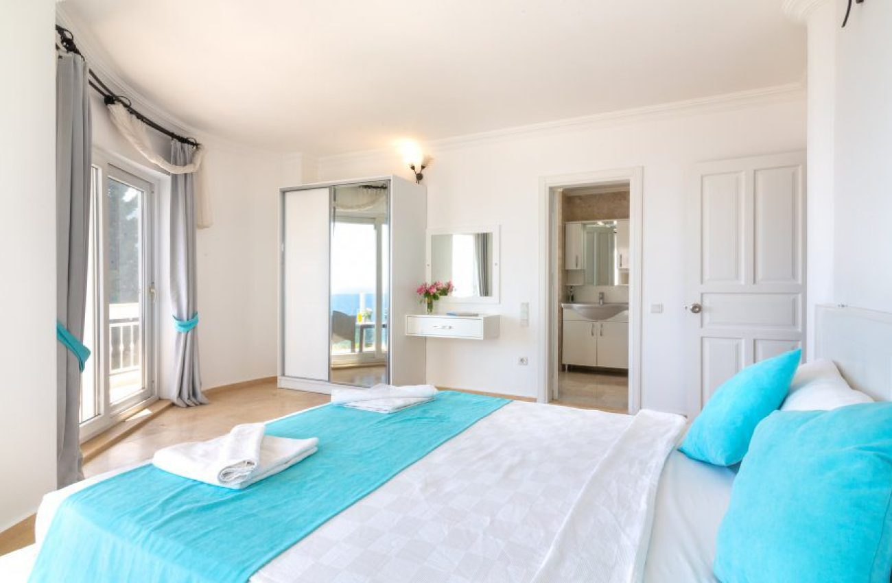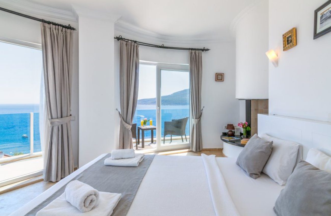 This family villa in Kalkan can accommodate up to 8 guests across its 4 spacious bedrooms. Each room is designed with comfort in mind, featuring air conditioning, comfortable beds, and modern decor. Two of the bedrooms have access to private balconies with sea views, perfect for a quiet morning coffee or a romantic sunset moment.
