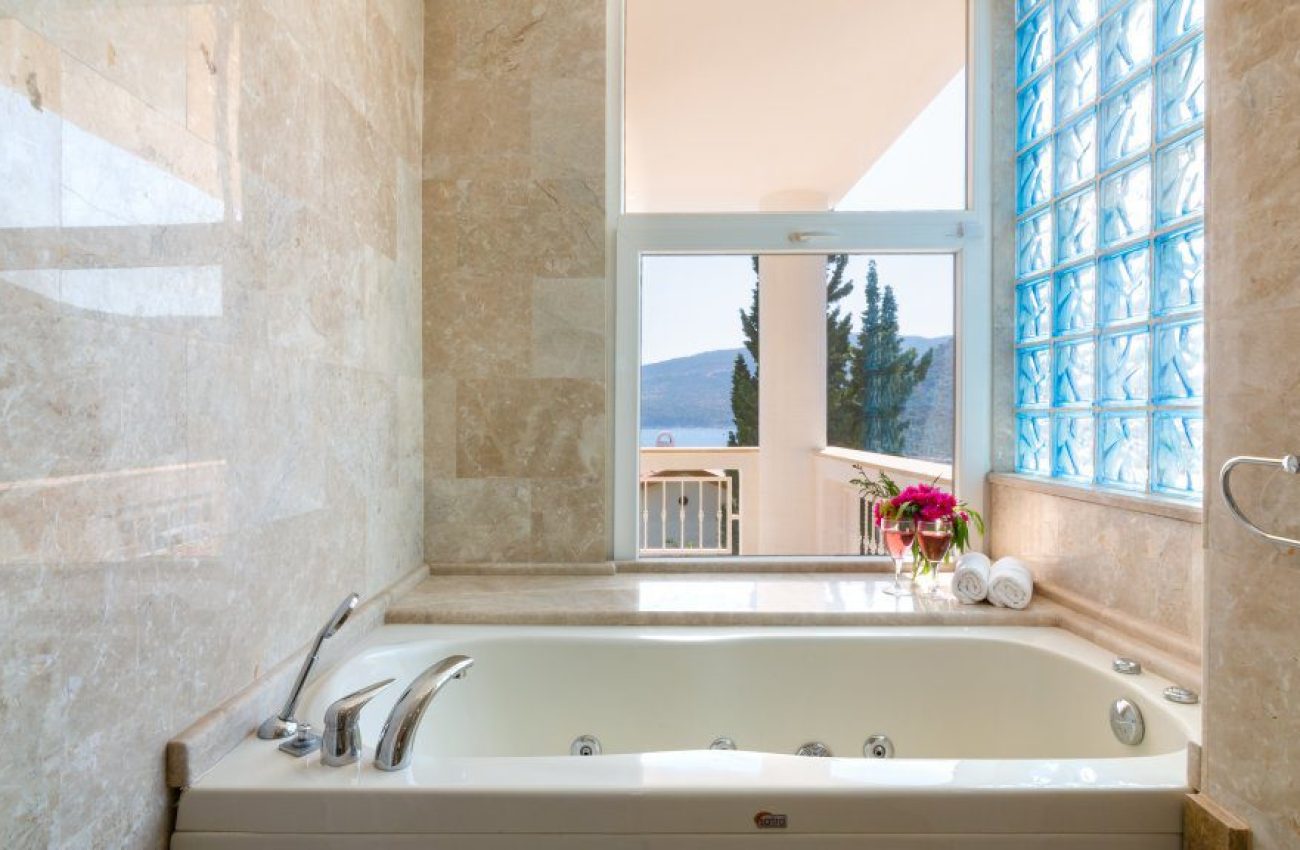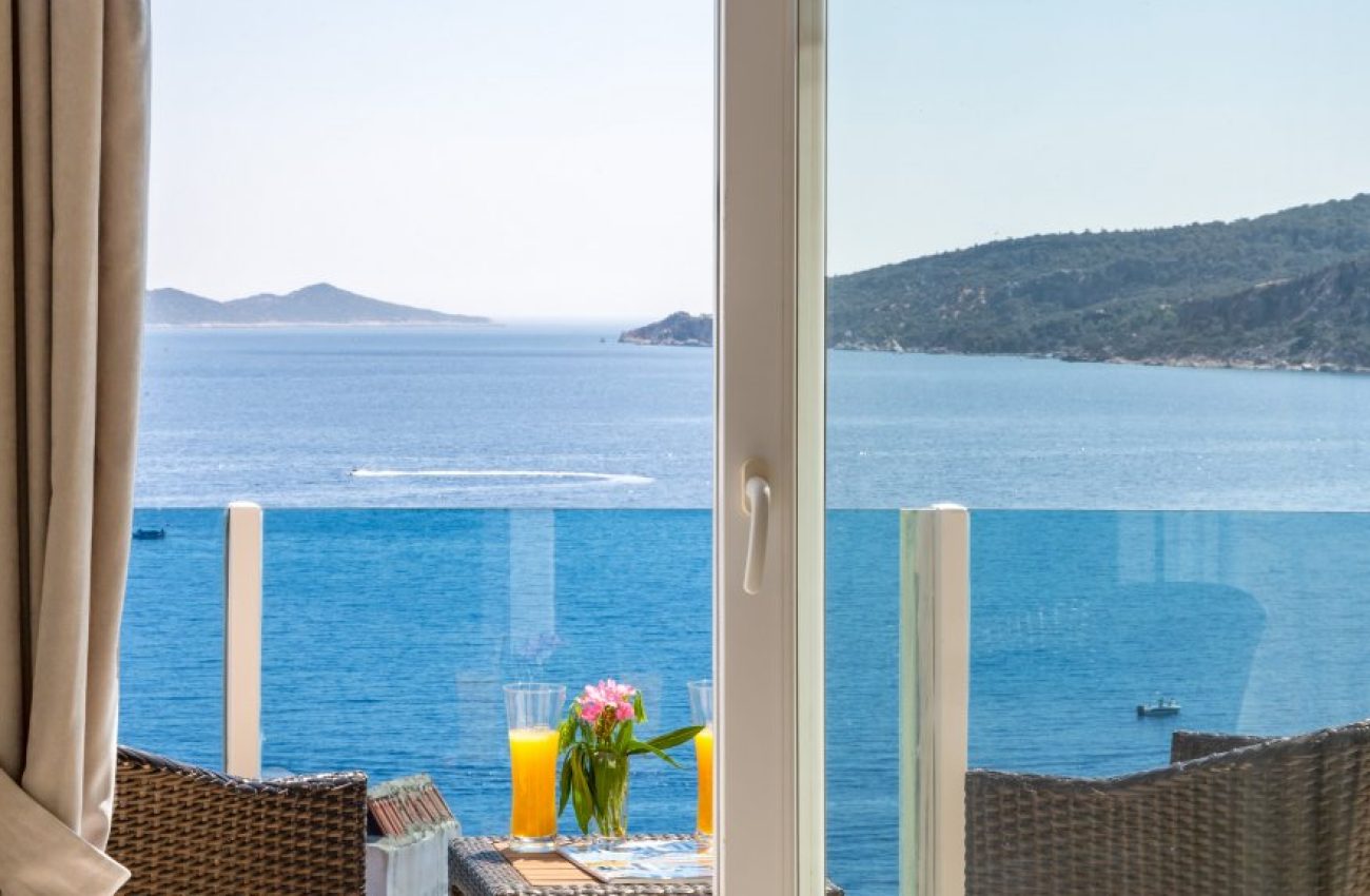 One of Villa Lena’s greatest features is its position above Kalamar Bay, offering uninterrupted views of the turquoise sea. From sunrise to sunset, the scenery is constantly changing, making the outdoor terraces and balconies the perfect places to relax. The villa’s design makes the most of its location, with floor-to-ceiling windows and wide doors that bring the outside in.