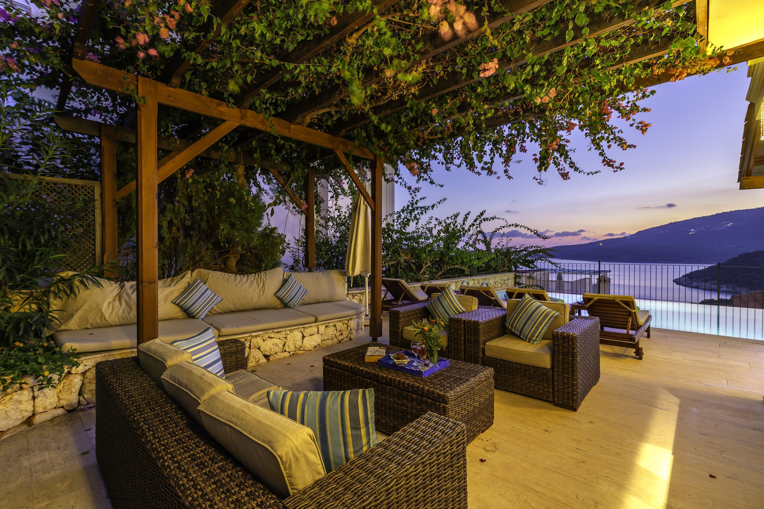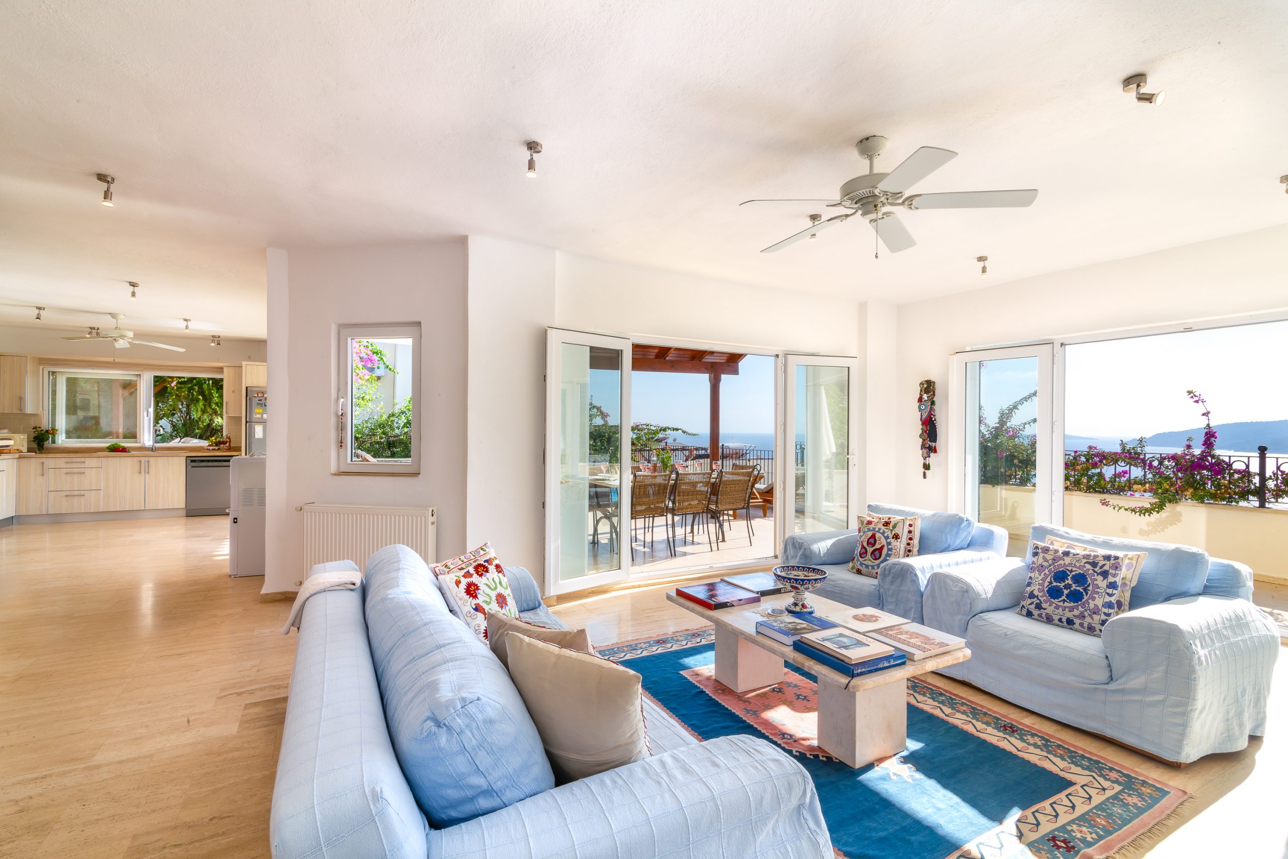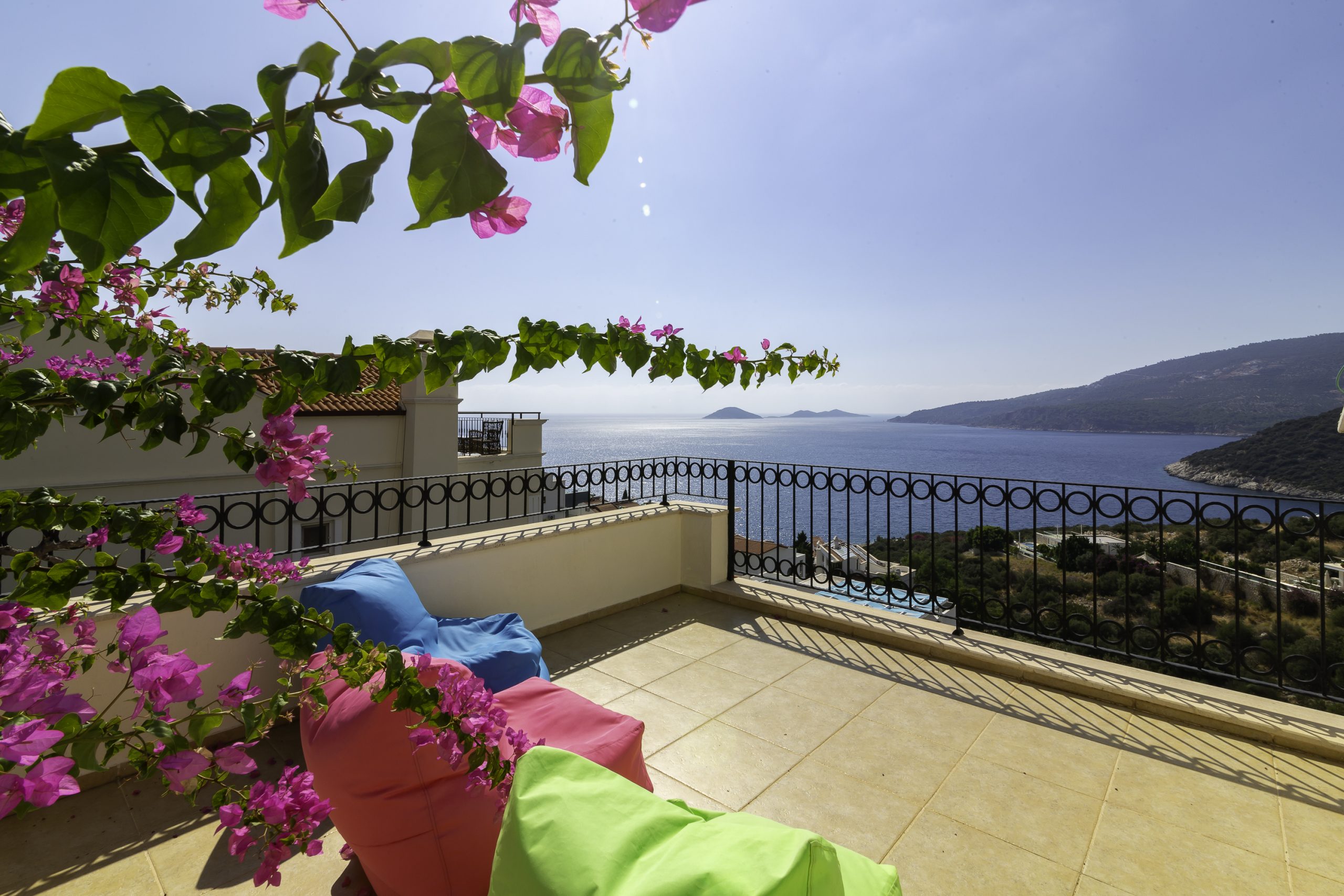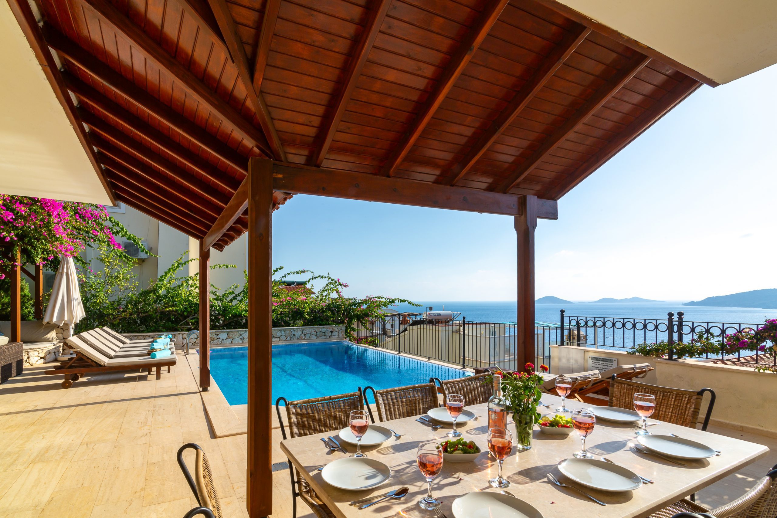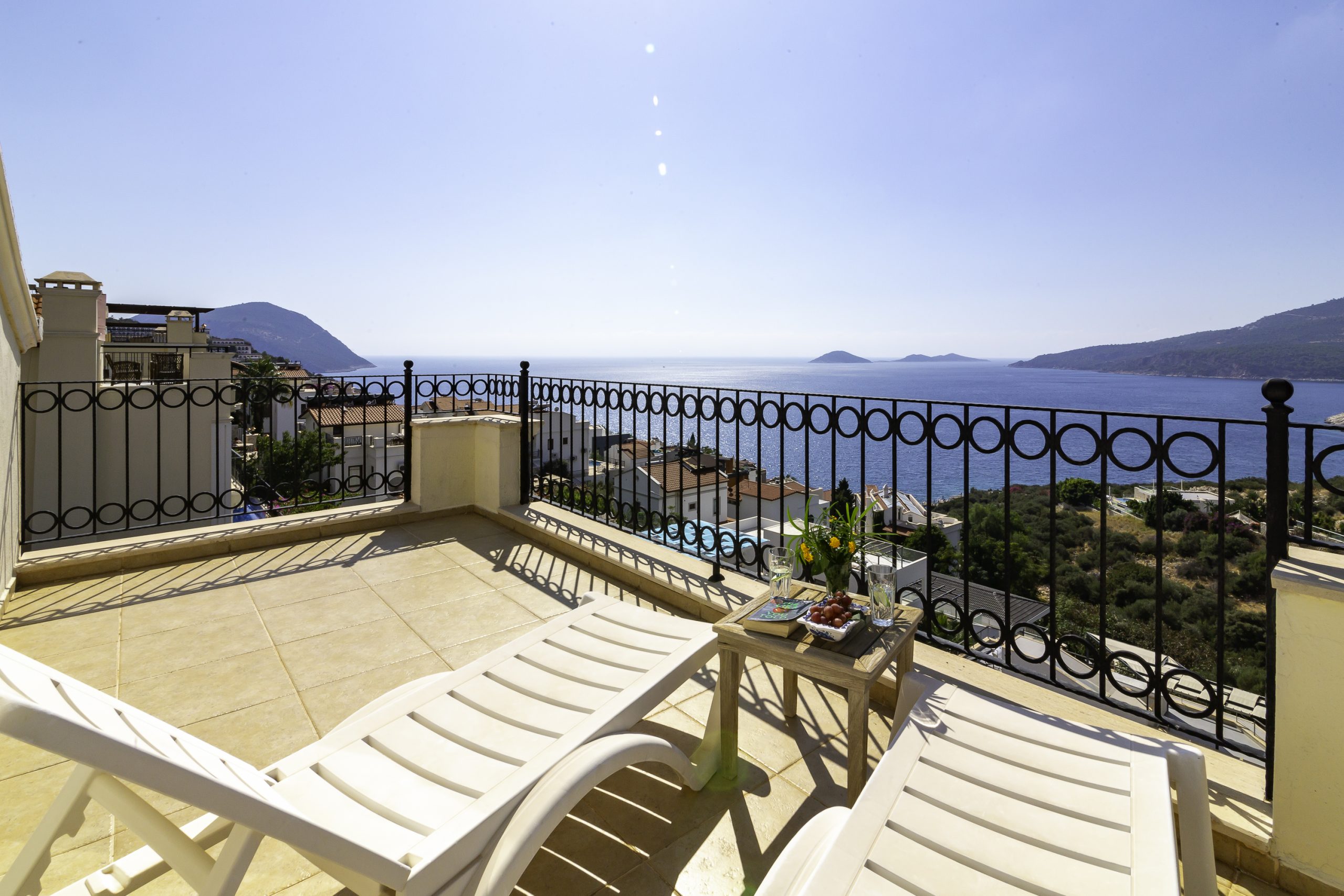 It is a charming 5 bedroom luxury villa overlooking Kalamar Bay. It is situated 1 km (20 minute walk) away from the centre of Kalkan and just a 5 minute walk to the sea.