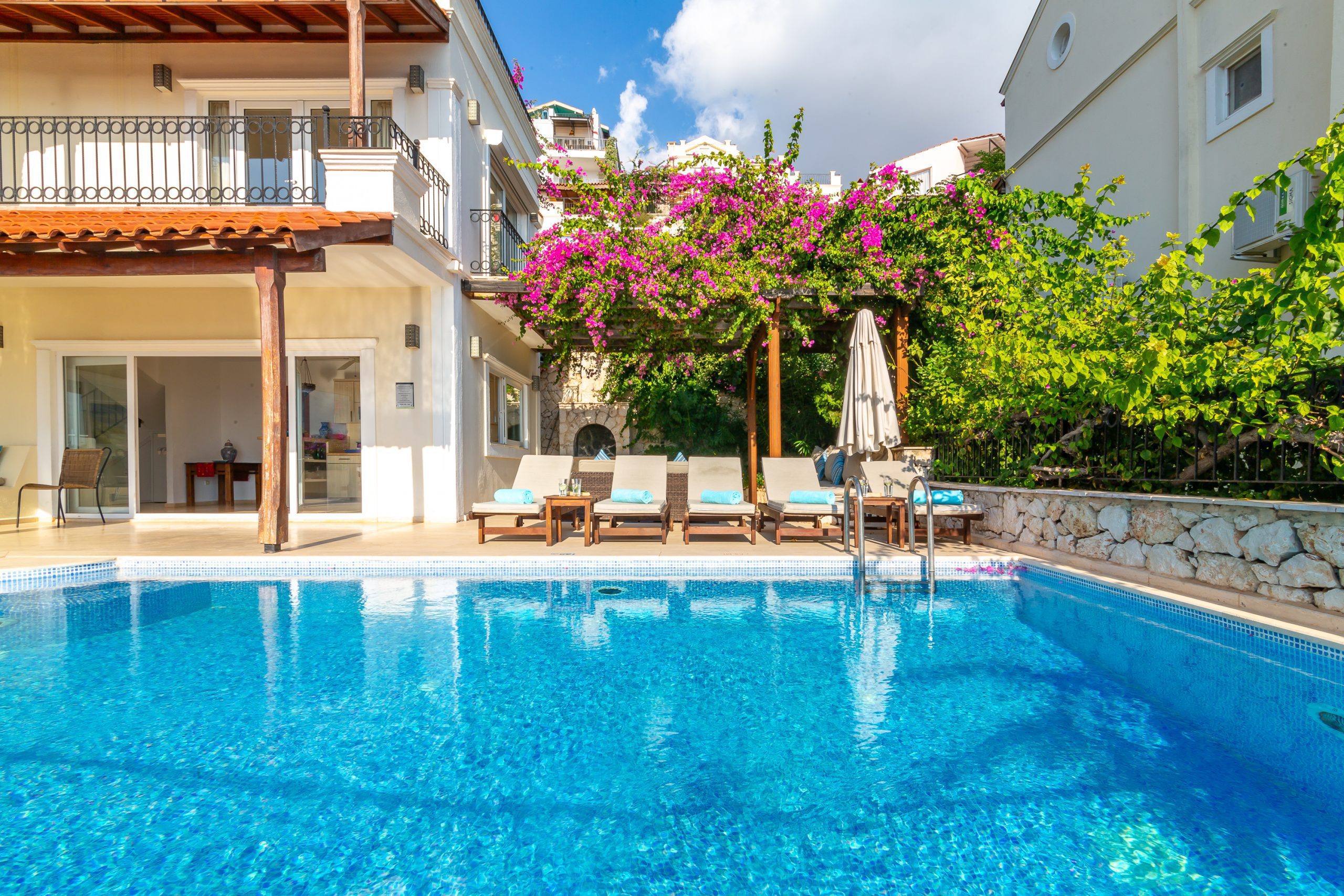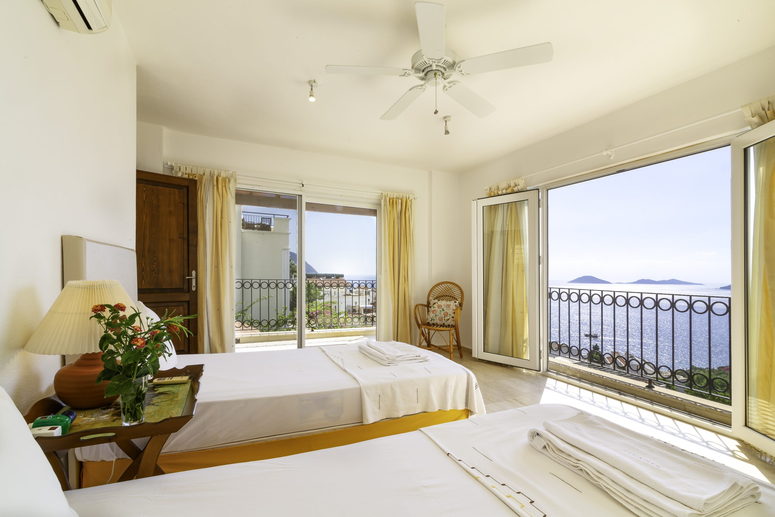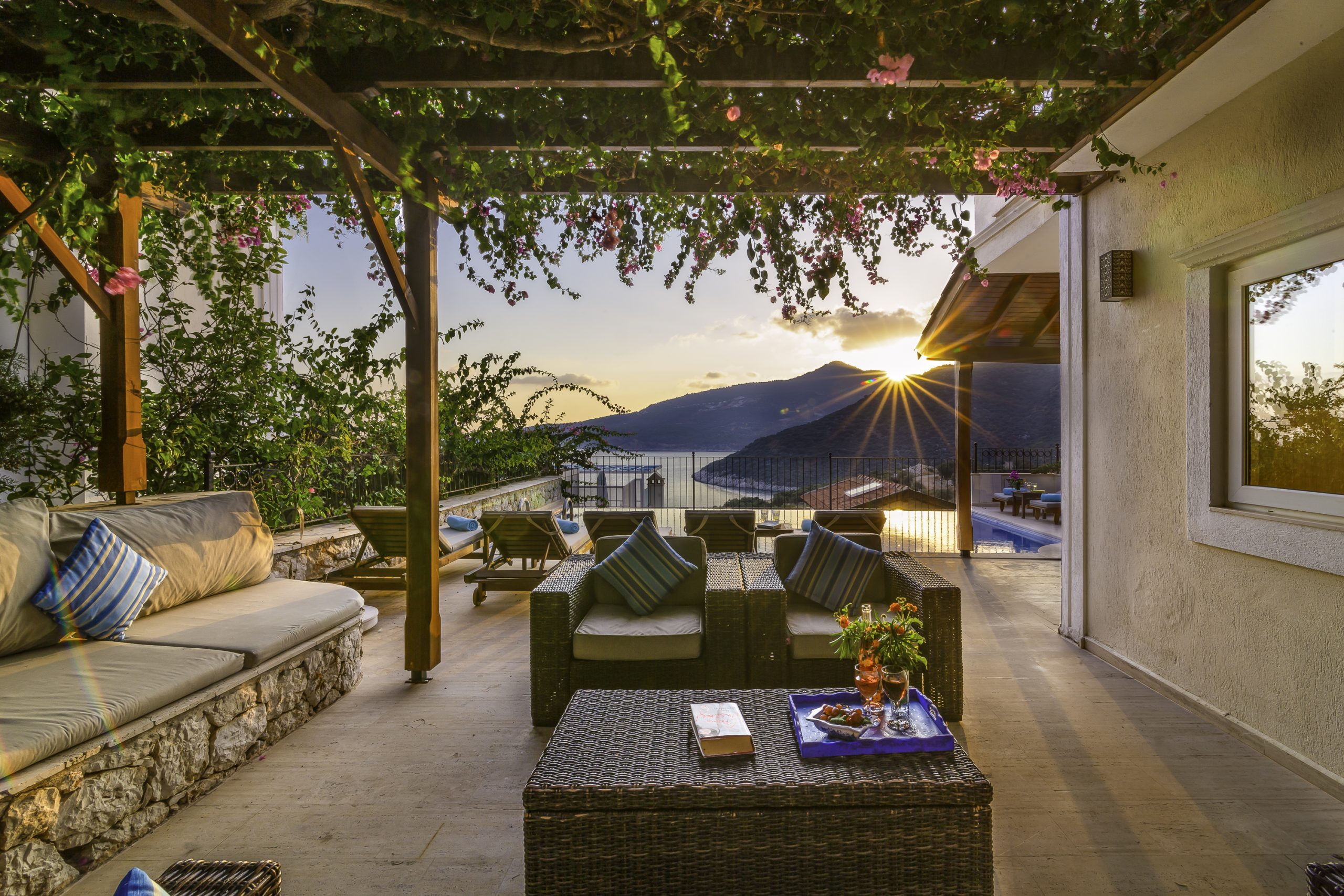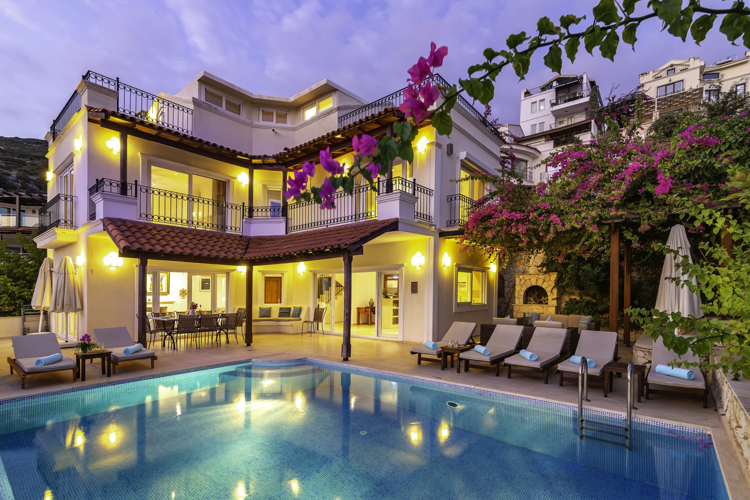 It is a charming 5 bedroom luxury villa overlooking Kalamar Bay. It is situated 1 km (20 minute walk) away from the centre of Kalkan and just a 5 minute walk to the sea.