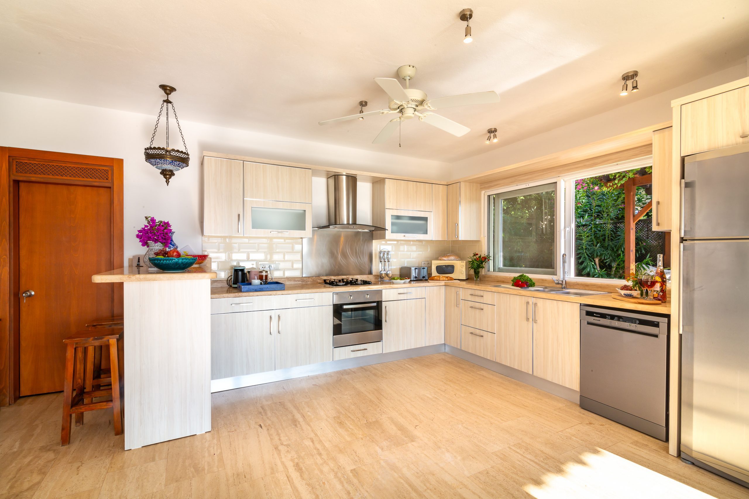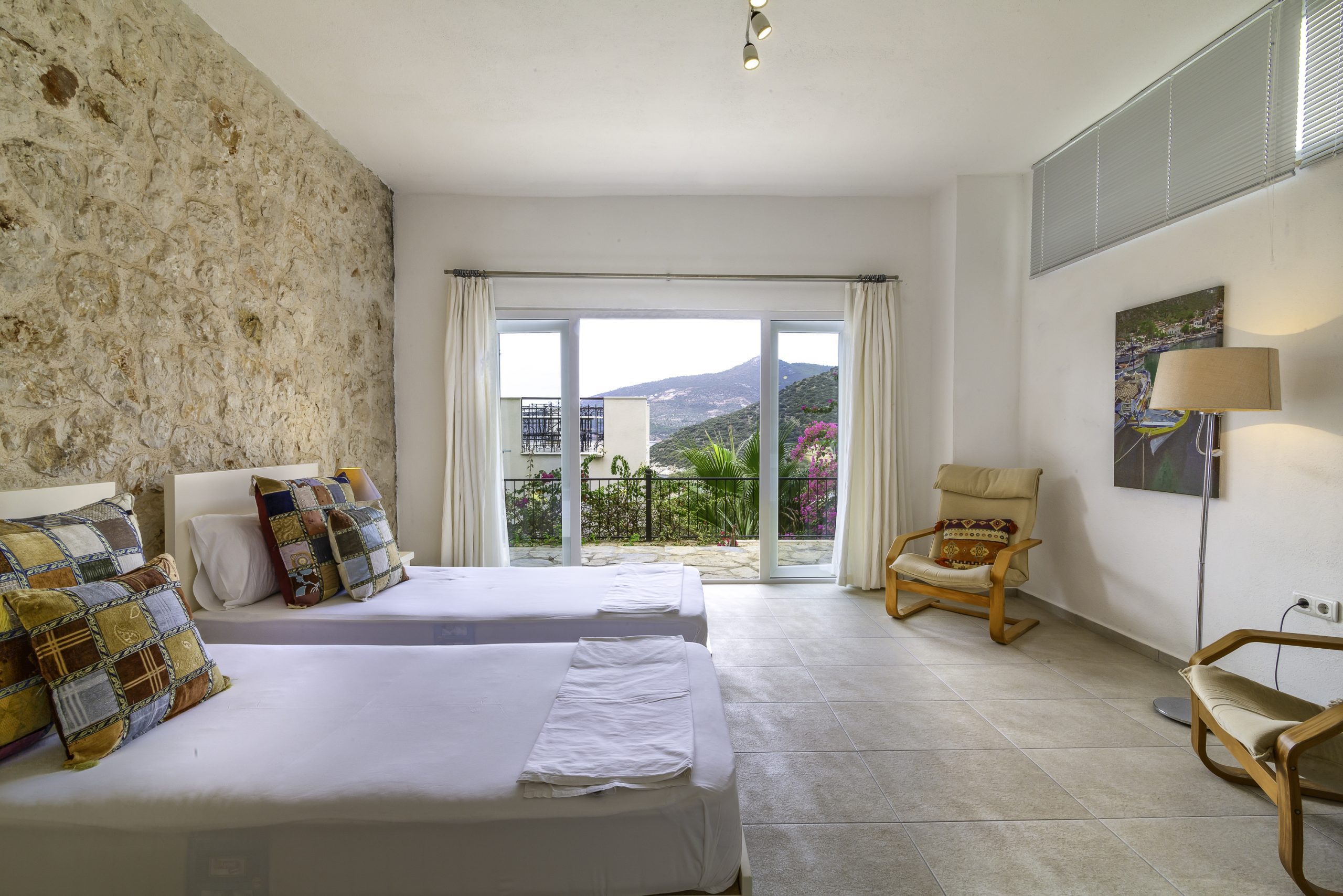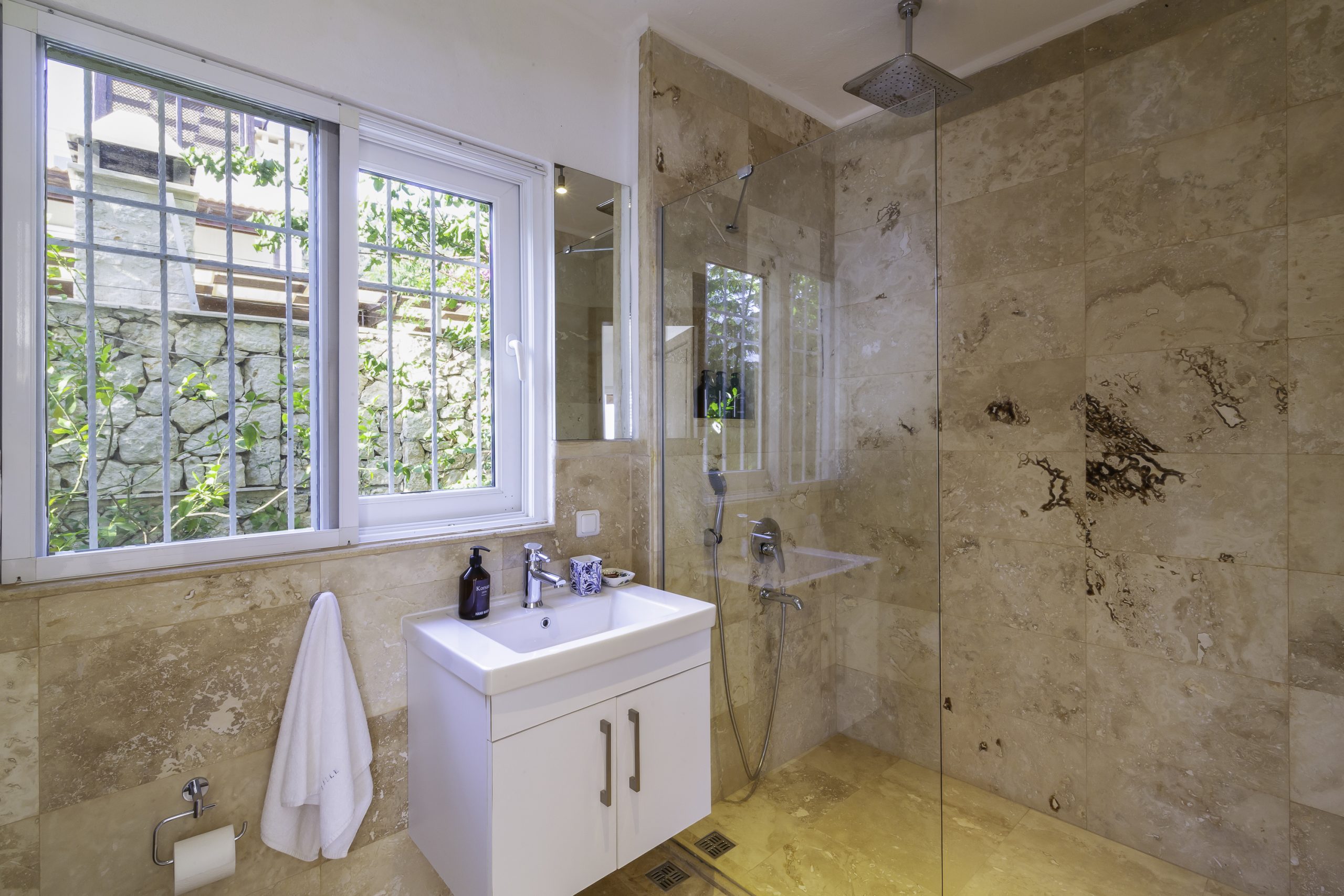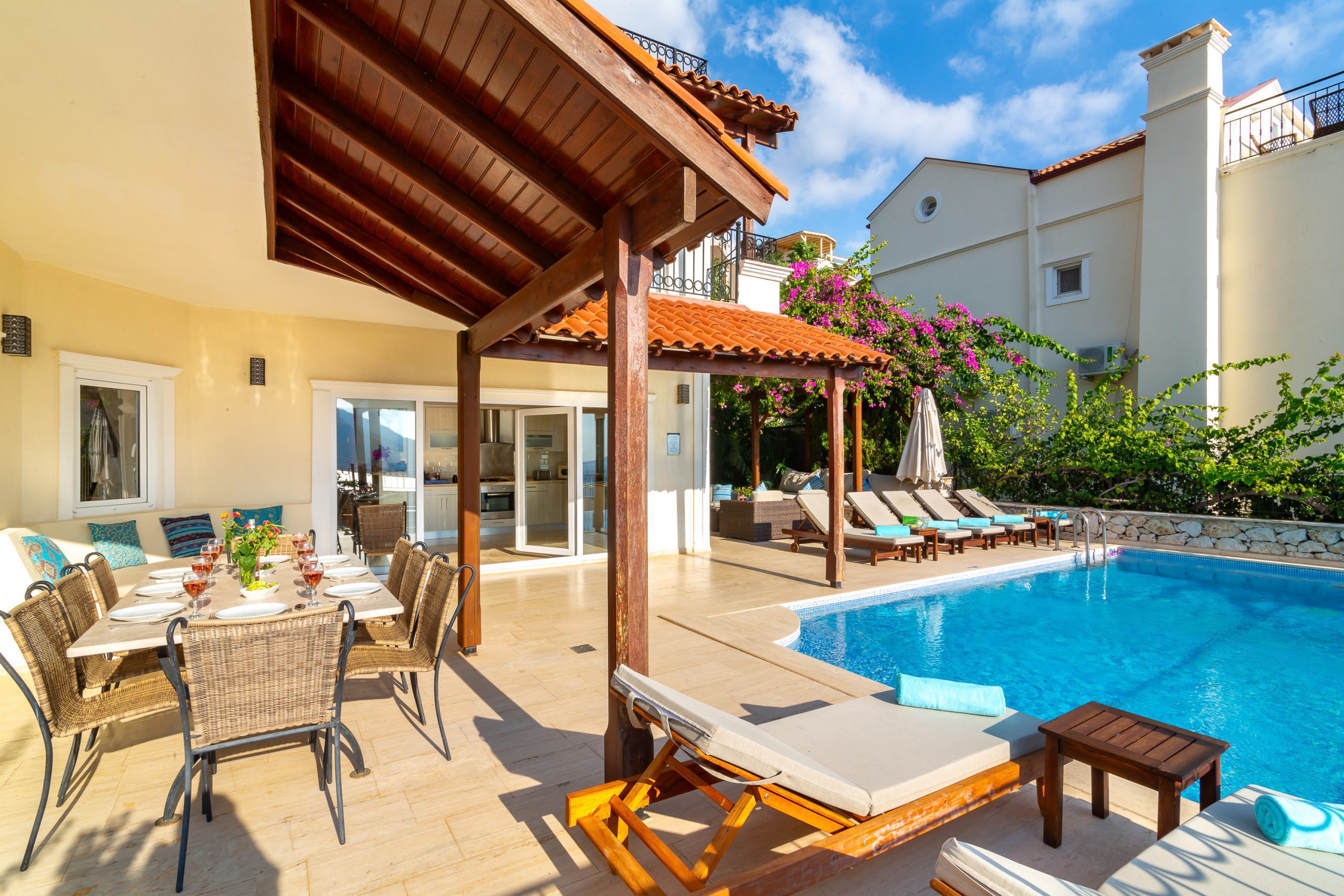 It is a charming 5 bedroom luxury villa overlooking Kalamar Bay. It is situated 1 km (20 minute walk) away from the centre of Kalkan and just a 5 minute walk to the sea.