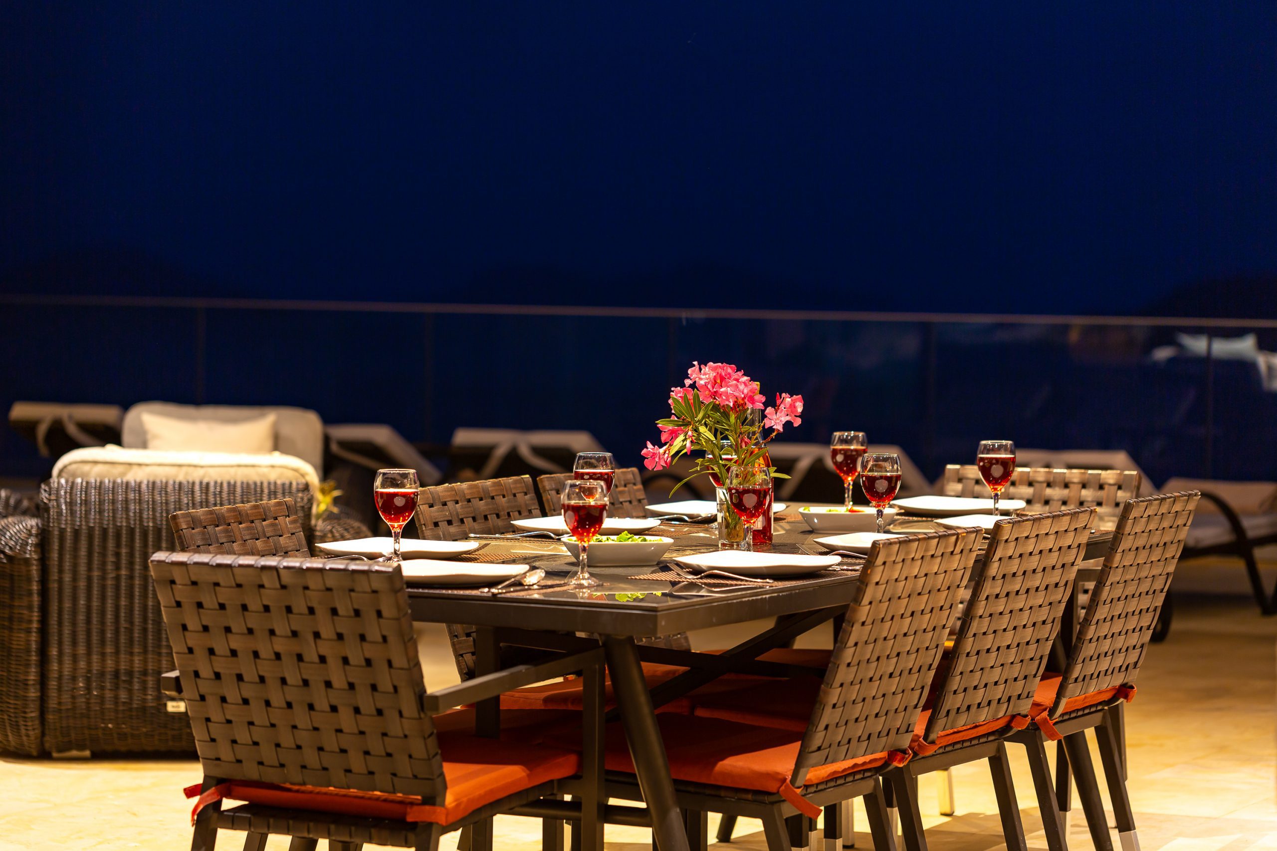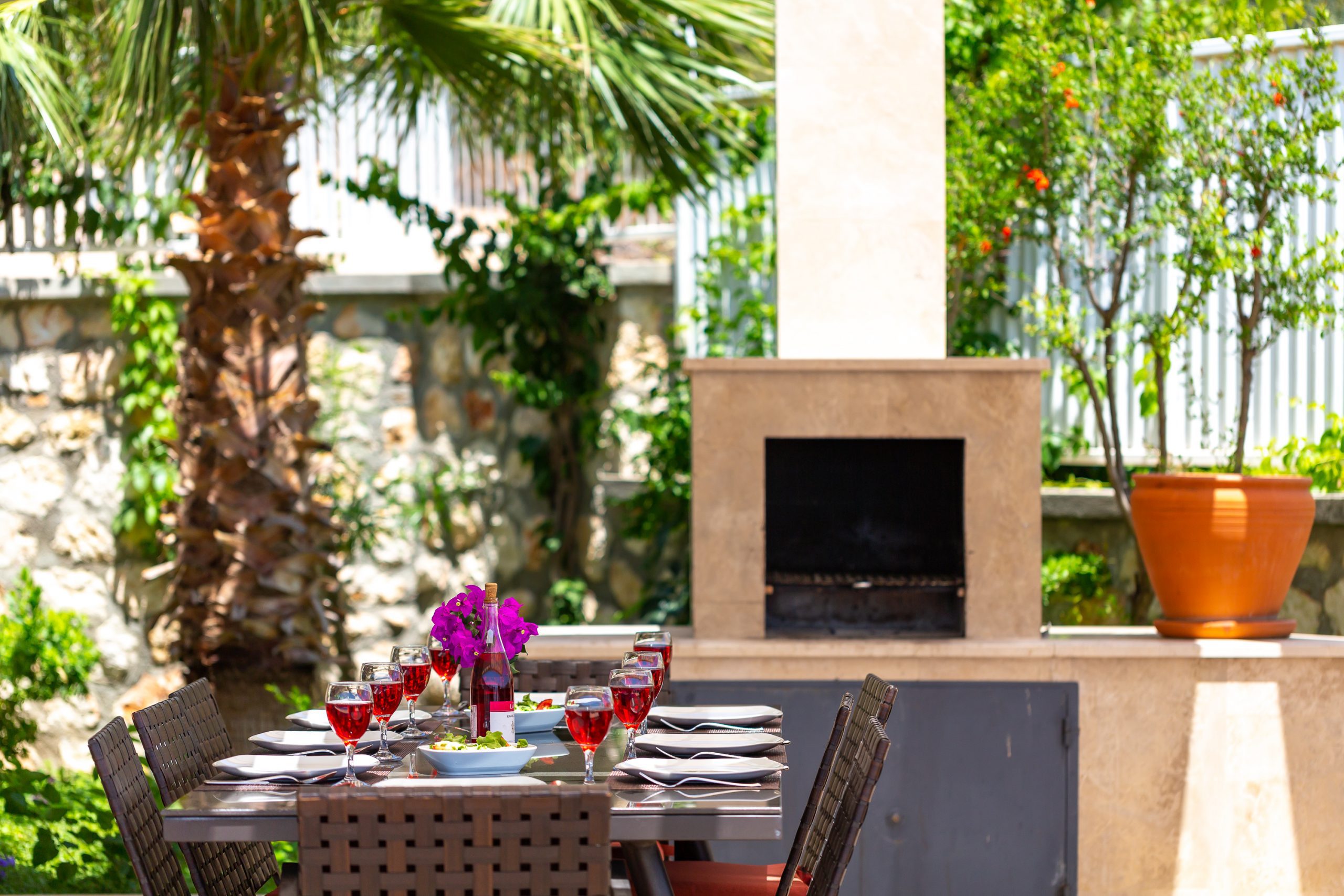 The villa’s expansive outdoor terrace is a highlight, designed for both relaxation and entertainment. The private swimming pool sits at the heart of the terrace, surrounded by sun loungers, parasols, and shady seating areas. A covered dining area and stone BBQ make al fresco dining effortless, whether it’s a family breakfast in the morning sun or a barbecue dinner under the stars.