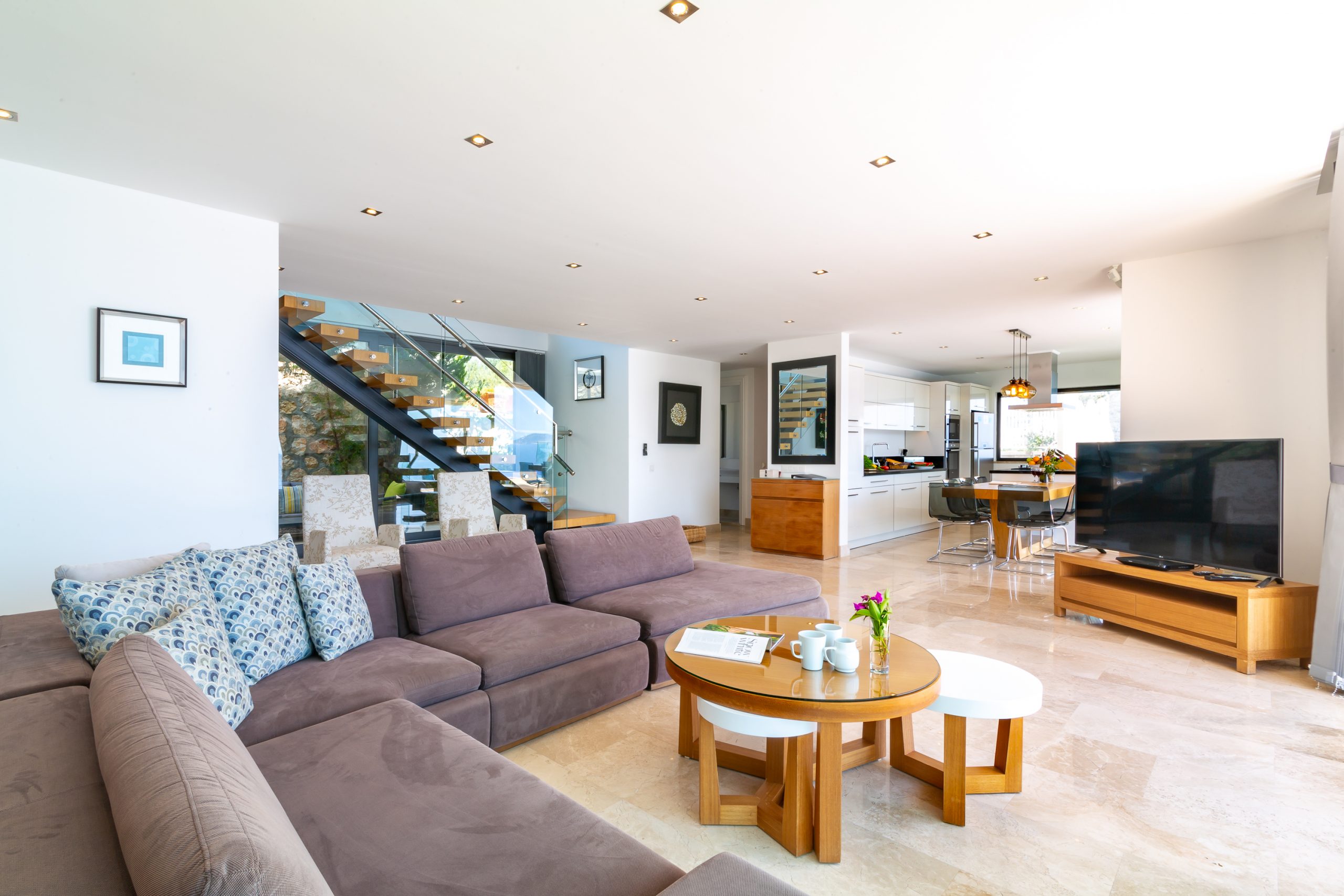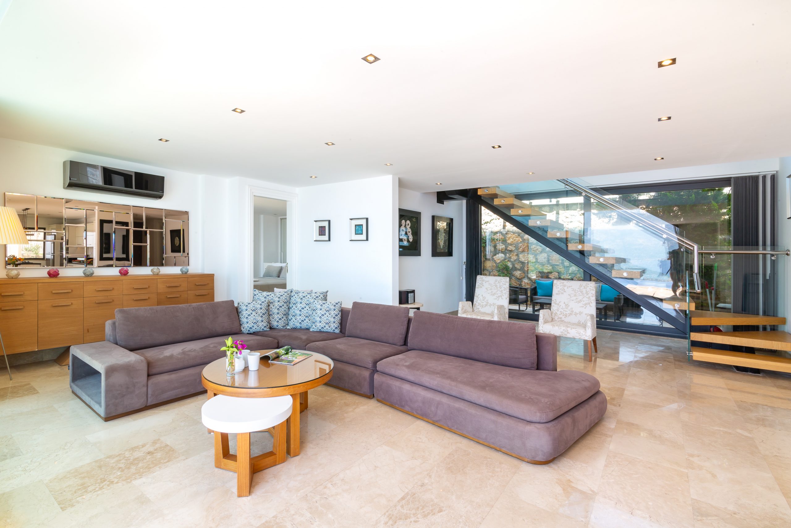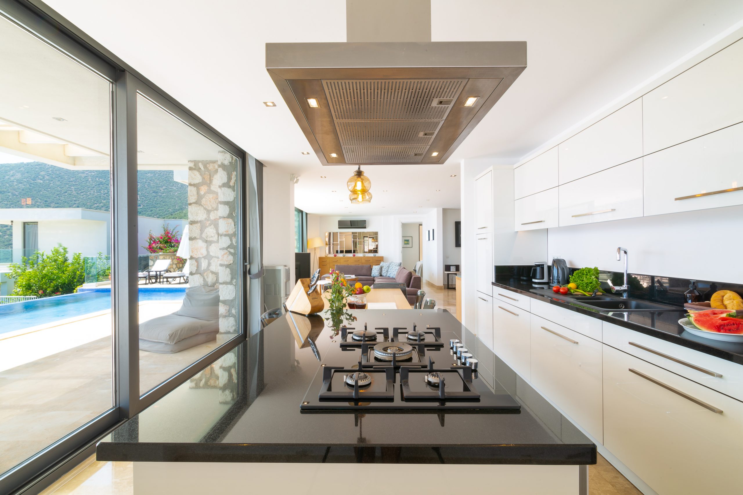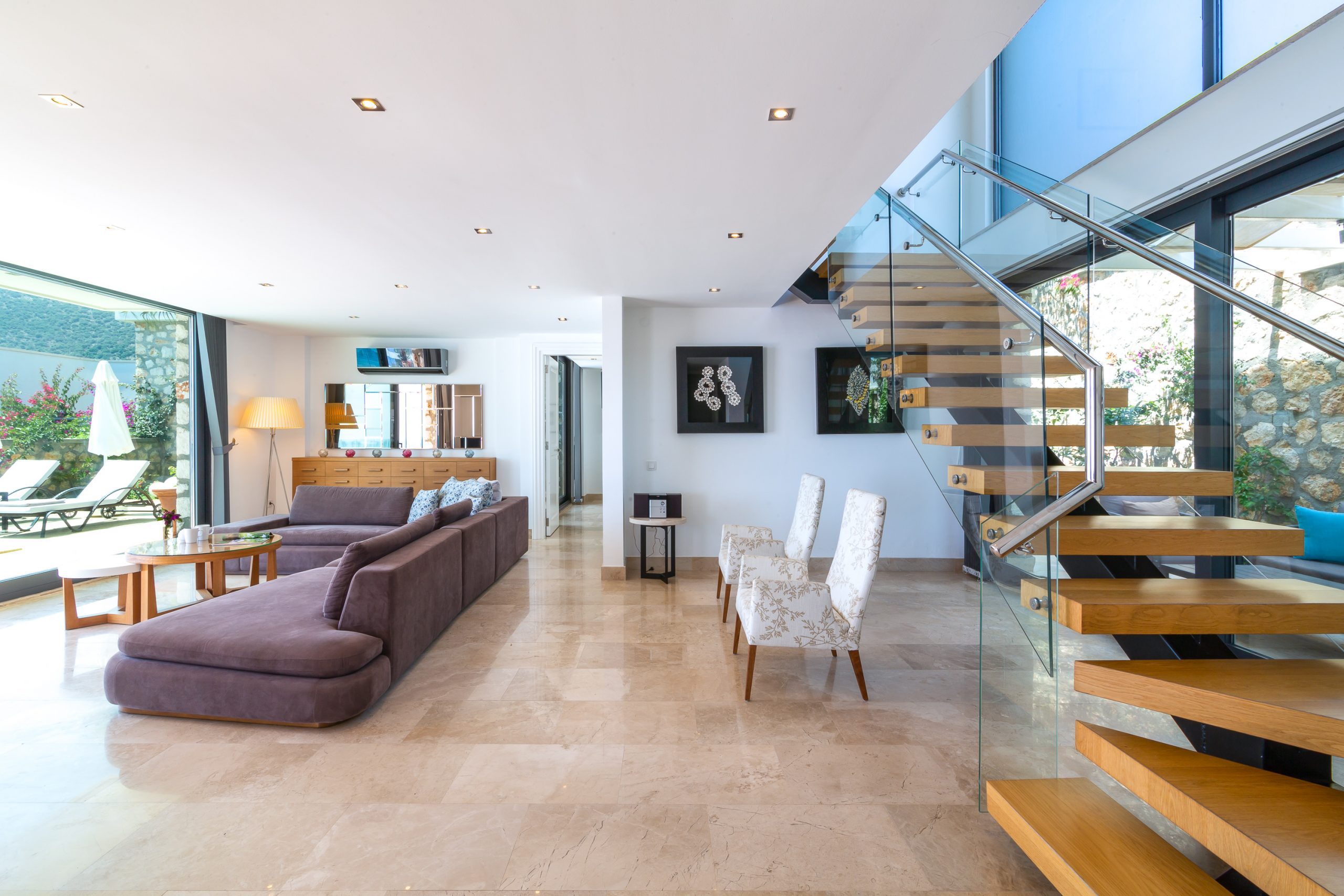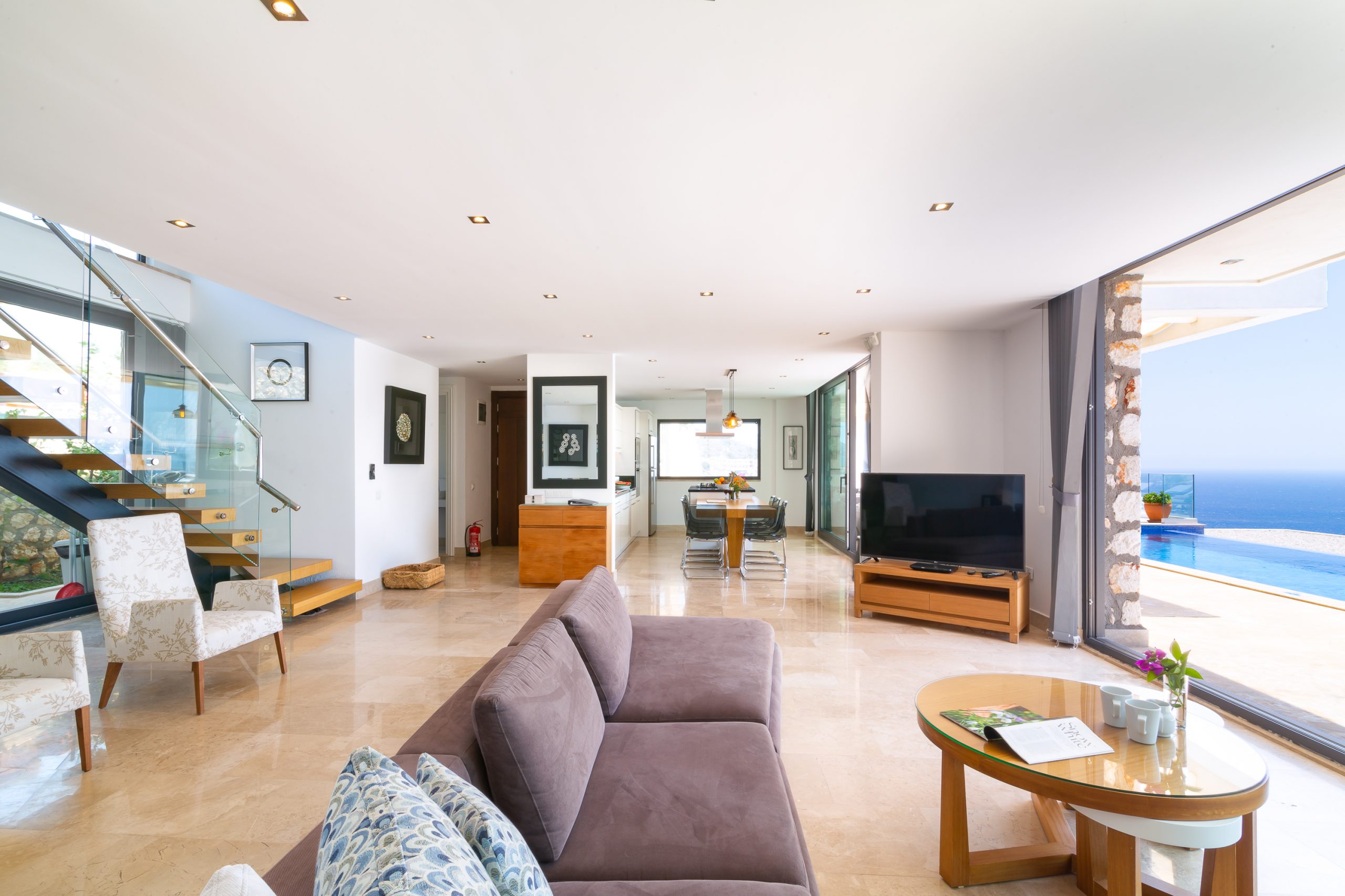 Villa Manzil’s architecture and interior design showcase modern elegance. On the ground floor, a bright and airy open-plan living room connects seamlessly with a fully fitted contemporary kitchen. Large sliding glass doors open directly onto the expansive pool terrace, where panoramic views of Kalamar Bay can be enjoyed throughout the day.