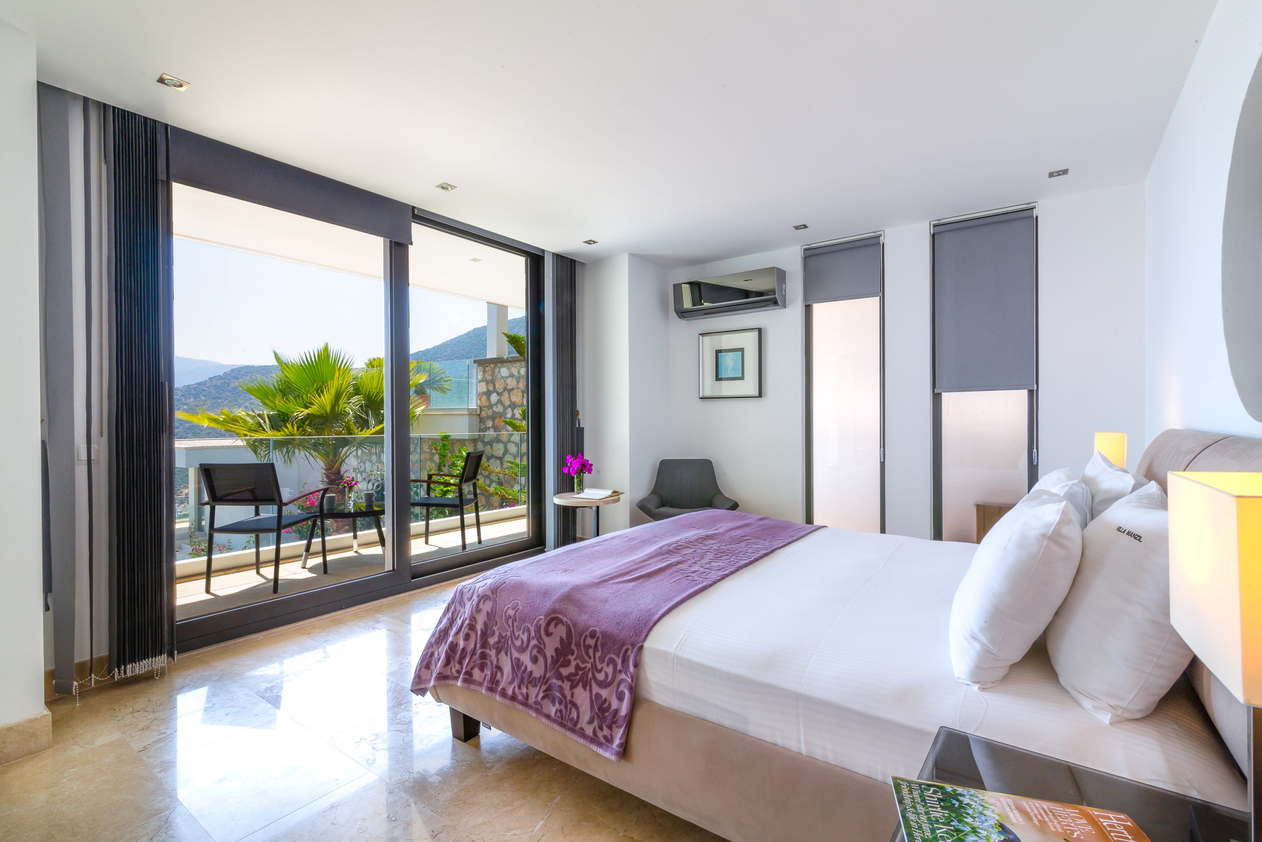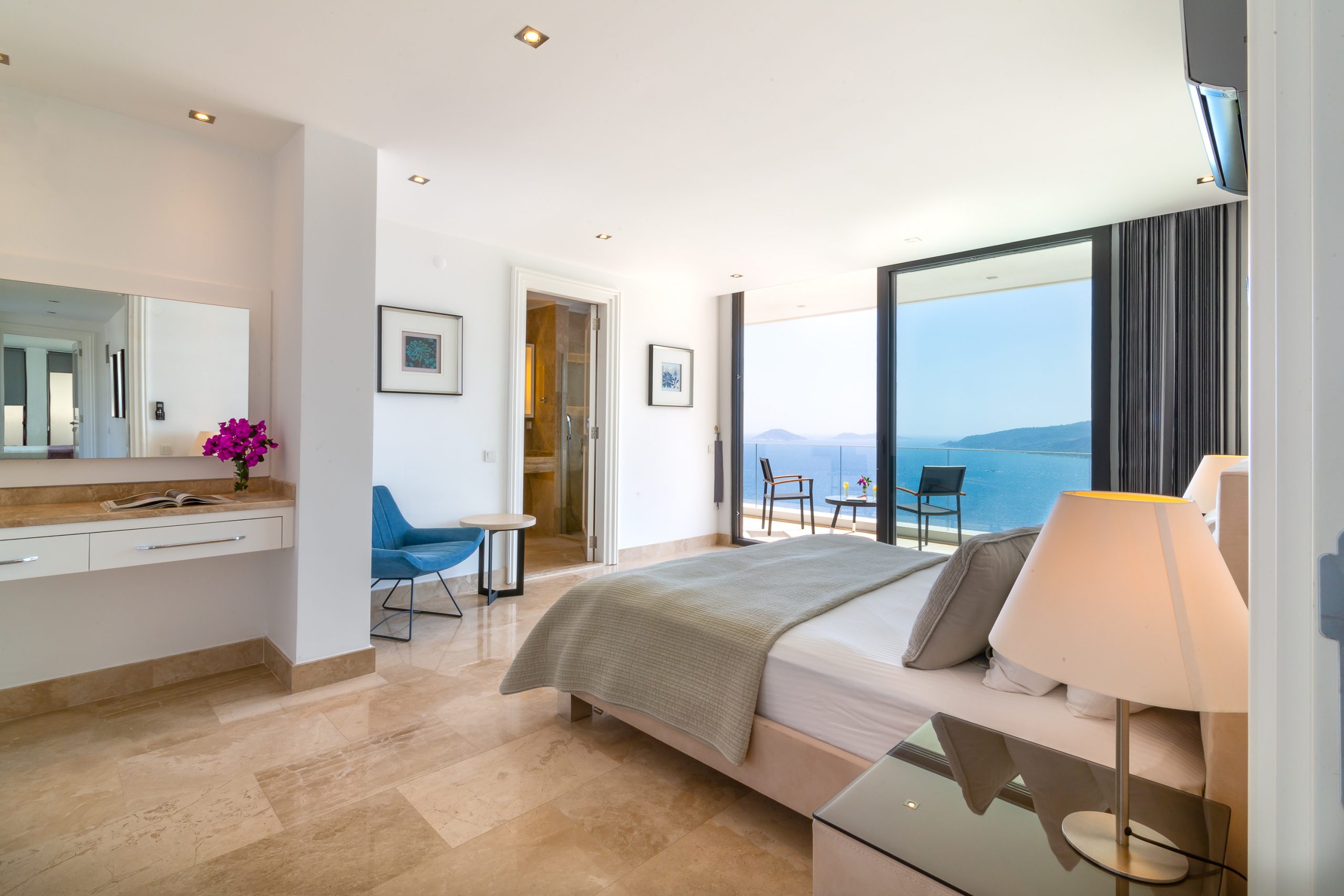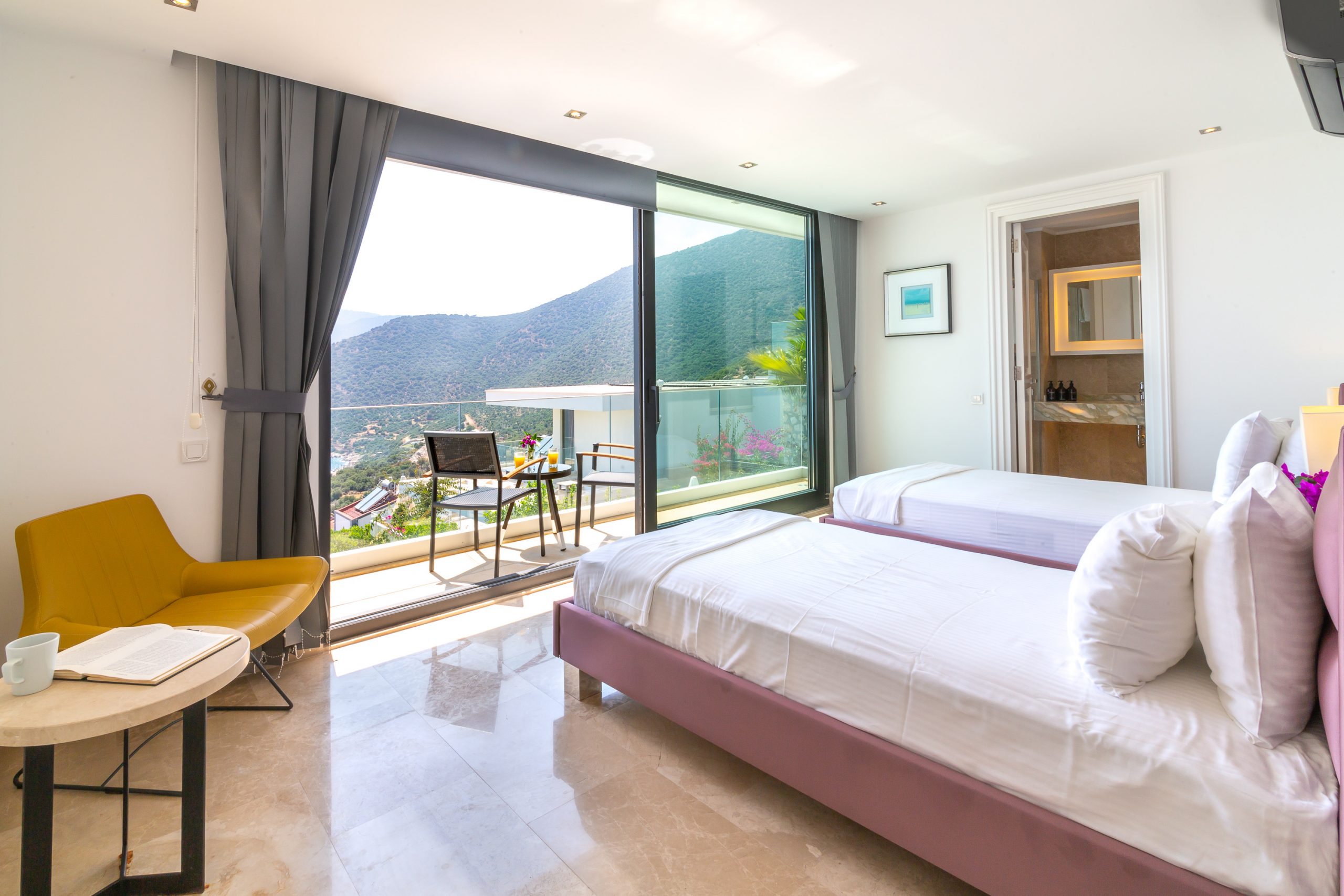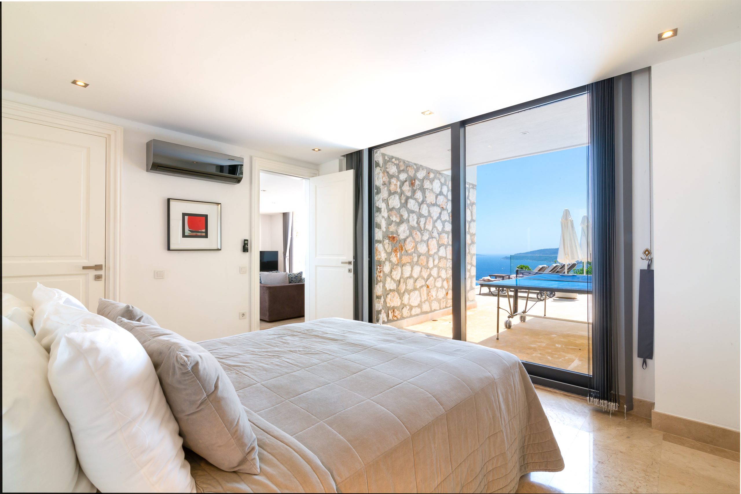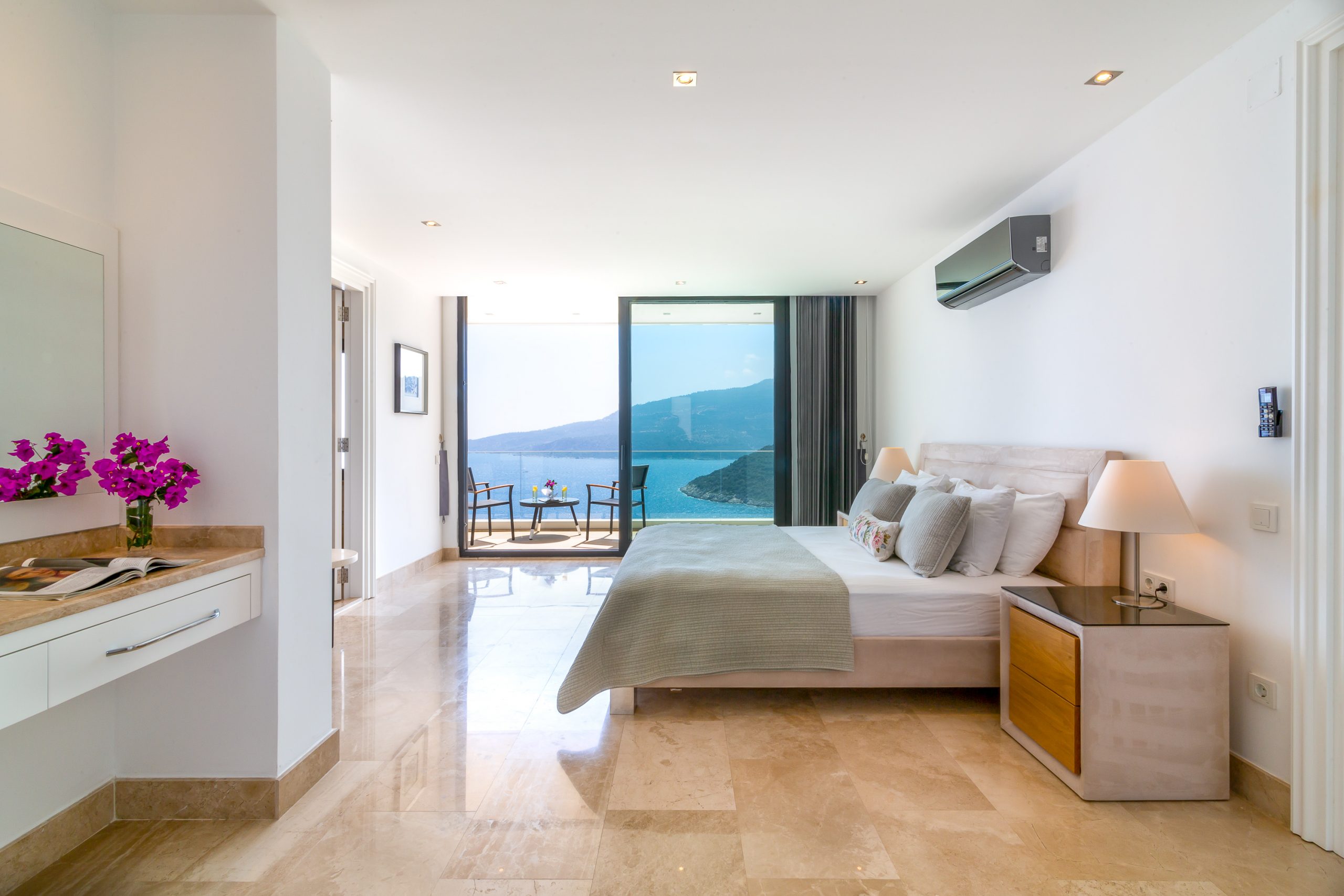 This luxury villa in Kalkan features five beautifully designed bedrooms, each with its own en-suite bathroom and air conditioning. On the first floor, there are three spacious bedrooms: two doubles and one twin. All open onto private balconies through large sliding doors, creating the perfect spot to enjoy a morning coffee while watching the sunrise over the bay.