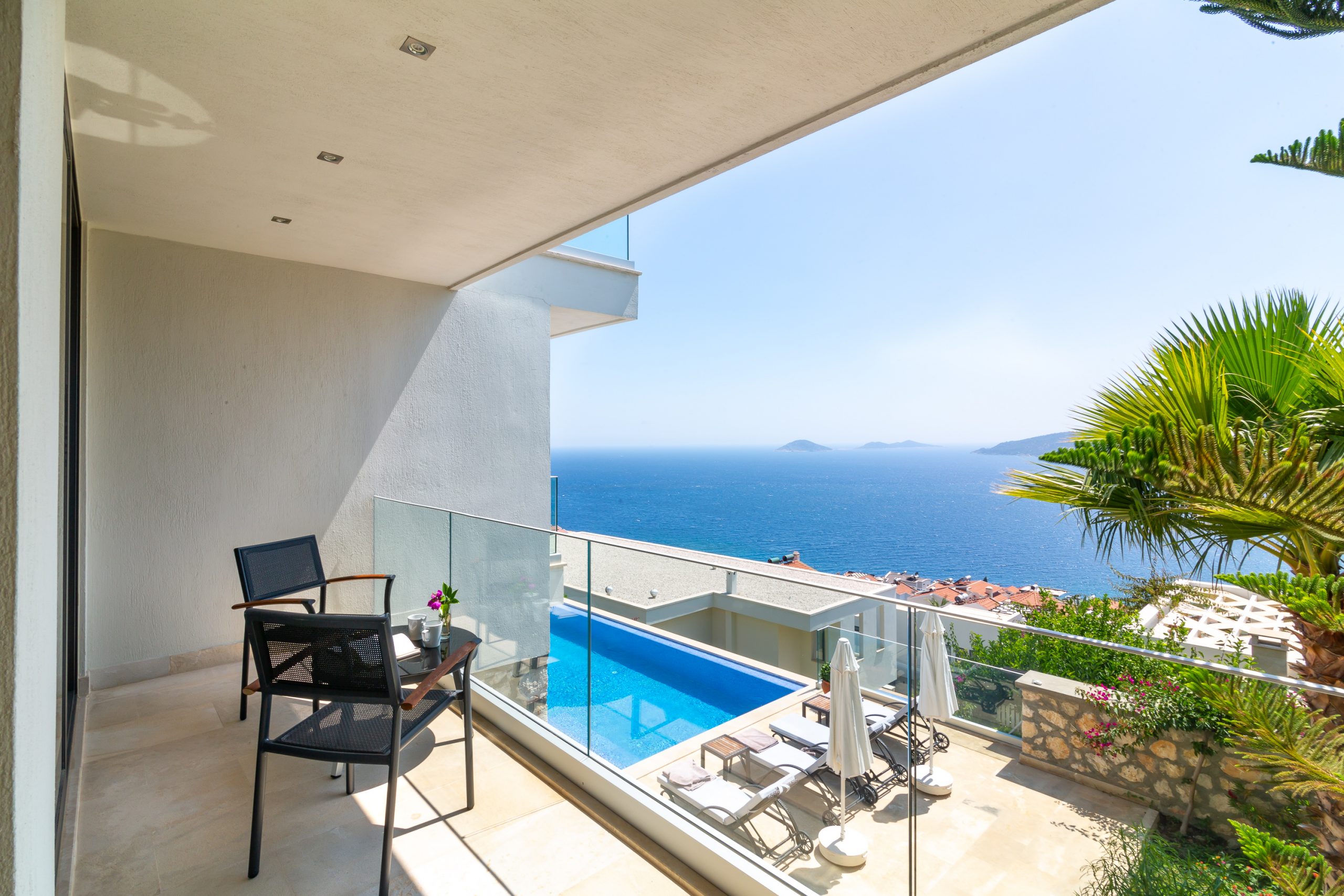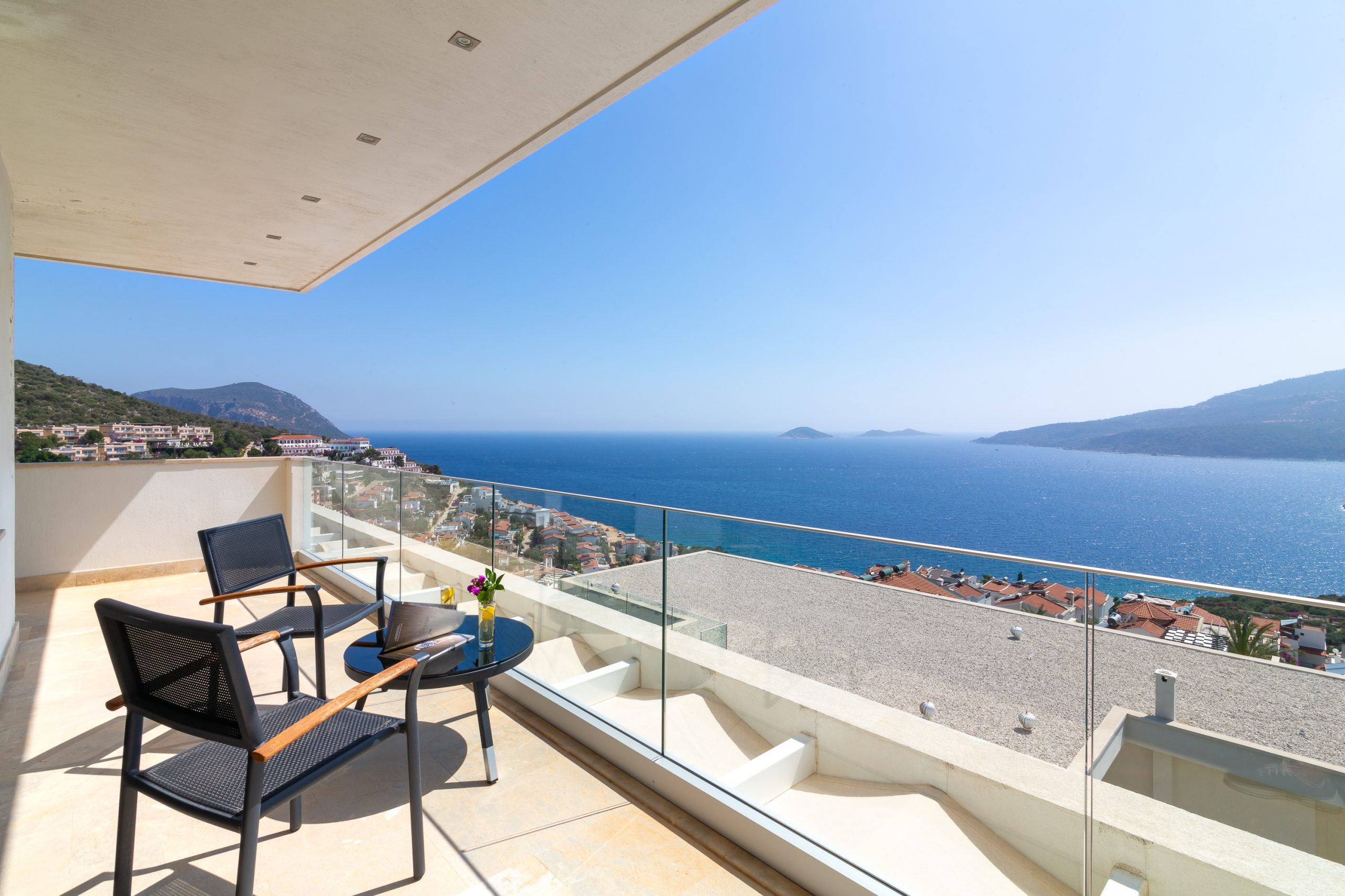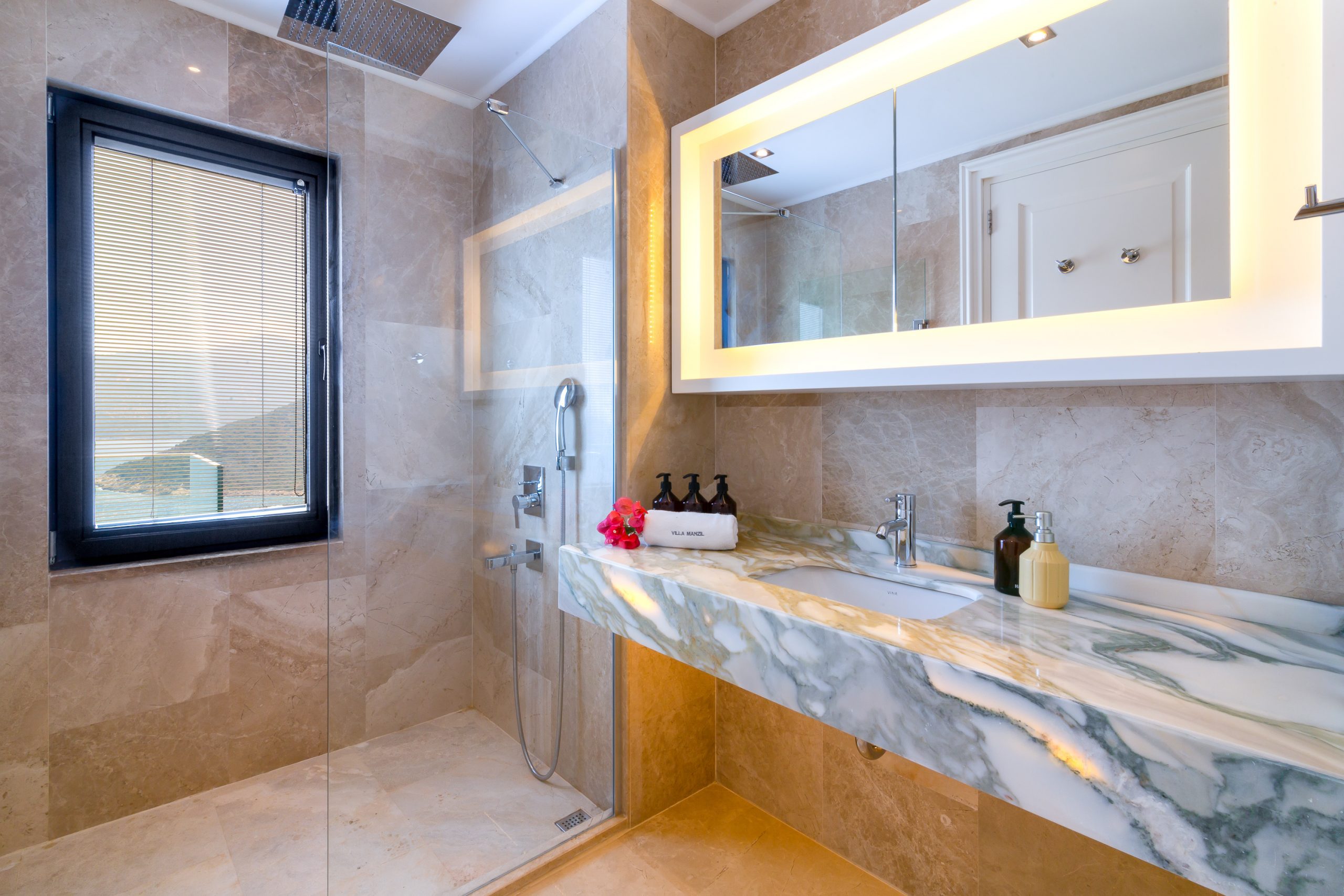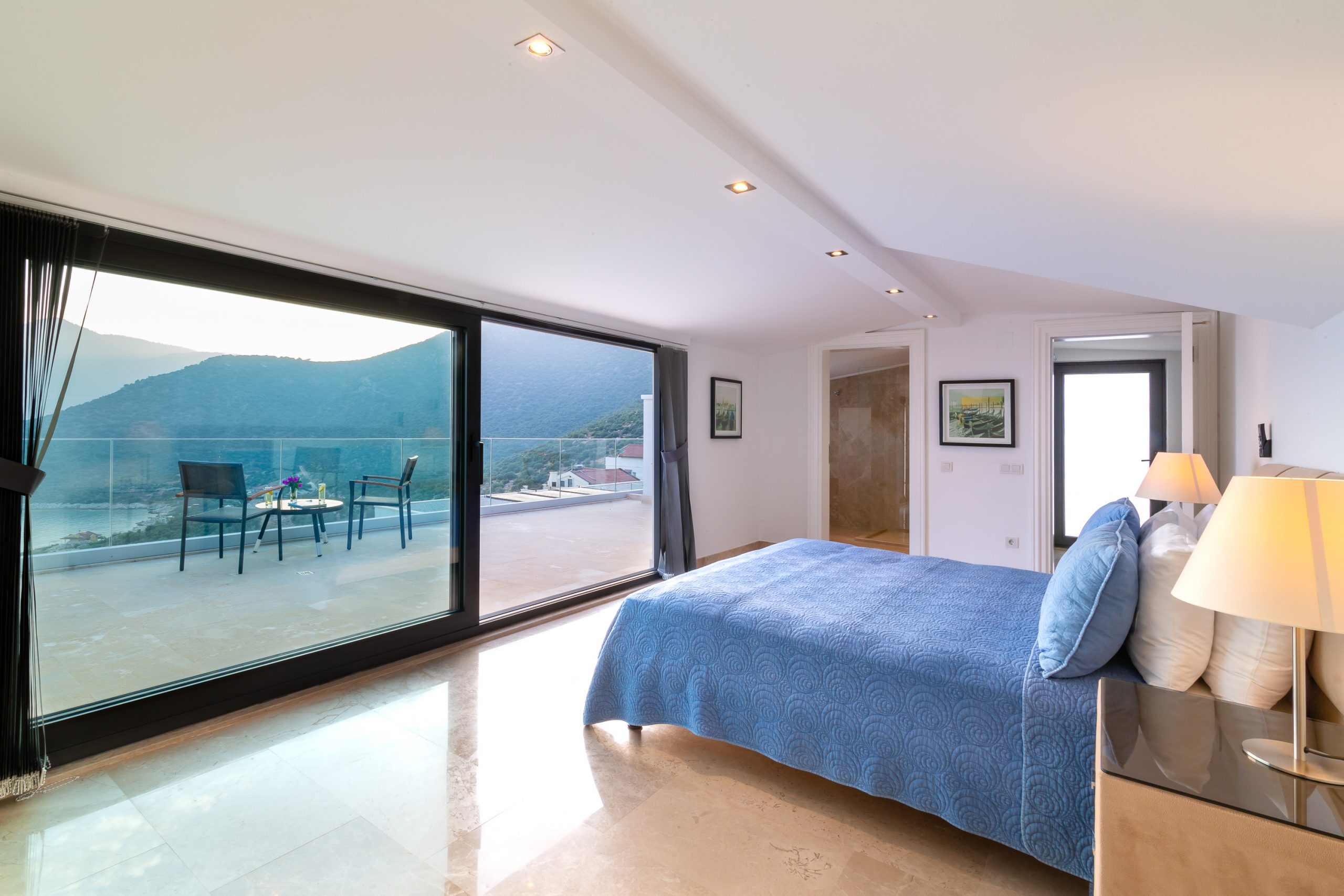 This luxury villa in Kalkan features five beautifully designed bedrooms, each with its own en-suite bathroom and air conditioning. On the first floor, there are three spacious bedrooms: two doubles and one twin. All open onto private balconies through large sliding doors, creating the perfect spot to enjoy a morning coffee while watching the sunrise over the bay.