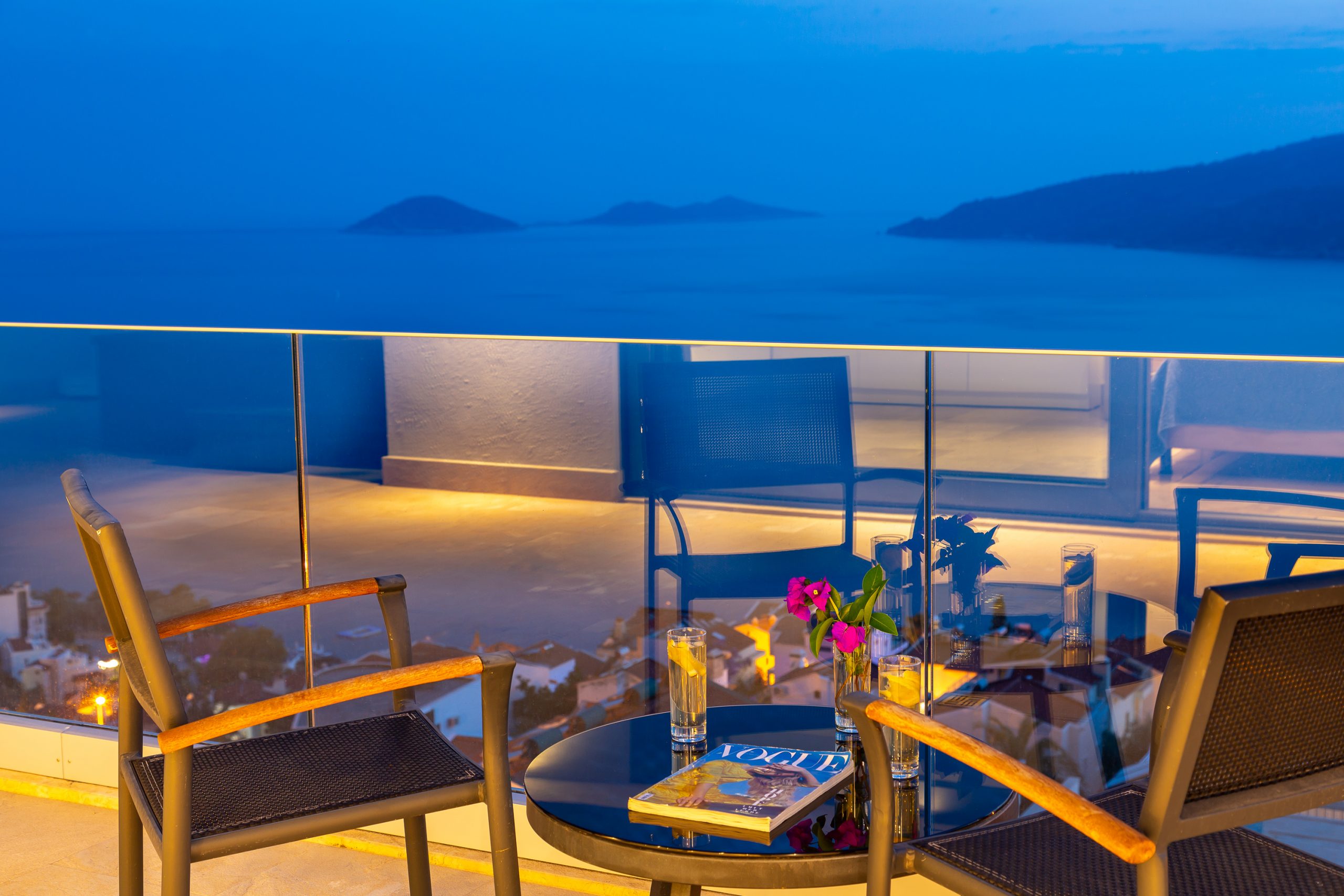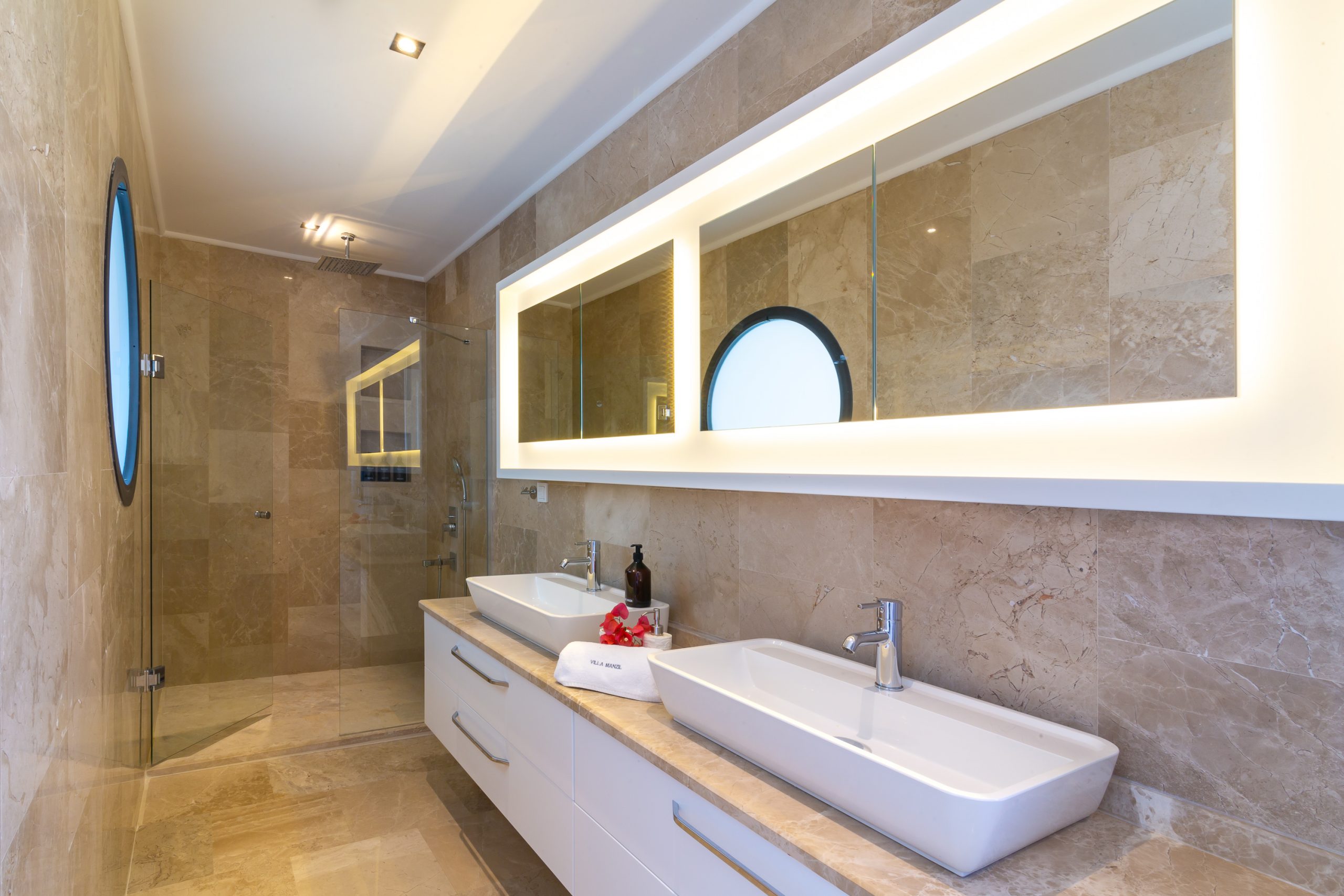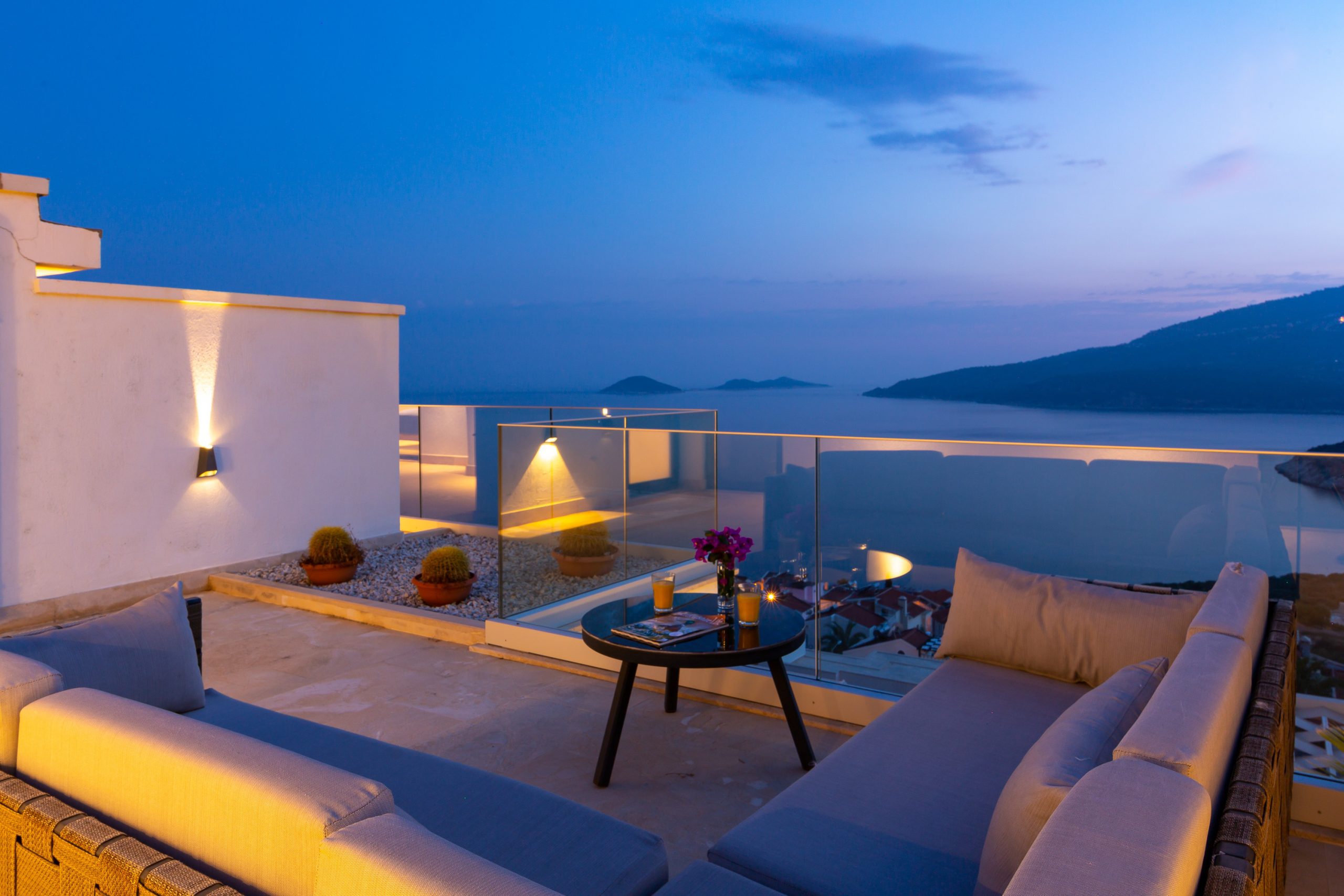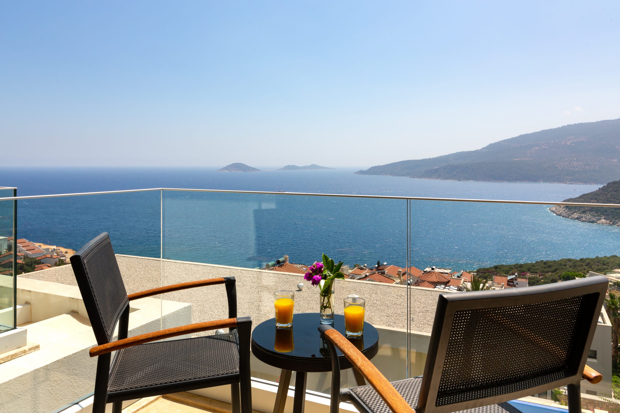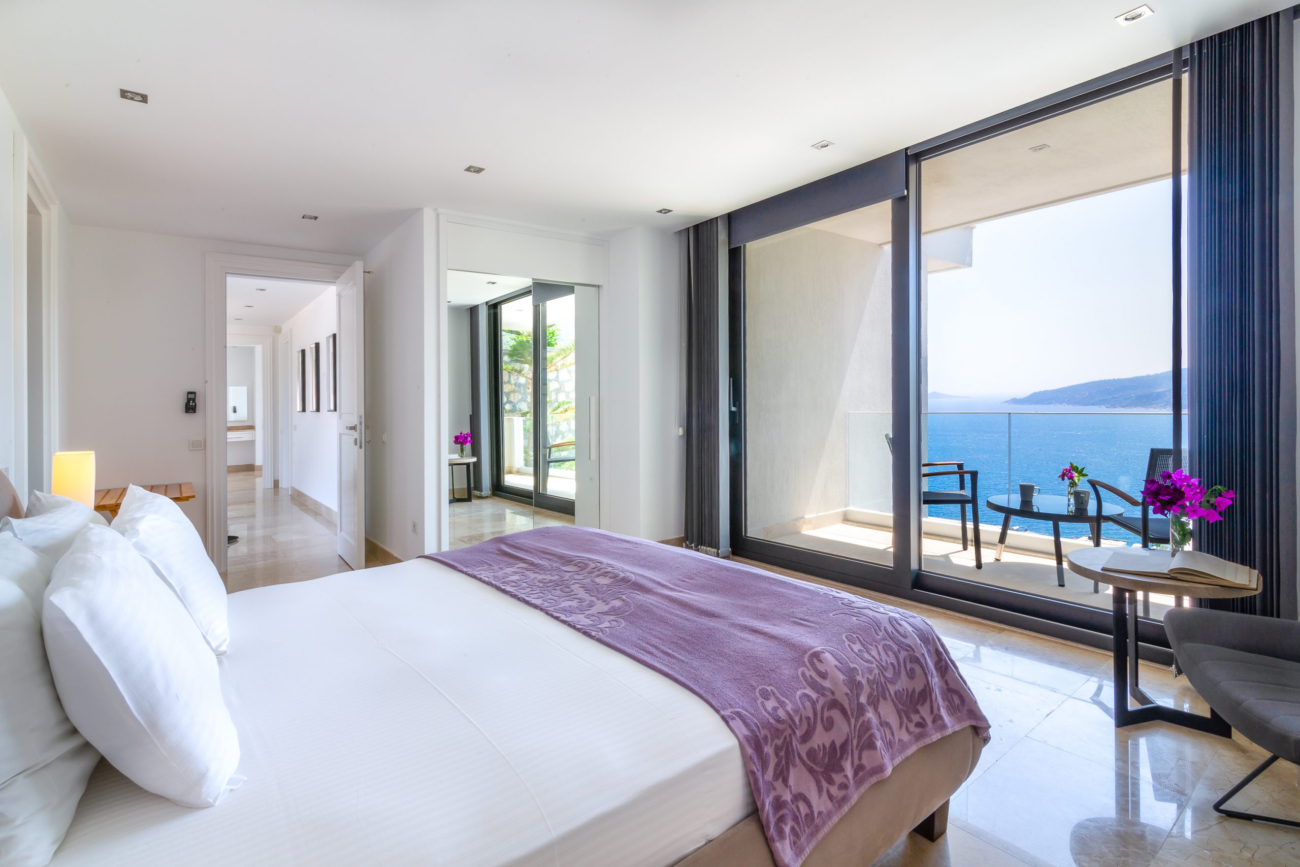 This luxury villa in Kalkan features five beautifully designed bedrooms, each with its own en-suite bathroom and air conditioning. On the first floor, there are three spacious bedrooms: two doubles and one twin. All open onto private balconies through large sliding doors, creating the perfect spot to enjoy a morning coffee while watching the sunrise over the bay.