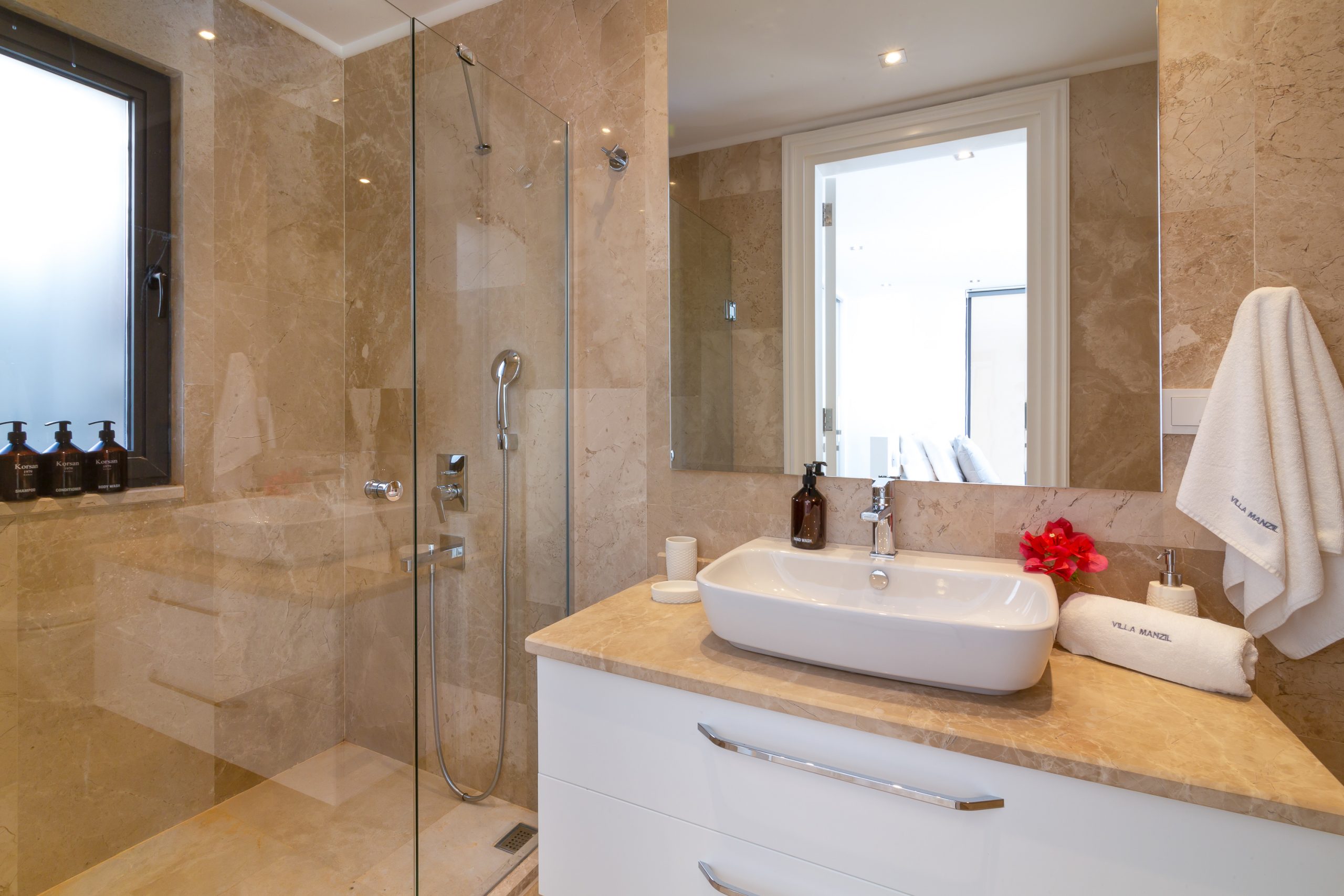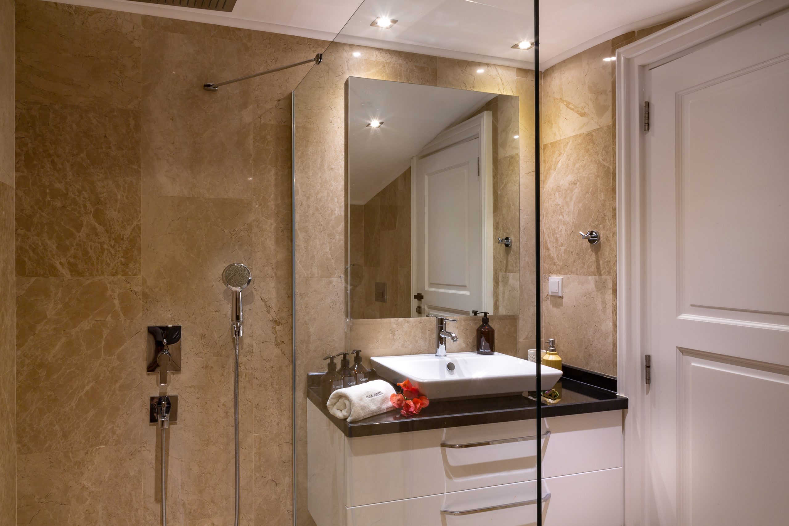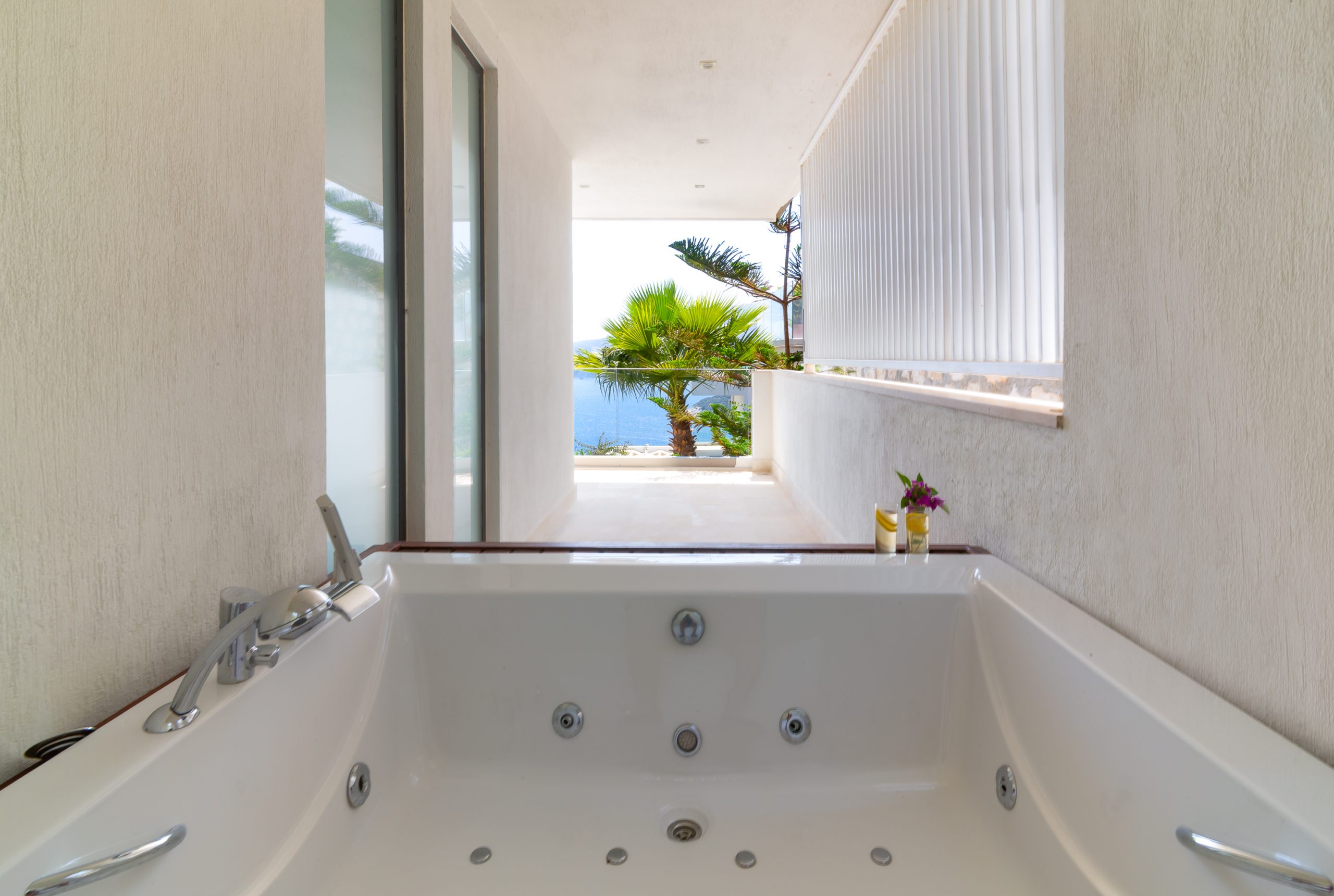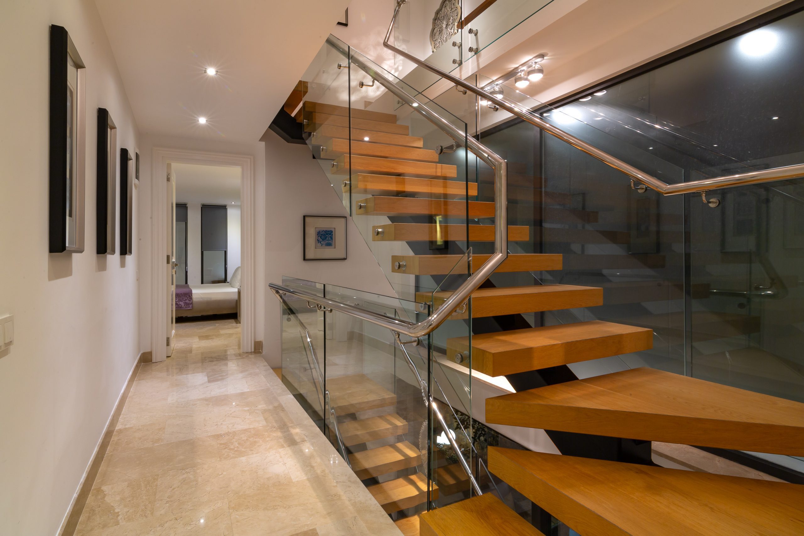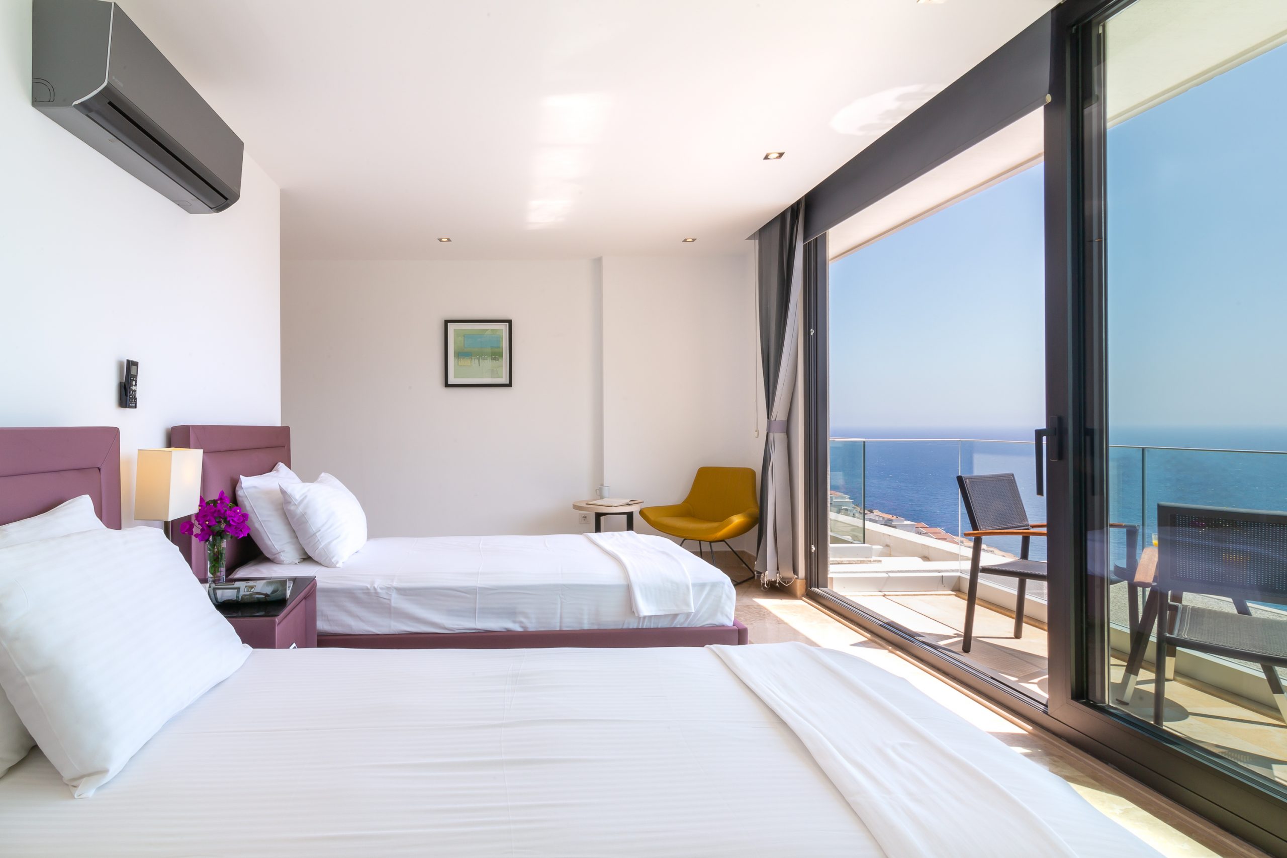 This luxury villa in Kalkan features five beautifully designed bedrooms, each with its own en-suite bathroom and air conditioning. On the first floor, there are three spacious bedrooms: two doubles and one twin. All open onto private balconies through large sliding doors, creating the perfect spot to enjoy a morning coffee while watching the sunrise over the bay.