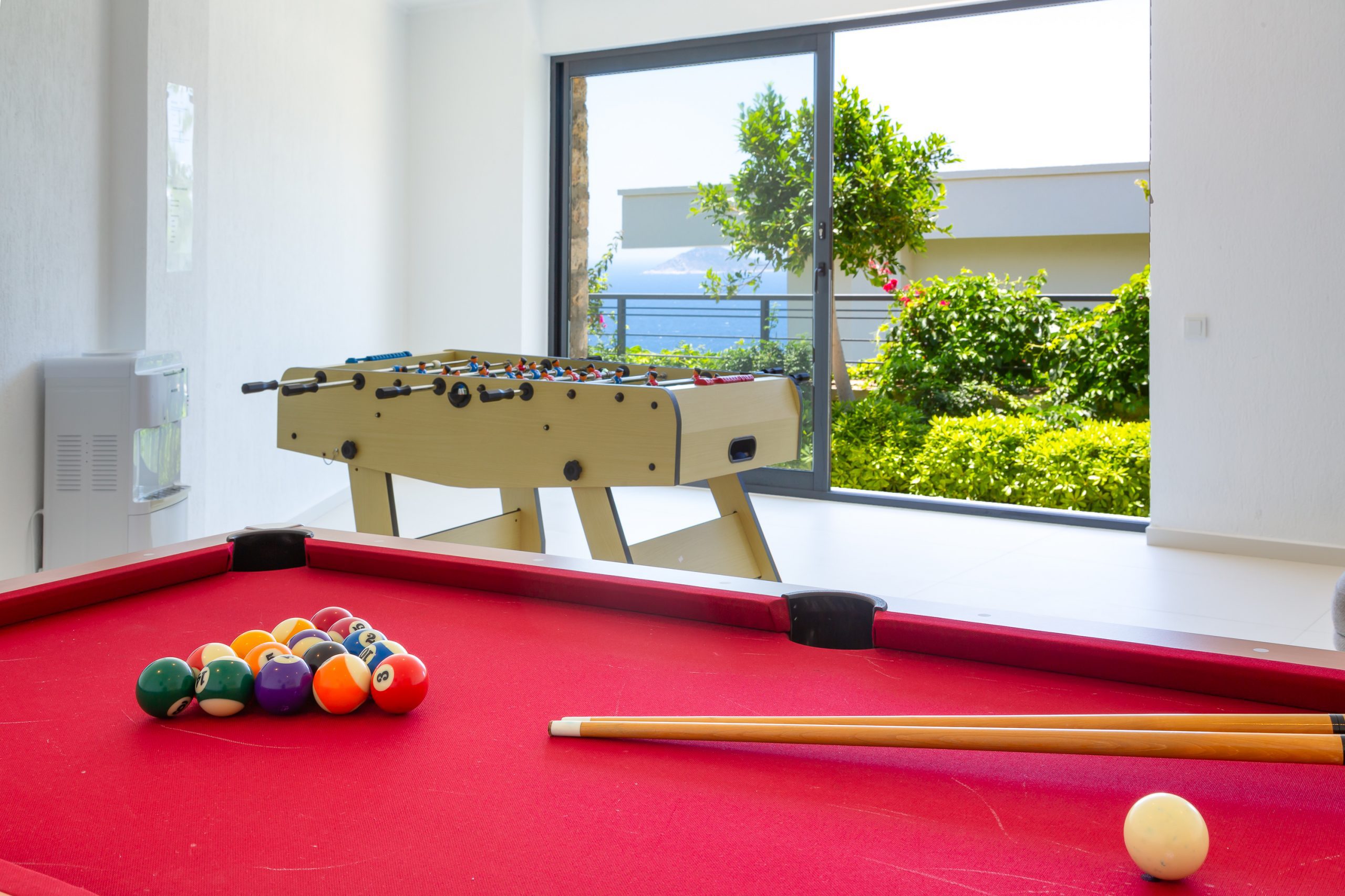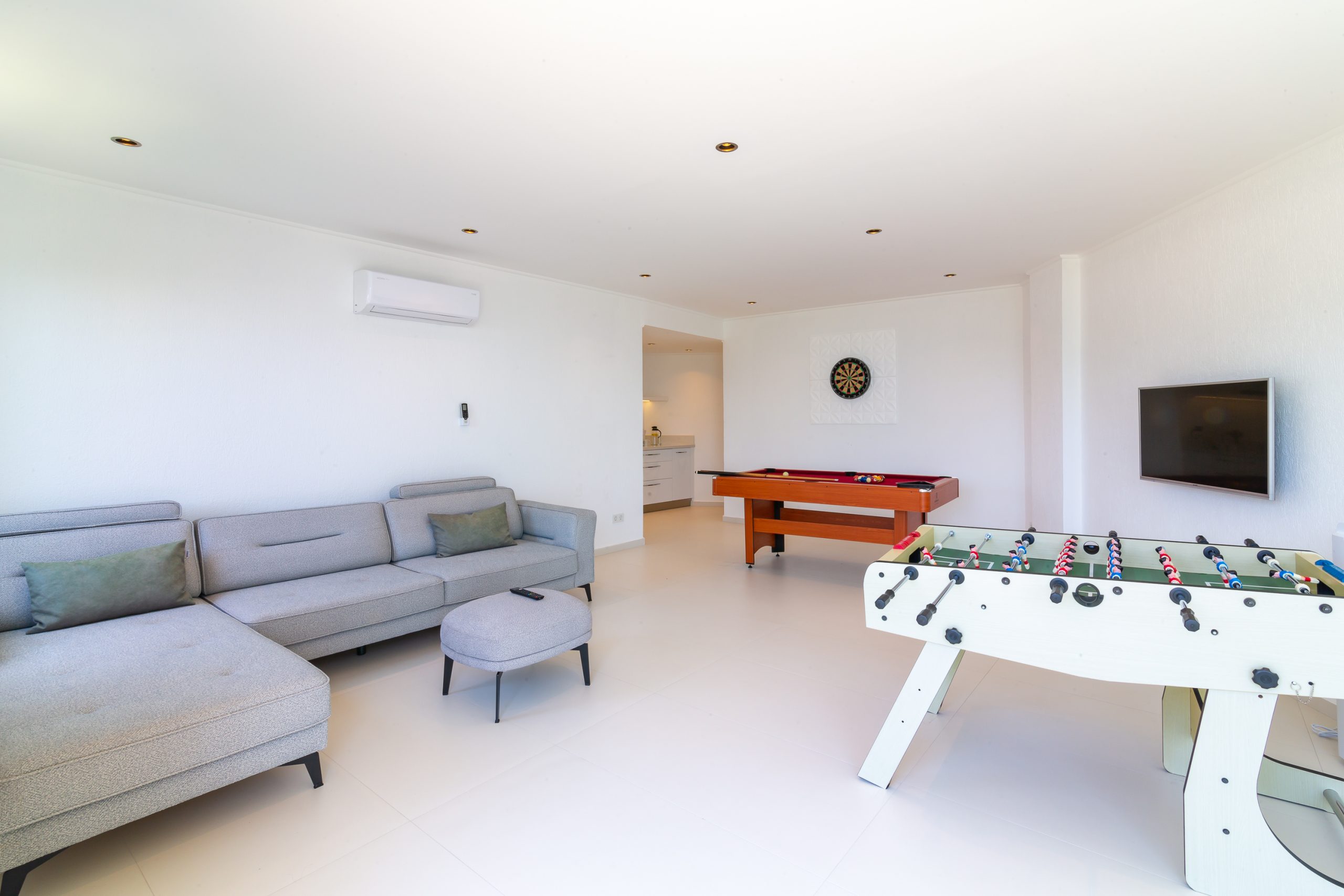 One of Villa Manzil’s most appealing features is its self-contained games room, located below the pool terrace. This versatile space includes a comfortable sofa, television, kitchenette, and WC, making it a perfect retreat for older children or teenagers. Guests can enjoy billiards, table football, or darts – a great way to spend time away from the midday heat.