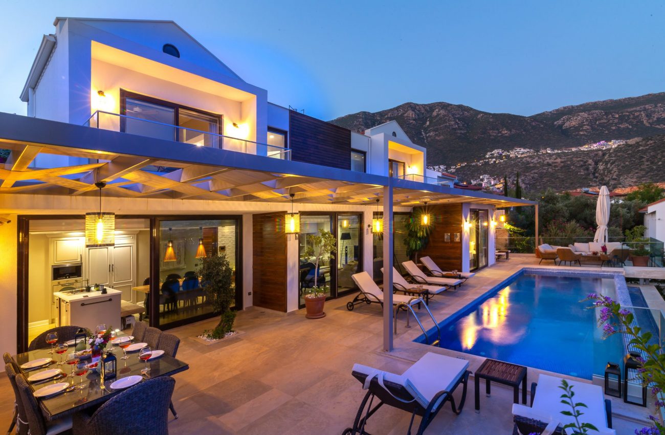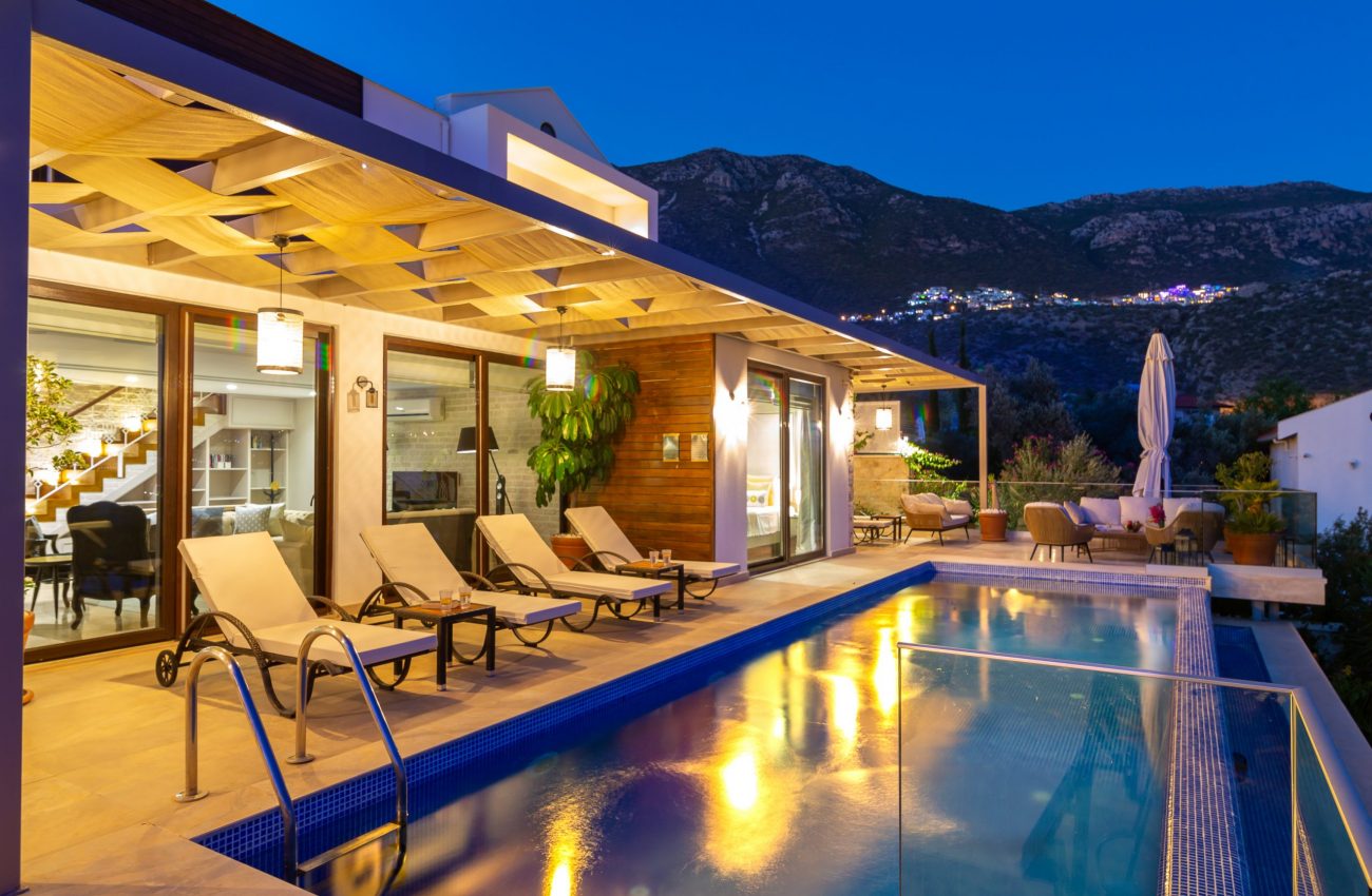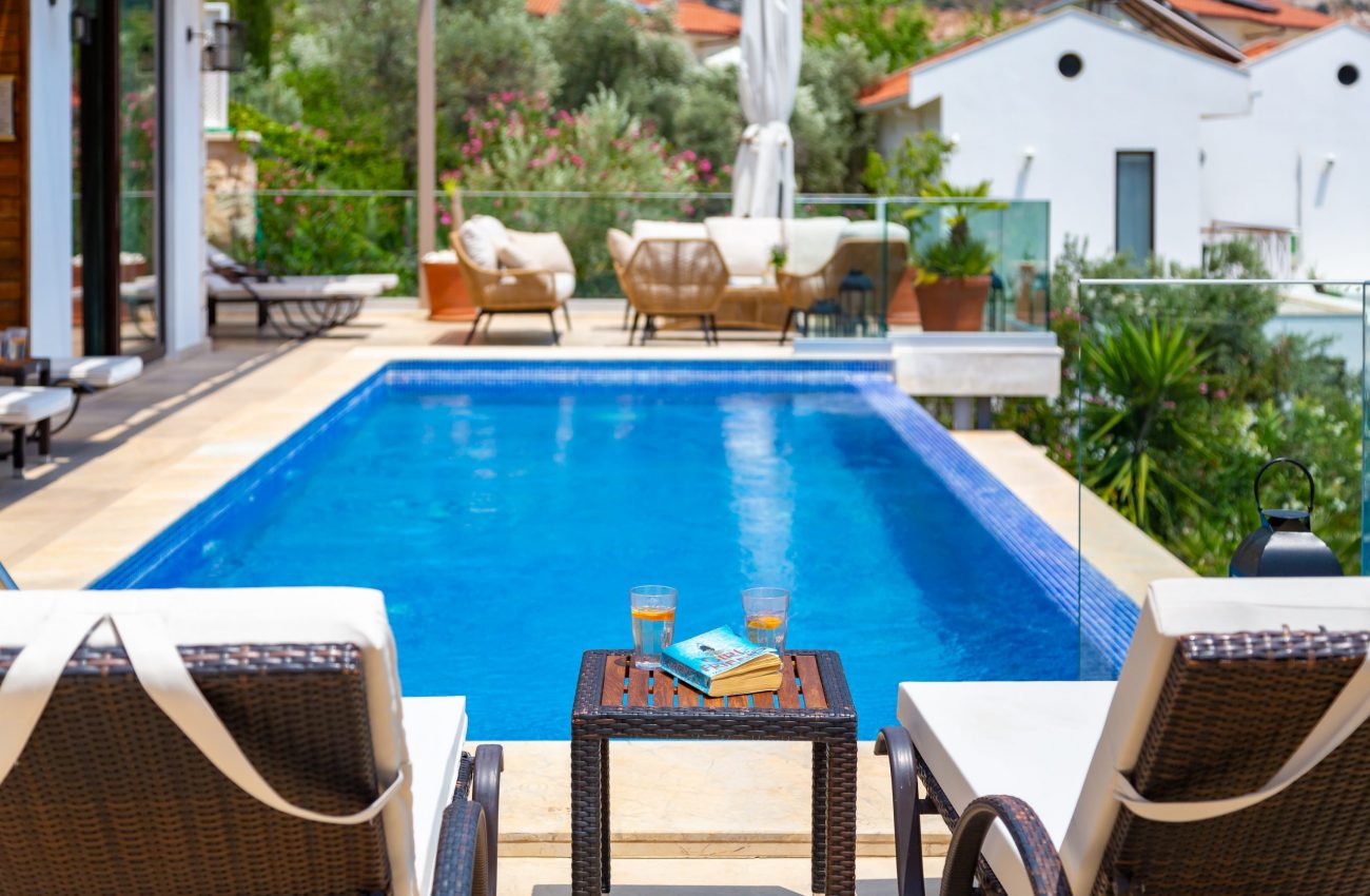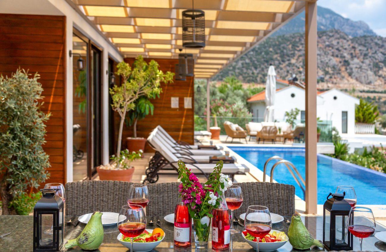 A flight of steps from the parking area take you to the villa entrance. On the ground floor there is a large open plan living room, dining area and fully equipped kitchen with large sliding doors opening onto the pool terrace.