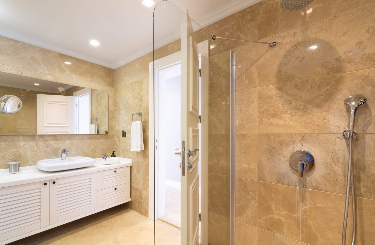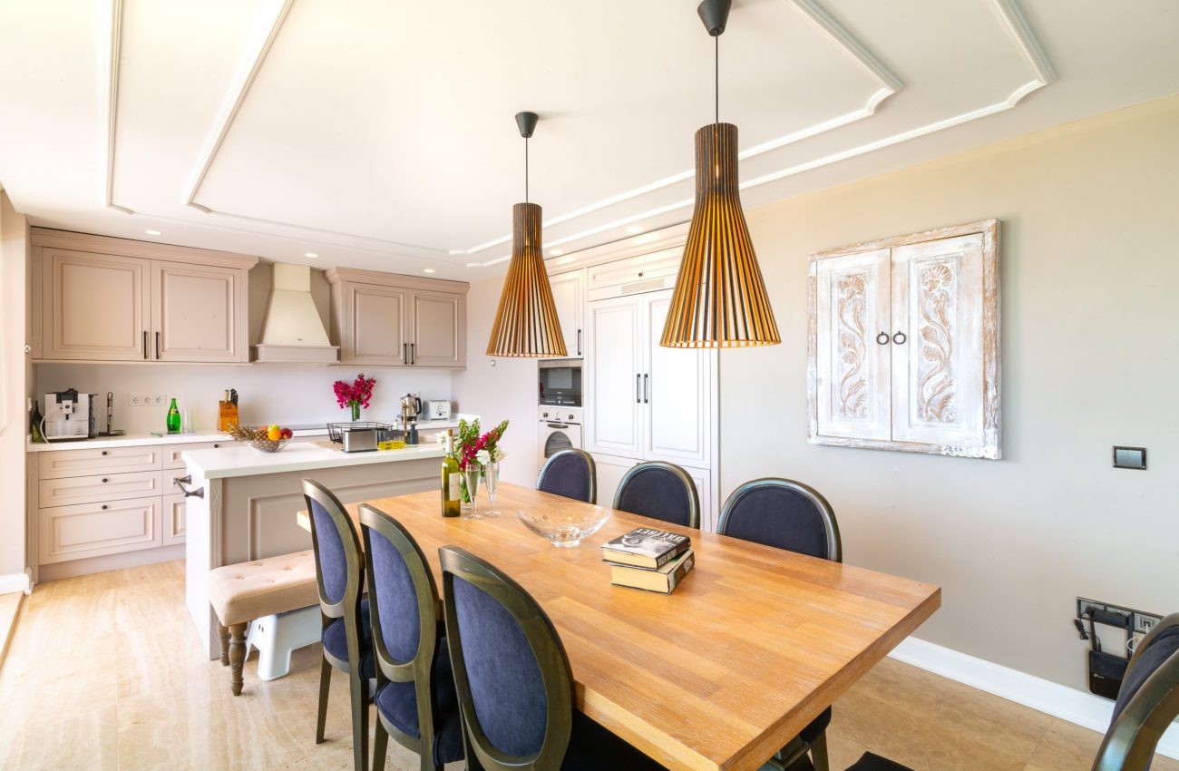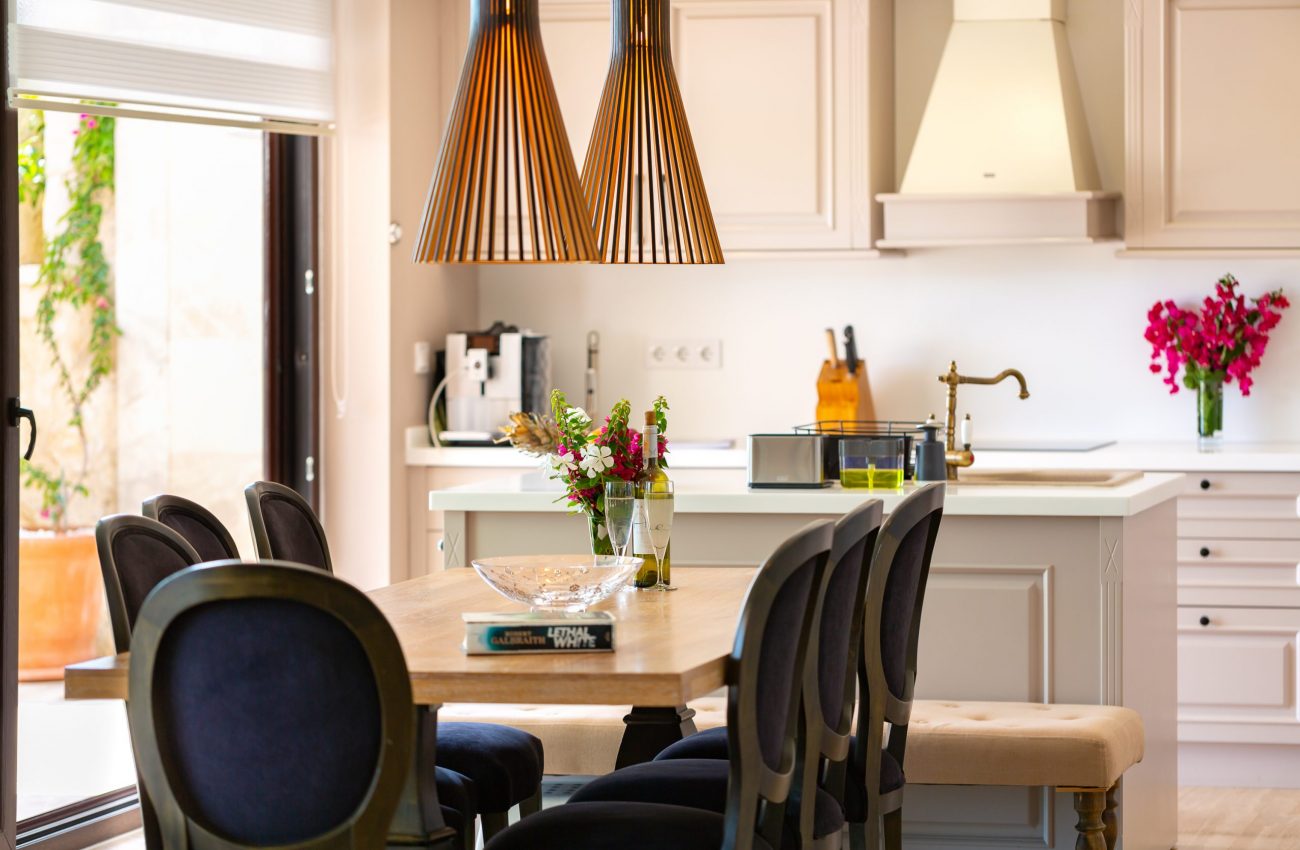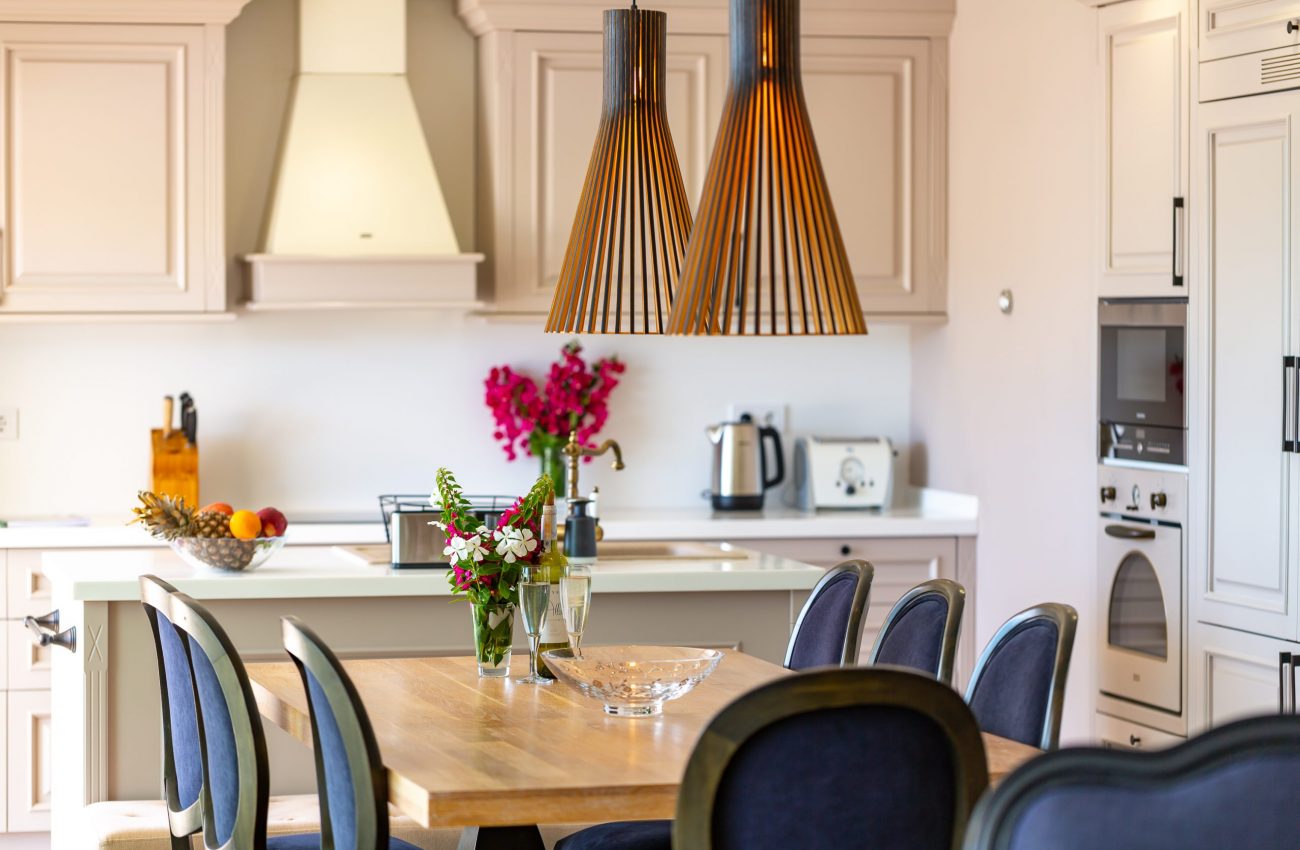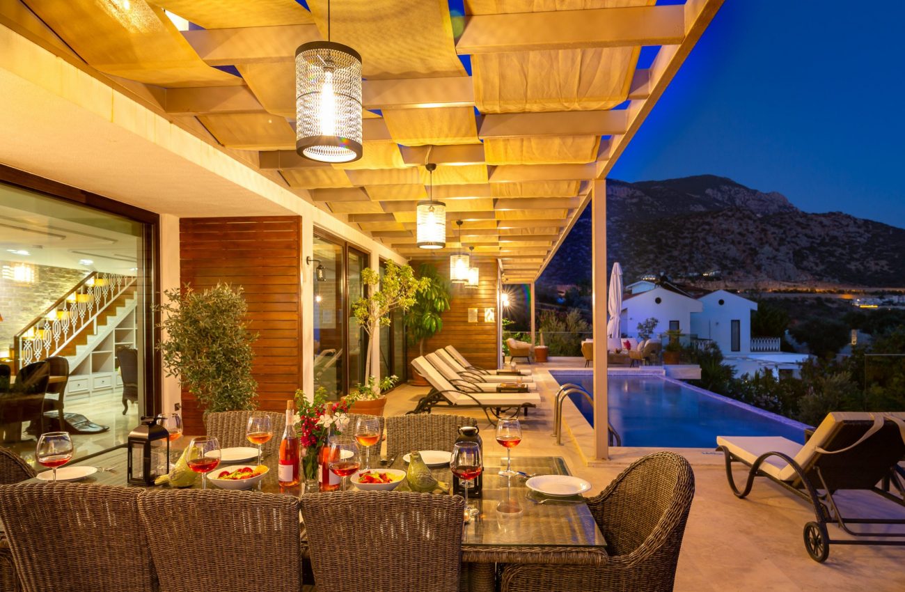 A flight of steps from the parking area take you to the villa entrance. On the ground floor there is a large open plan living room, dining area and fully equipped kitchen with large sliding doors opening onto the pool terrace.