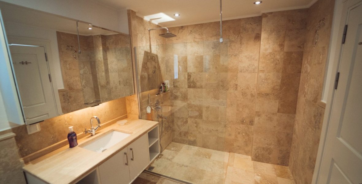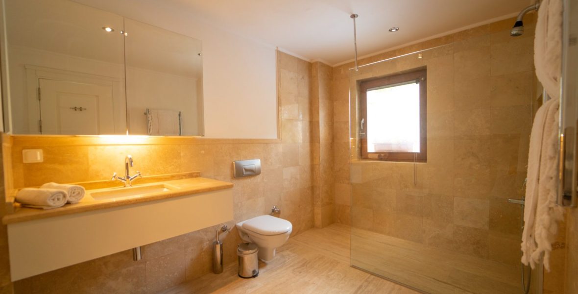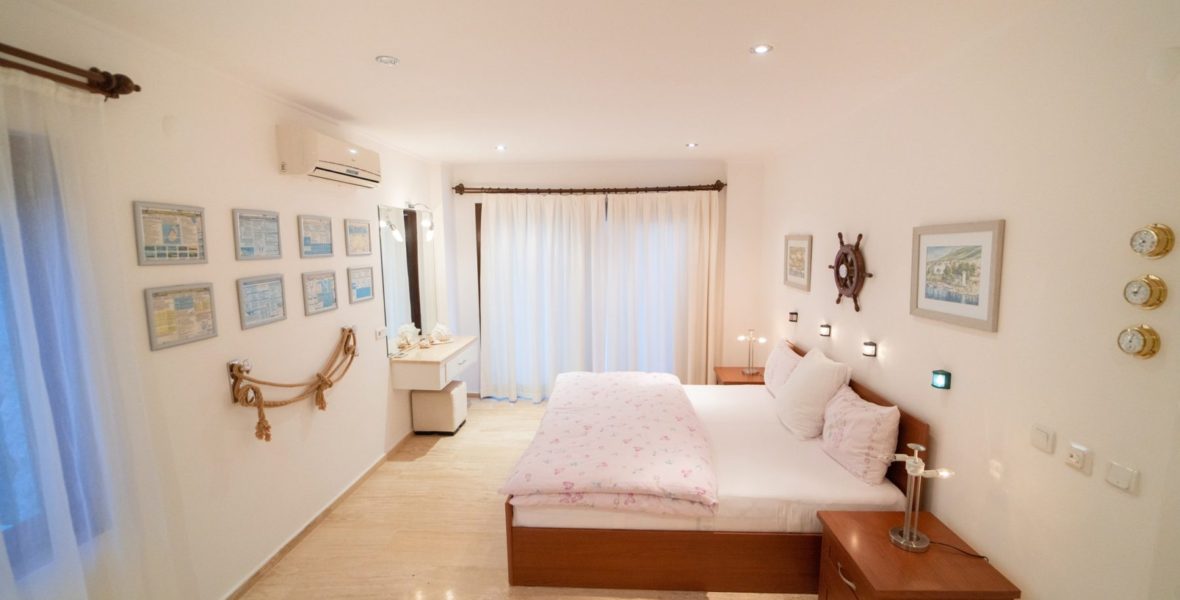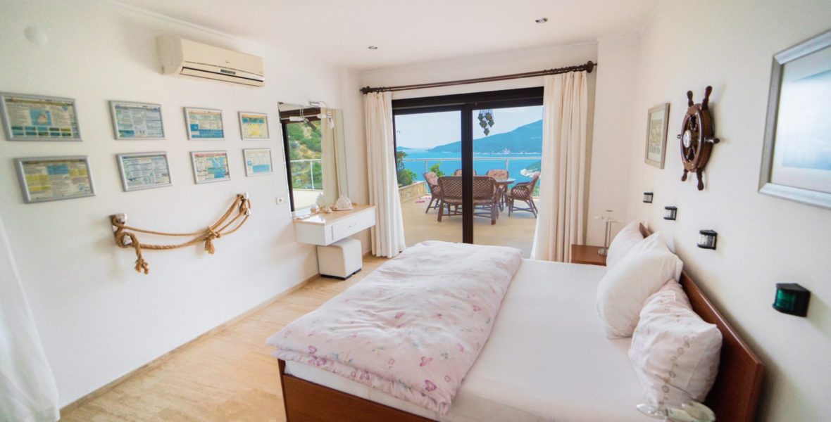 On the entrance level, there is a large double bedroom with an en-suite shower room, ideal for guests preferring the main floor. The upper floors house additional bedrooms, each designed for relaxation. Many rooms open onto private balconies, where guests can enjoy their morning coffee with breathtaking sea views. Comfortable beds, stylish interiors, and abundant natural light ensure every bedroom feels like a private retreat.
