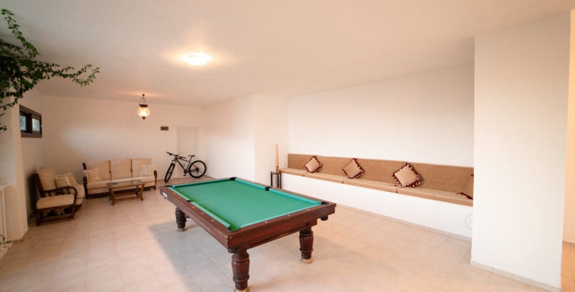 The outdoor areas of Villa Summer Breeze are just as impressive as the interiors. A private swimming pool with sun loungers and parasols offers the perfect spot to relax under the Mediterranean sun. The spacious pool terrace also includes shaded areas for outdoor dining and a barbecue, making it ideal for evening meals with family and friends. Watching the sunset over Kalamar Bay from the pool terrace is a truly unforgettable experience.